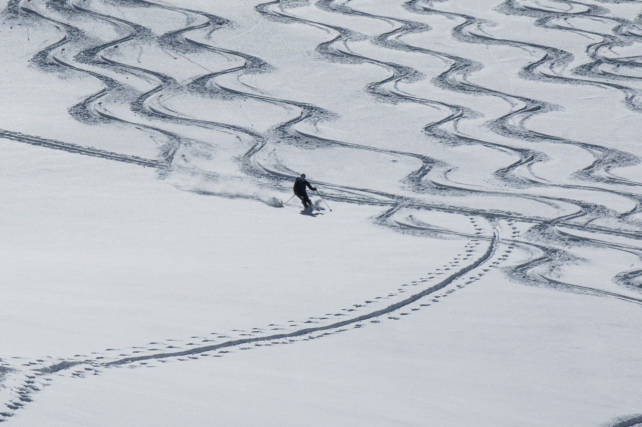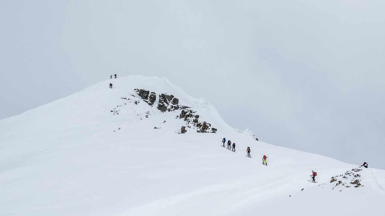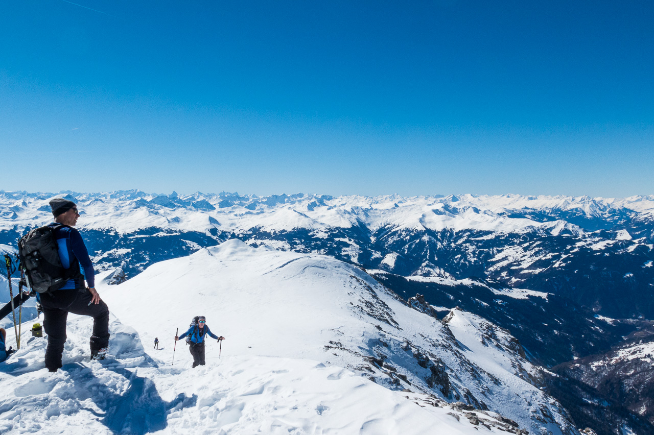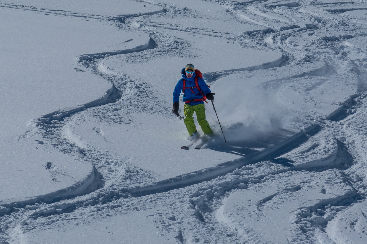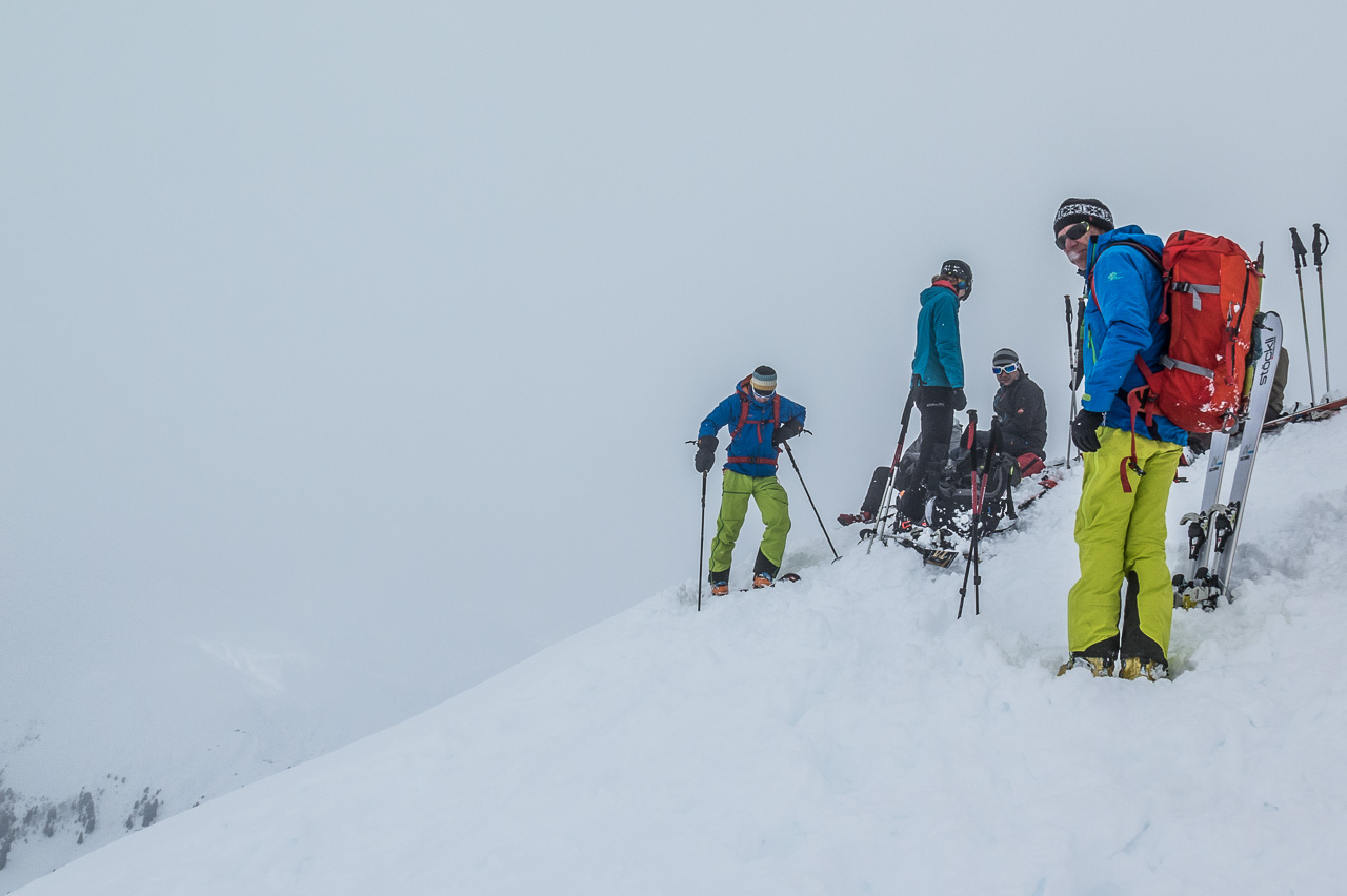 Der Wind kommt nur böenartig, dazwischen ist es sogar windstill, so dass wir eine ganze Weile das Gipfelmeer geniessen können. Aber jetzt ist Zeit für die Abfahrt. Die obersten Meter sind noch, na ja, leicht windgepresst. Aber schon kurz danach: Oh làlà! Pulverschnee vom Feinsten! Es gibt genug, der Hang ist praktisch unverfahren. Überall Juchzer, jeder hat ein Grinsen im Gesicht. Und das war erst der Anfang!