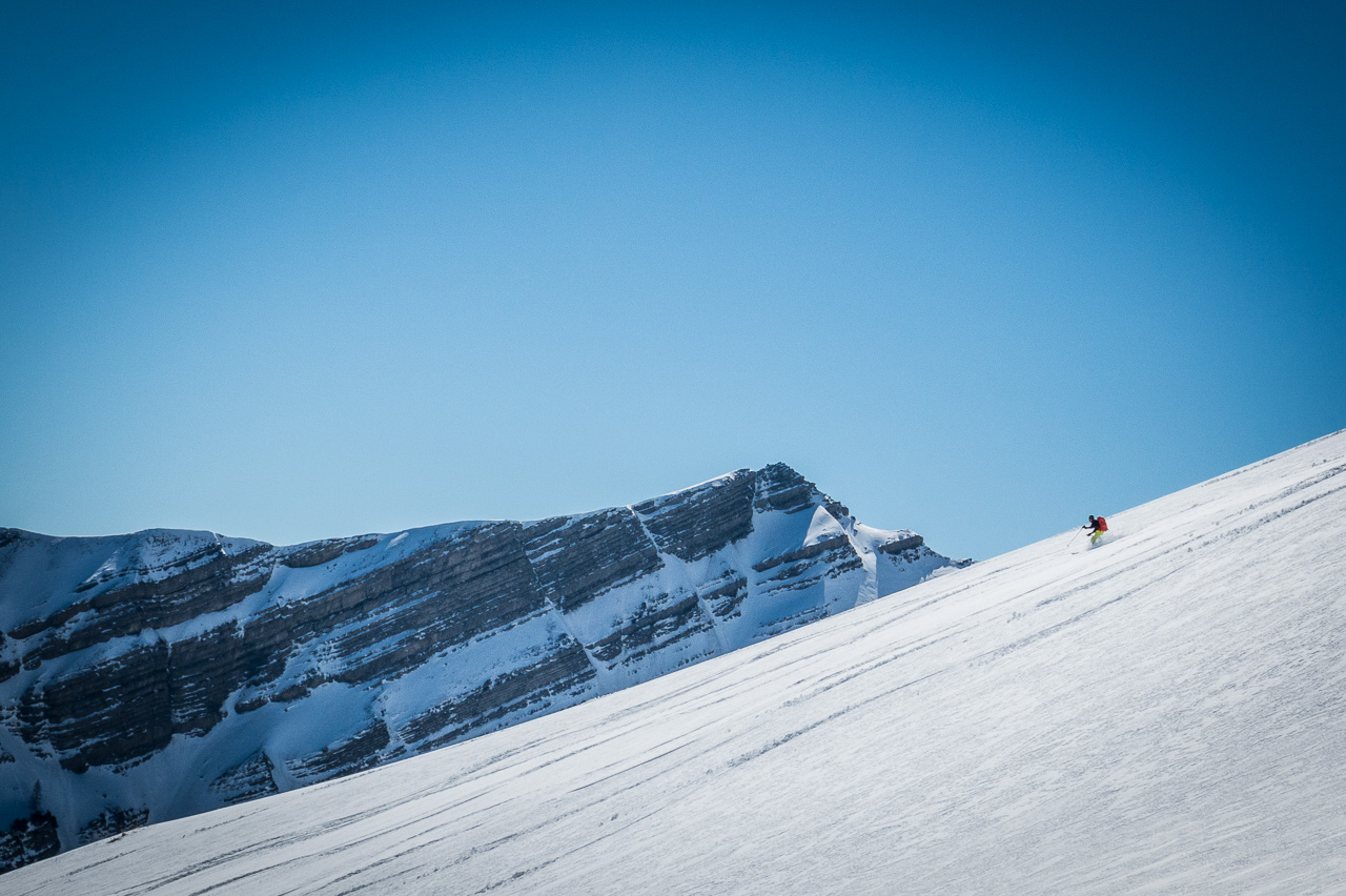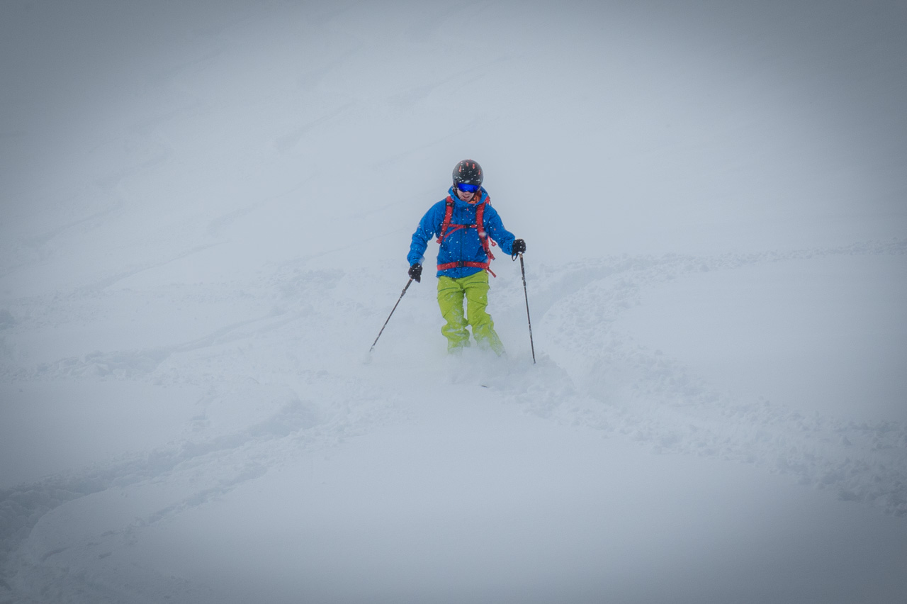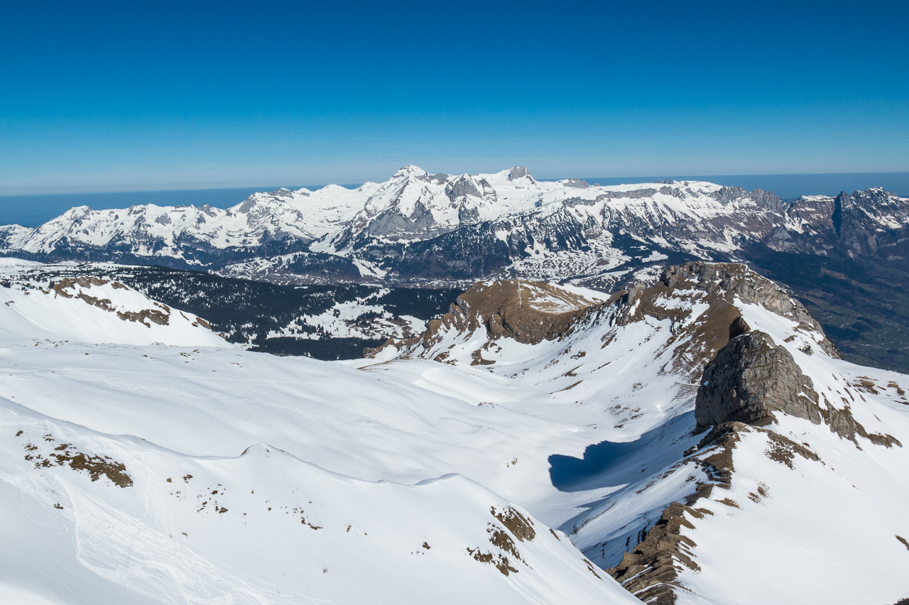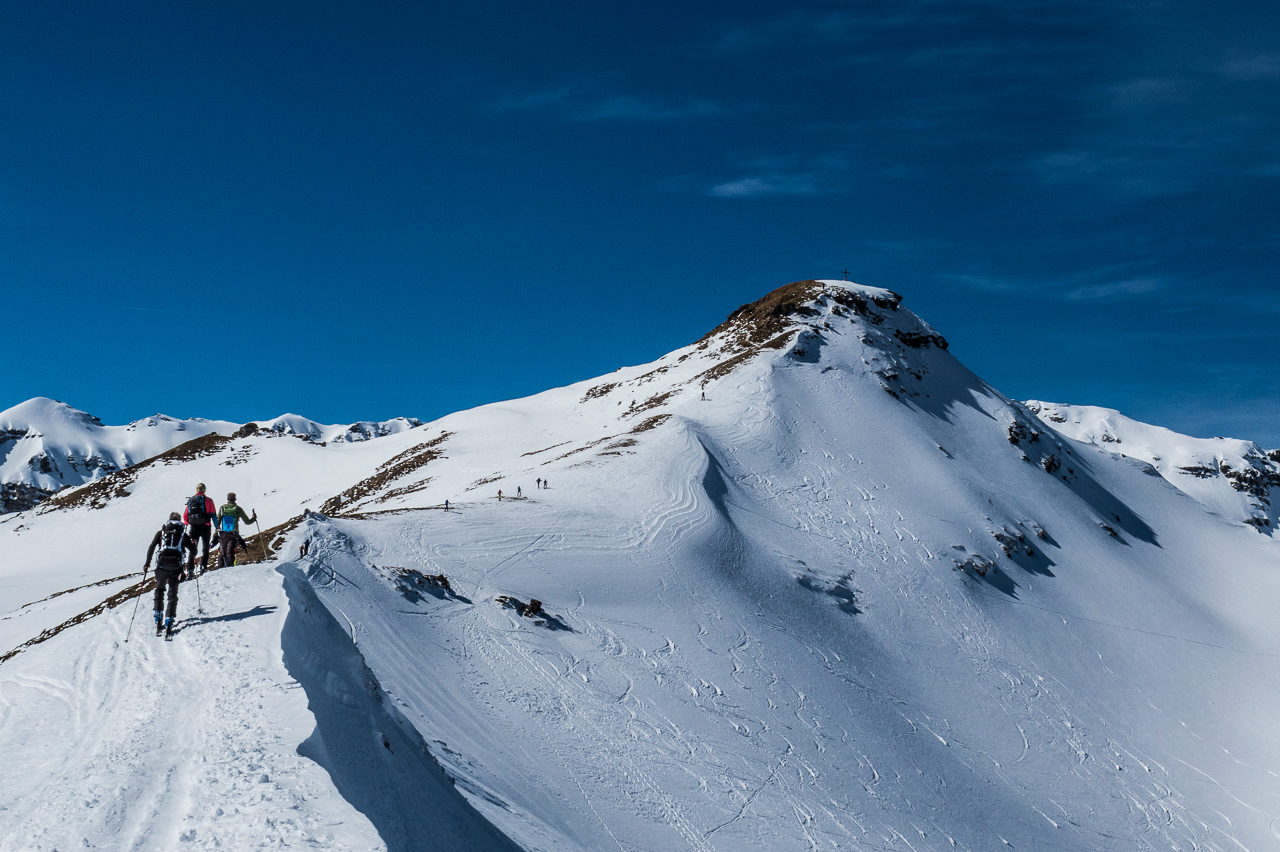 Der Wind kommt nur böenartig, dazwischen ist es sogar windstill, so dass wir eine ganze Weile das Gipfelmeer geniessen können. Aber jetzt ist Zeit für die Abfahrt. Die obersten Meter sind noch, na ja, leicht windgepresst. Aber schon kurz danach: Oh làlà! Pulverschnee vom Feinsten! Es gibt genug, der Hang ist praktisch unverfahren. Überall Juchzer, jeder hat ein Grinsen im Gesicht. Und das war erst der Anfang!