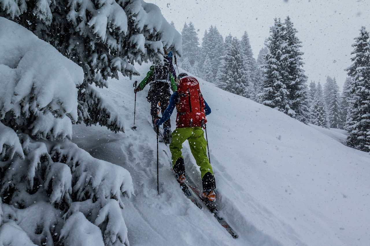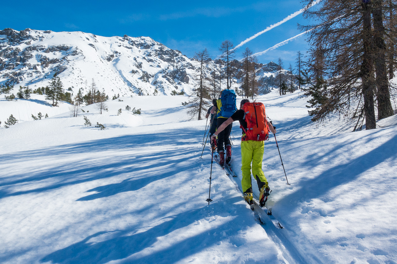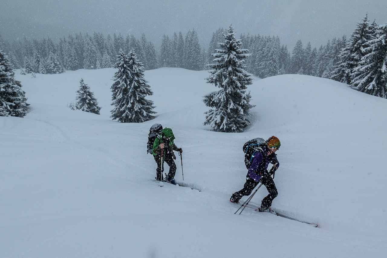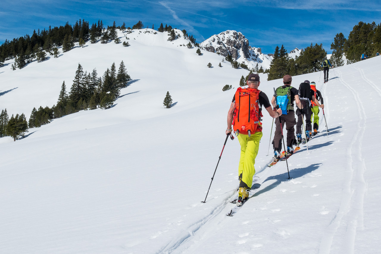 Wir verlassen das Montafon über die Tschaggunser Mittagspitze. Vor dem Aufstieg steht uns eine Abfahrt auf der hart gefrorenen Strasse bevor. Es ist nicht immer einfach zum Bremsen, aber wir kommen problemlos am Zwischenziel an. Nun heisst es wieder Felle montieren und los geht’s. Der Schnee ist schon ziemlich weich, wir merken uns für die Abfahrt, wo wir am besten hinunterfahren werden. Wir steigen hoch durch dichten Wald, bevor wir wieder offenes Gelände erreichen.