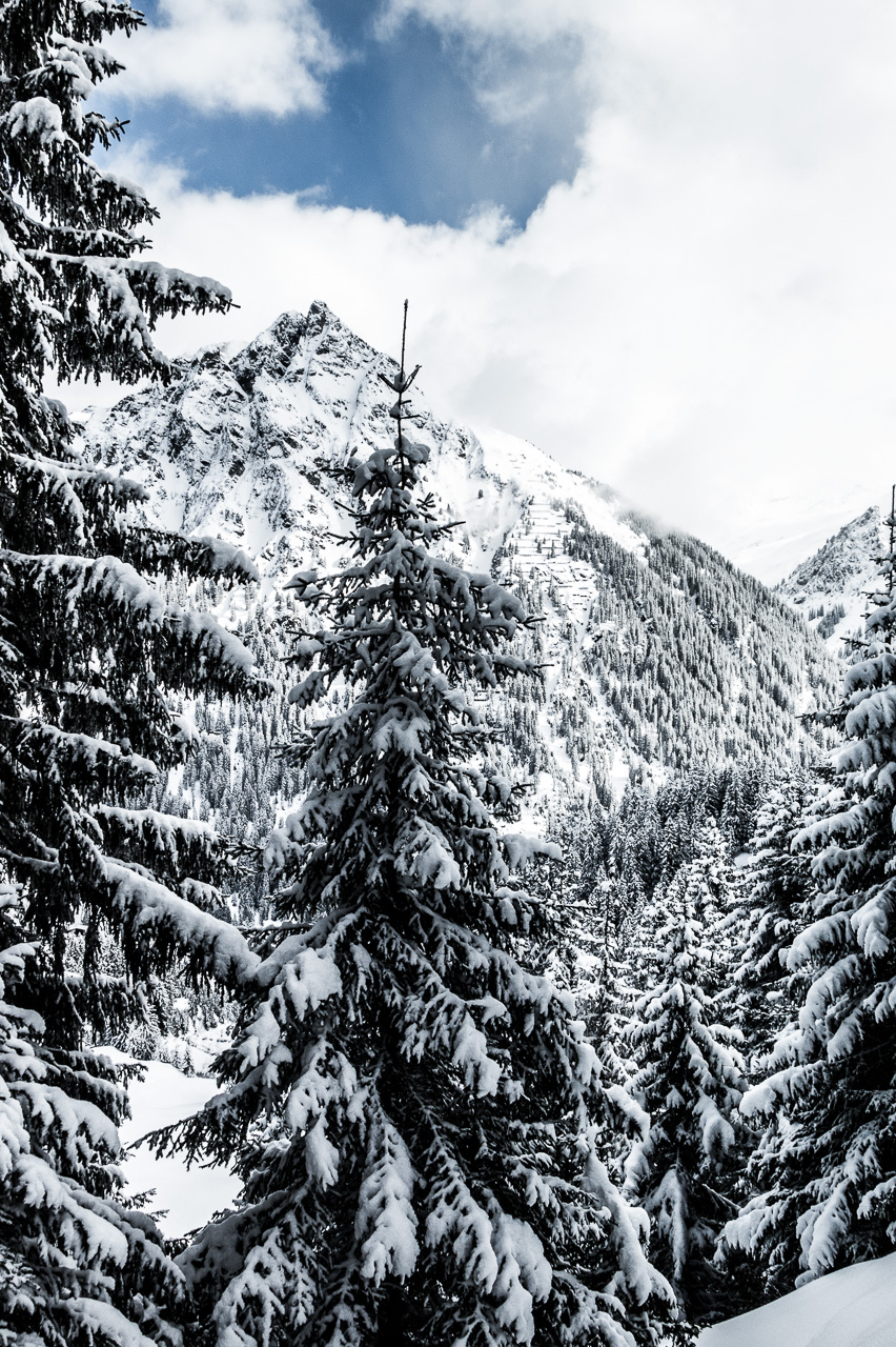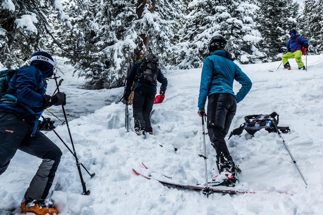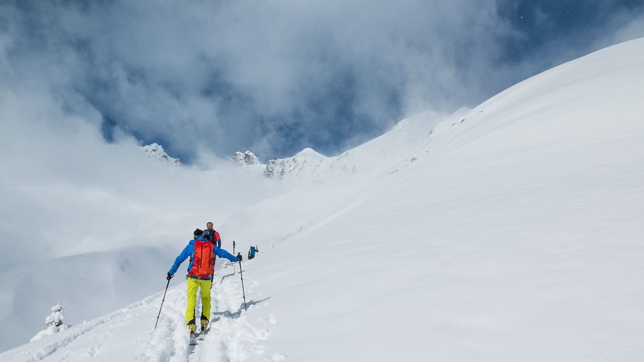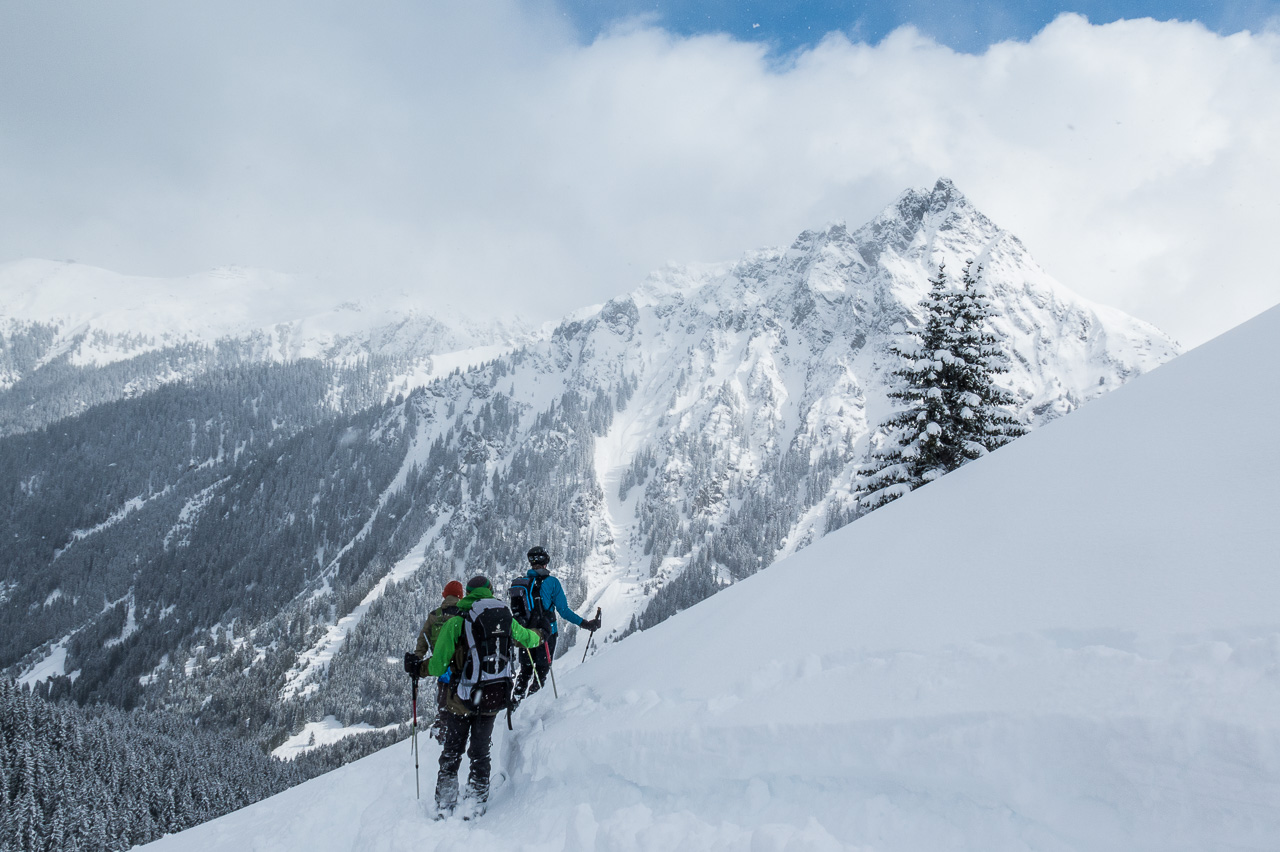 Wir verlassen das Montafon über die Tschaggunser Mittagspitze. Vor dem Aufstieg steht uns eine Abfahrt auf der hart gefrorenen Strasse bevor. Es ist nicht immer einfach zum Bremsen, aber wir kommen problemlos am Zwischenziel an. Nun heisst es wieder Felle montieren und los geht’s. Der Schnee ist schon ziemlich weich, wir merken uns für die Abfahrt, wo wir am besten hinunterfahren werden. Wir steigen hoch durch dichten Wald, bevor wir wieder offenes Gelände erreichen.