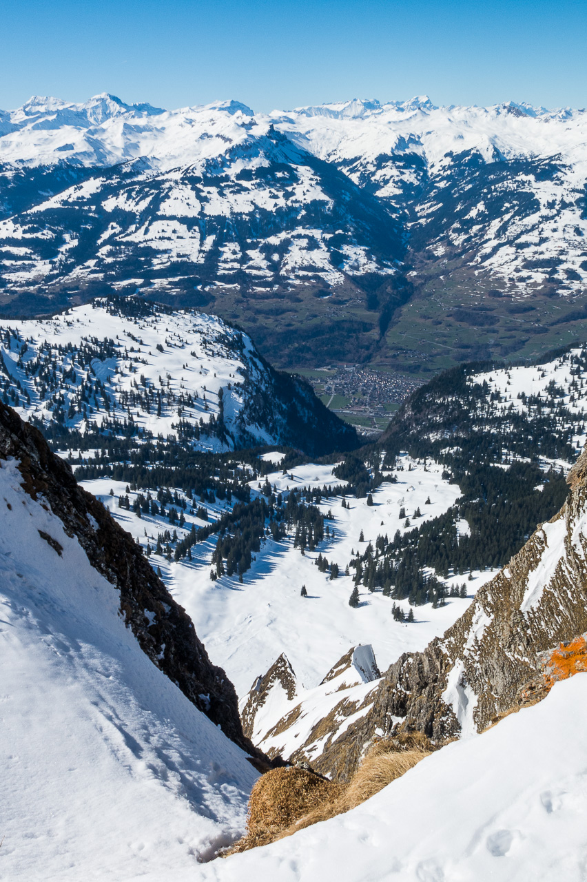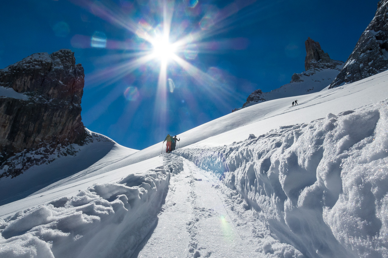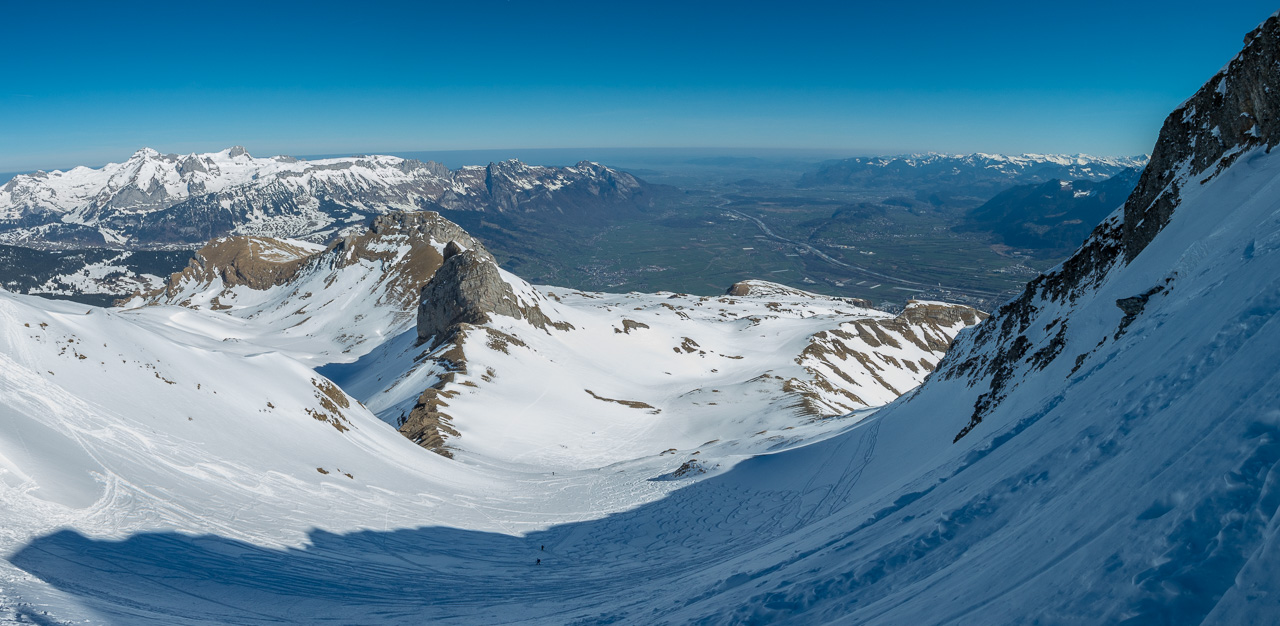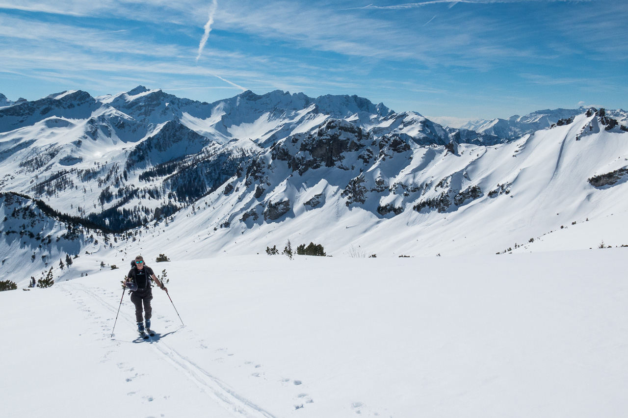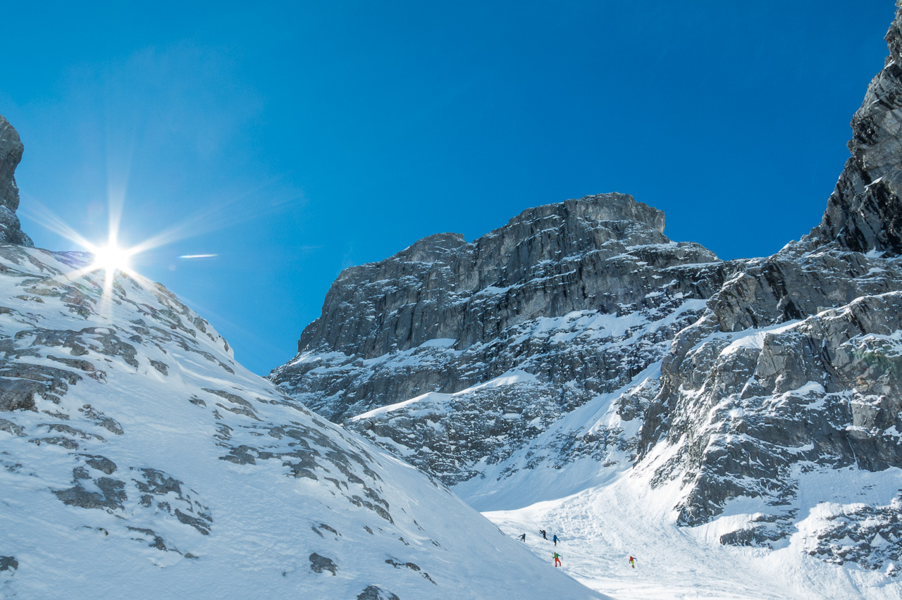 Wir sahen sie schon von der Sulzfluh aus: Eine steile, weisse Flanke, darunter senkrechte Felswände. Da wollen wir hoch? Na, wird schon gehen. Wir starten also, zuerst flach ins Tal hinein, dann links hoch durch Pulverschnee. Wir kommen an imposanten Felswänden vorbei. Auf der gegenüberliegenden Talseite, auf den aperen Flächen, grasen Gämsen. Das ist optimal, wir Skitourengeher suchen die schattigen Nordhänge, die Gämsen die sonnenbeschienen Südhänge, so kommen wir uns nicht in die Quere.
