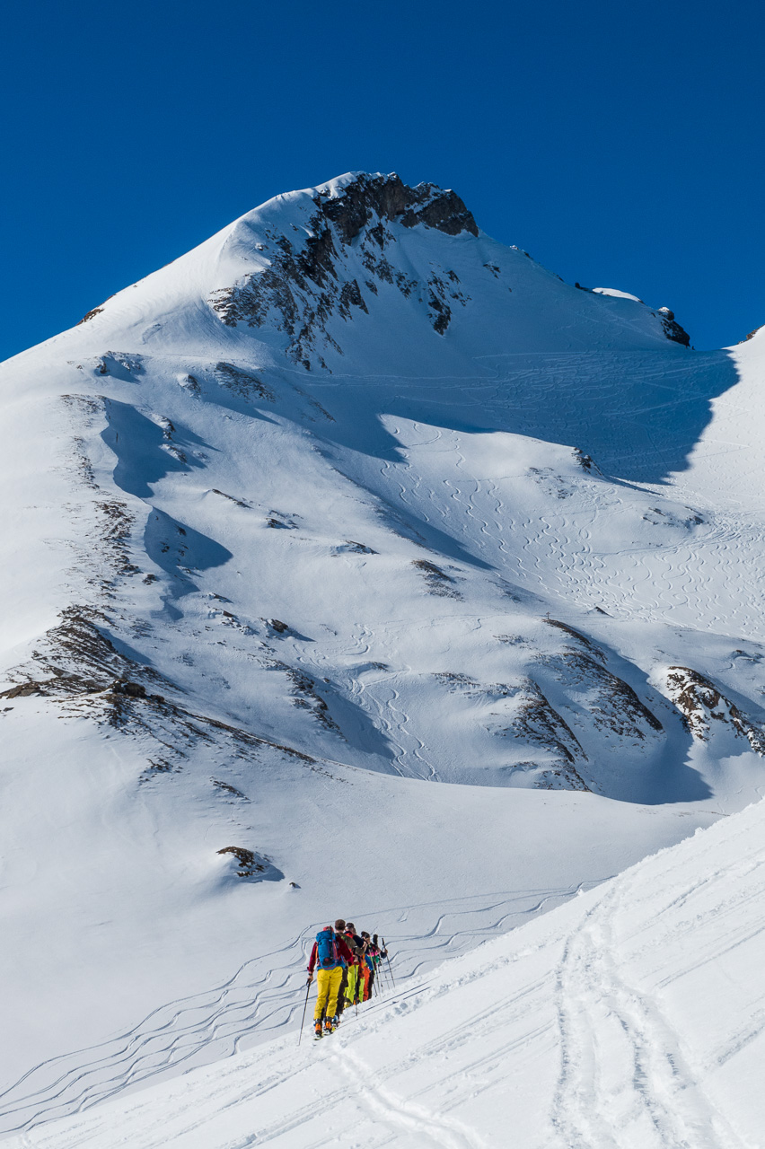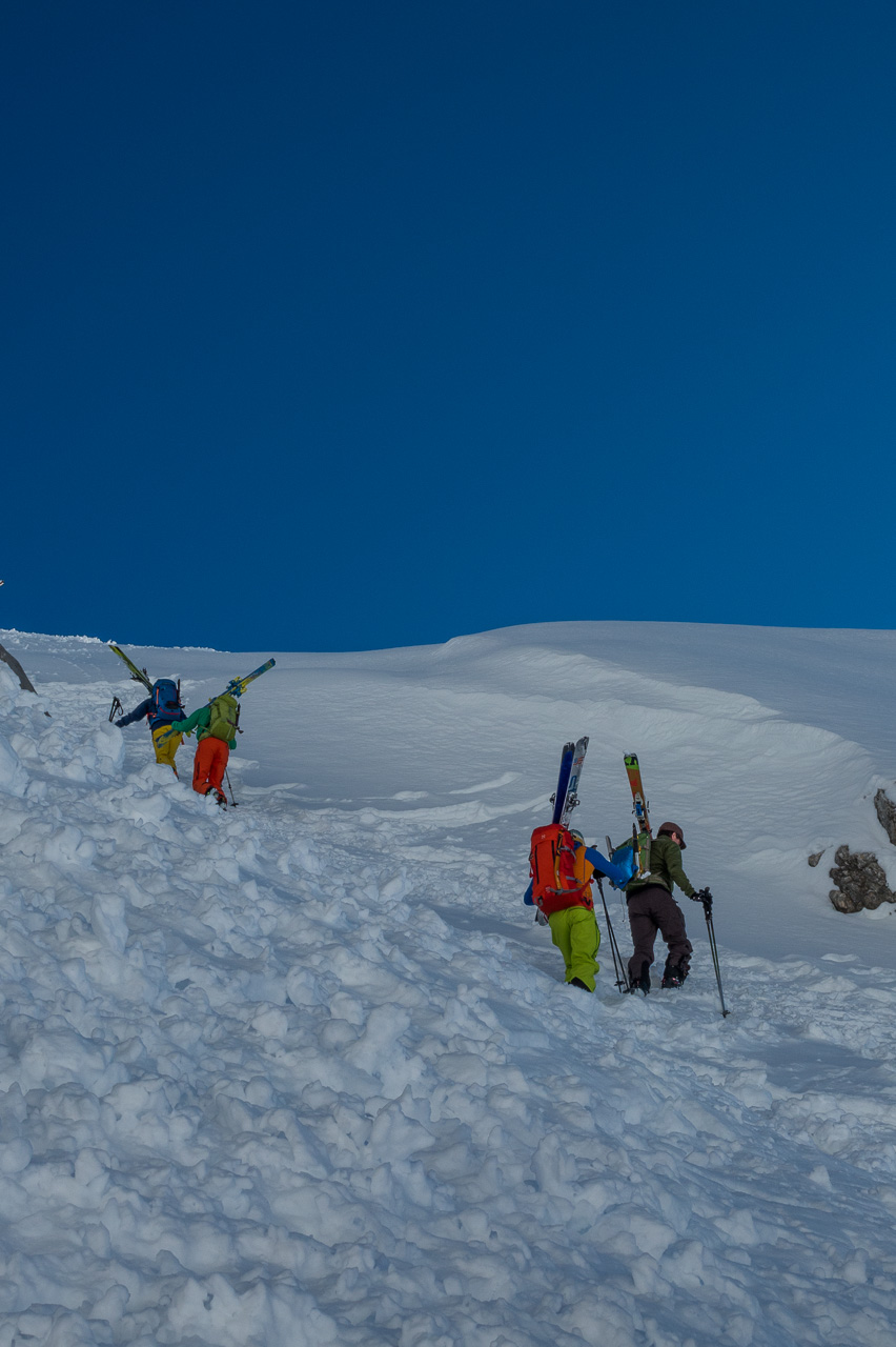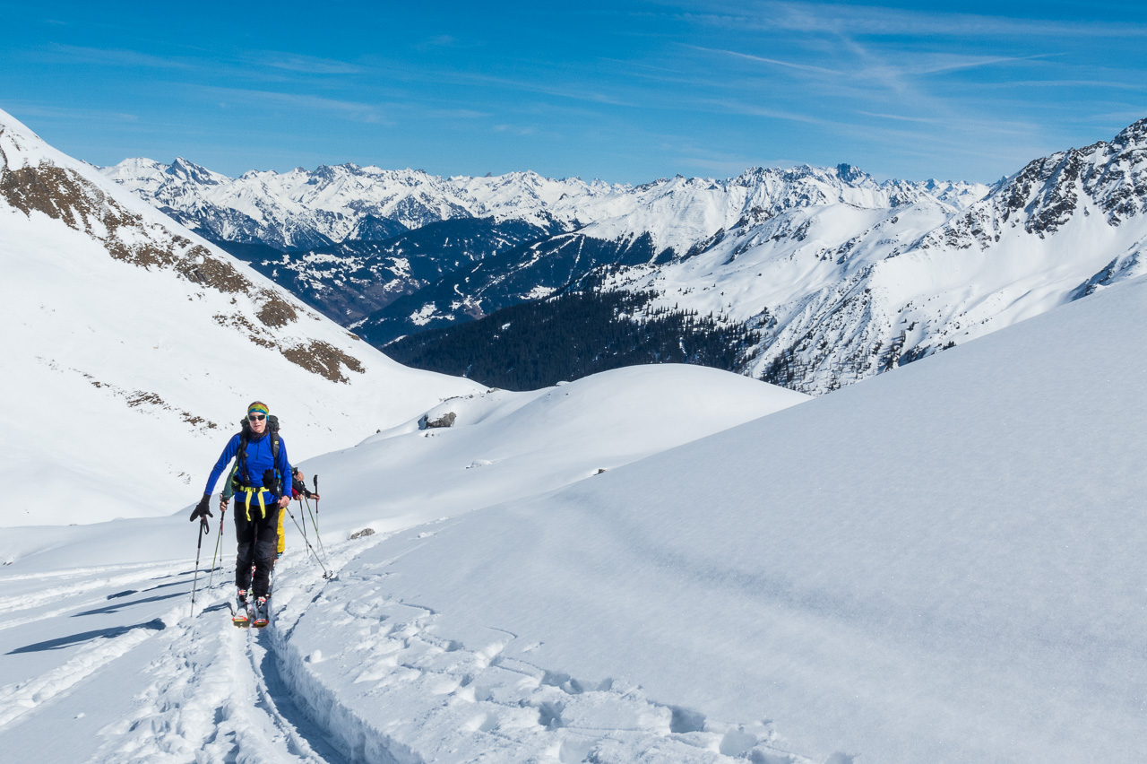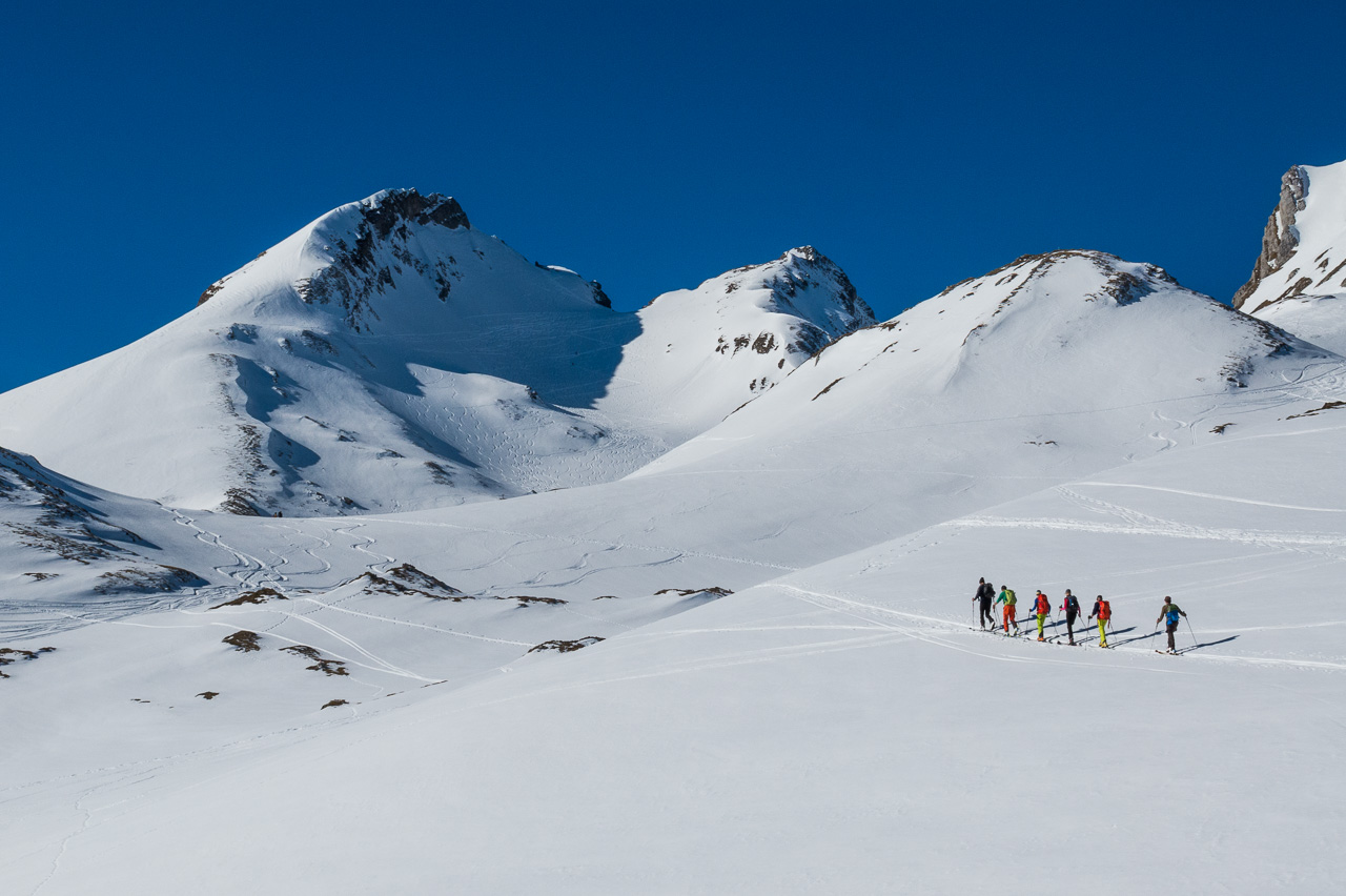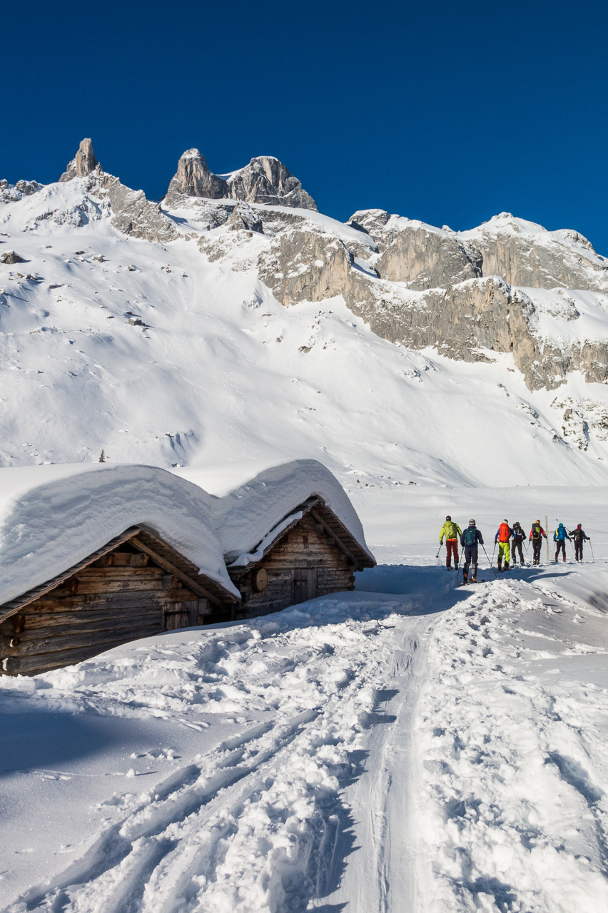 Wir sahen sie schon von der Sulzfluh aus: Eine steile, weisse Flanke, darunter senkrechte Felswände. Da wollen wir hoch? Na, wird schon gehen. Wir starten also, zuerst flach ins Tal hinein, dann links hoch durch Pulverschnee. Wir kommen an imposanten Felswänden vorbei. Auf der gegenüberliegenden Talseite, auf den aperen Flächen, grasen Gämsen. Das ist optimal, wir Skitourengeher suchen die schattigen Nordhänge, die Gämsen die sonnenbeschienen Südhänge, so kommen wir uns nicht in die Quere.