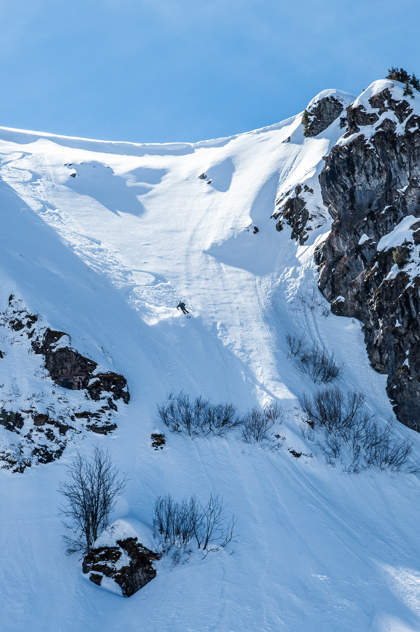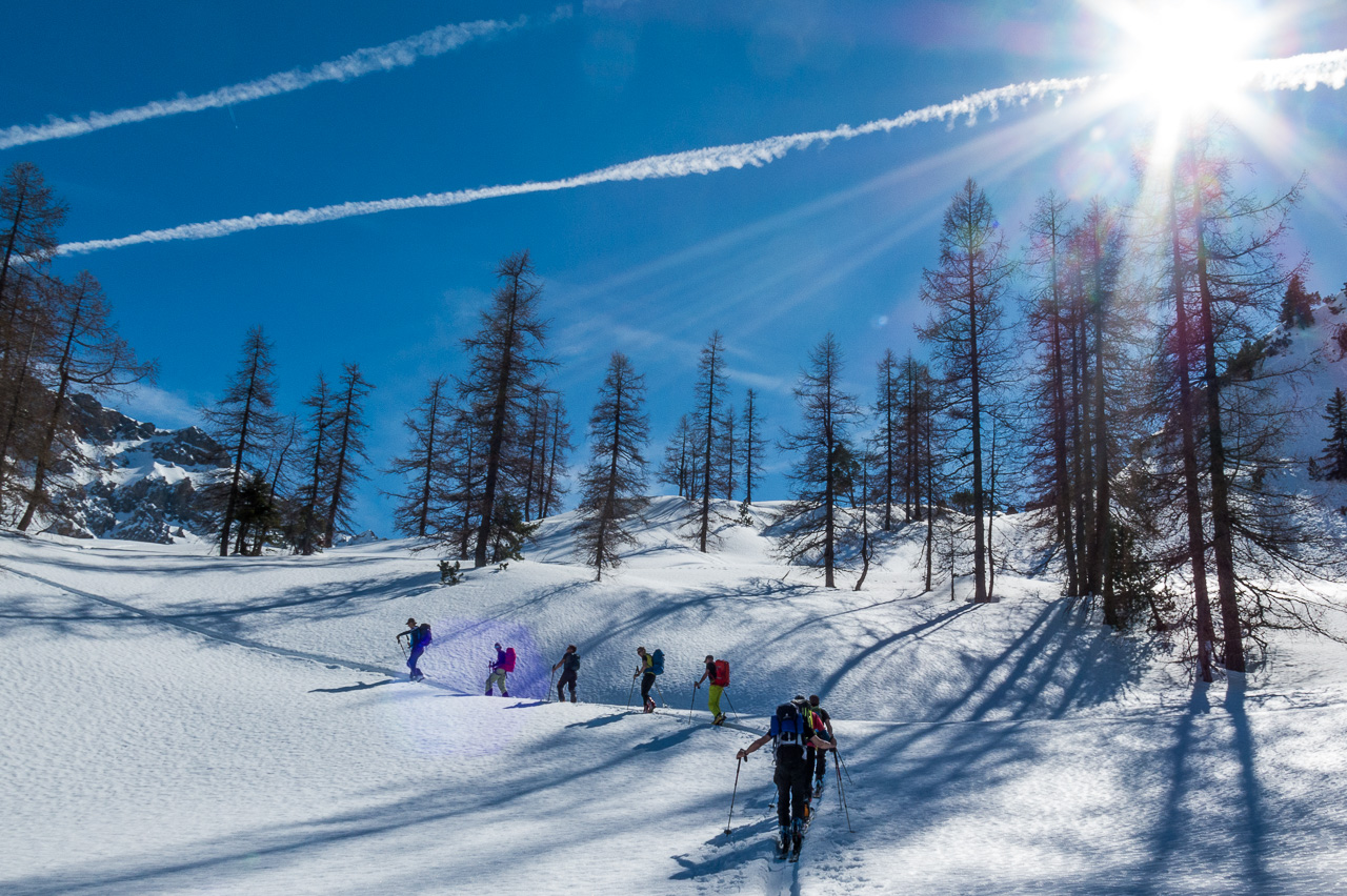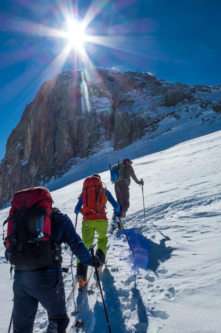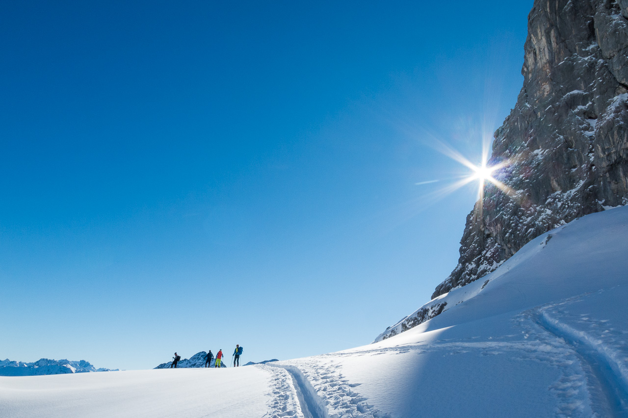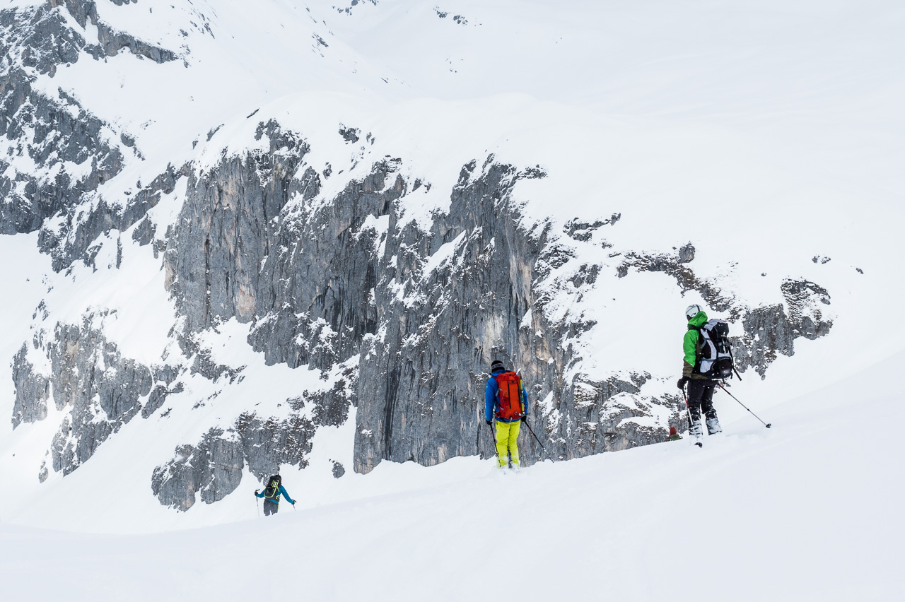 Wir sahen sie schon von der Sulzfluh aus: Eine steile, weisse Flanke, darunter senkrechte Felswände. Da wollen wir hoch? Na, wird schon gehen. Wir starten also, zuerst flach ins Tal hinein, dann links hoch durch Pulverschnee. Wir kommen an imposanten Felswänden vorbei. Auf der gegenüberliegenden Talseite, auf den aperen Flächen, grasen Gämsen. Das ist optimal, wir Skitourengeher suchen die schattigen Nordhänge, die Gämsen die sonnenbeschienen Südhänge, so kommen wir uns nicht in die Quere.
