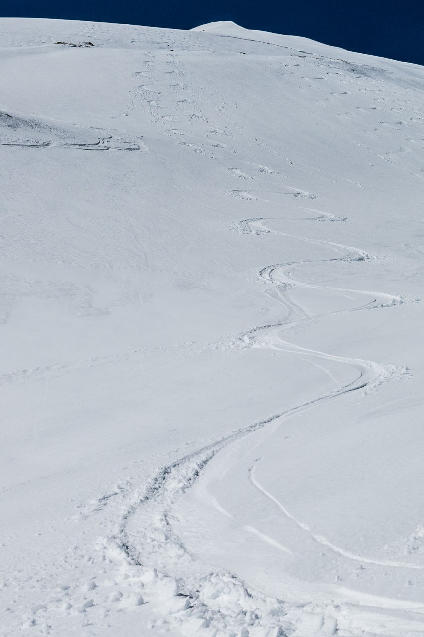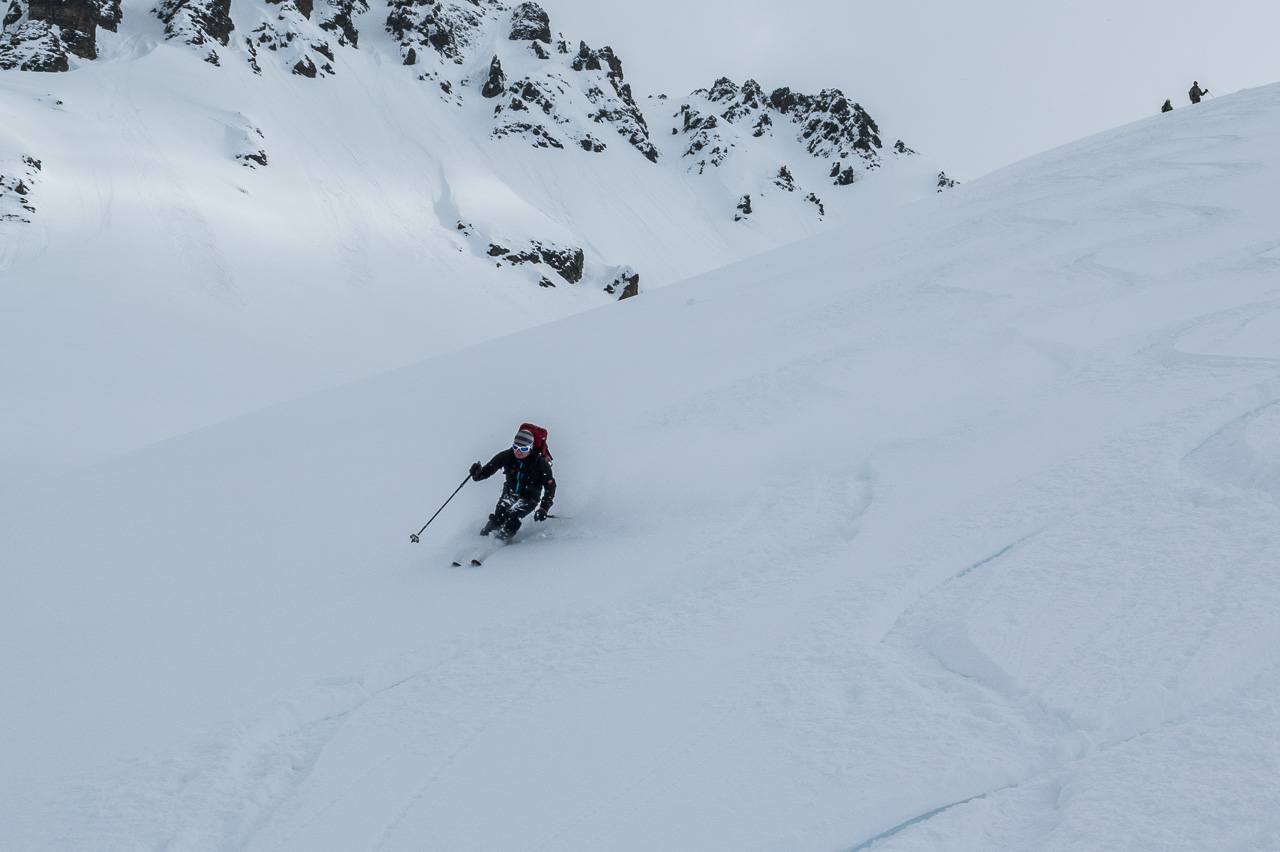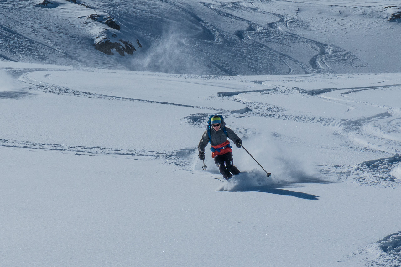 Wir halten uns nicht lange auf, steigen wieder ab, aber nicht wie der Mainstream von dort, wo wir hergekommen sind, sondern auf die andere Seite, was eine kurze Klettereinlage zur Folge hat. Dafür werden wir mit Pulverschnee im ersten Hang belohnt. Danach ist der Schnee nicht mehr ganz so toll, natürlich wurde er noch weicher. Aber wir kommen sicher wieder in Vermol an, wo wir unseren Durst löschen.