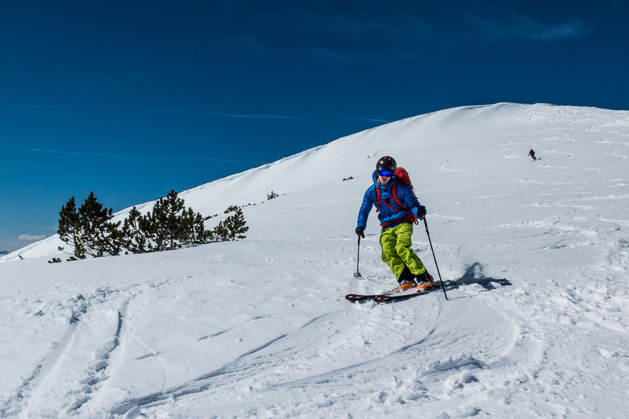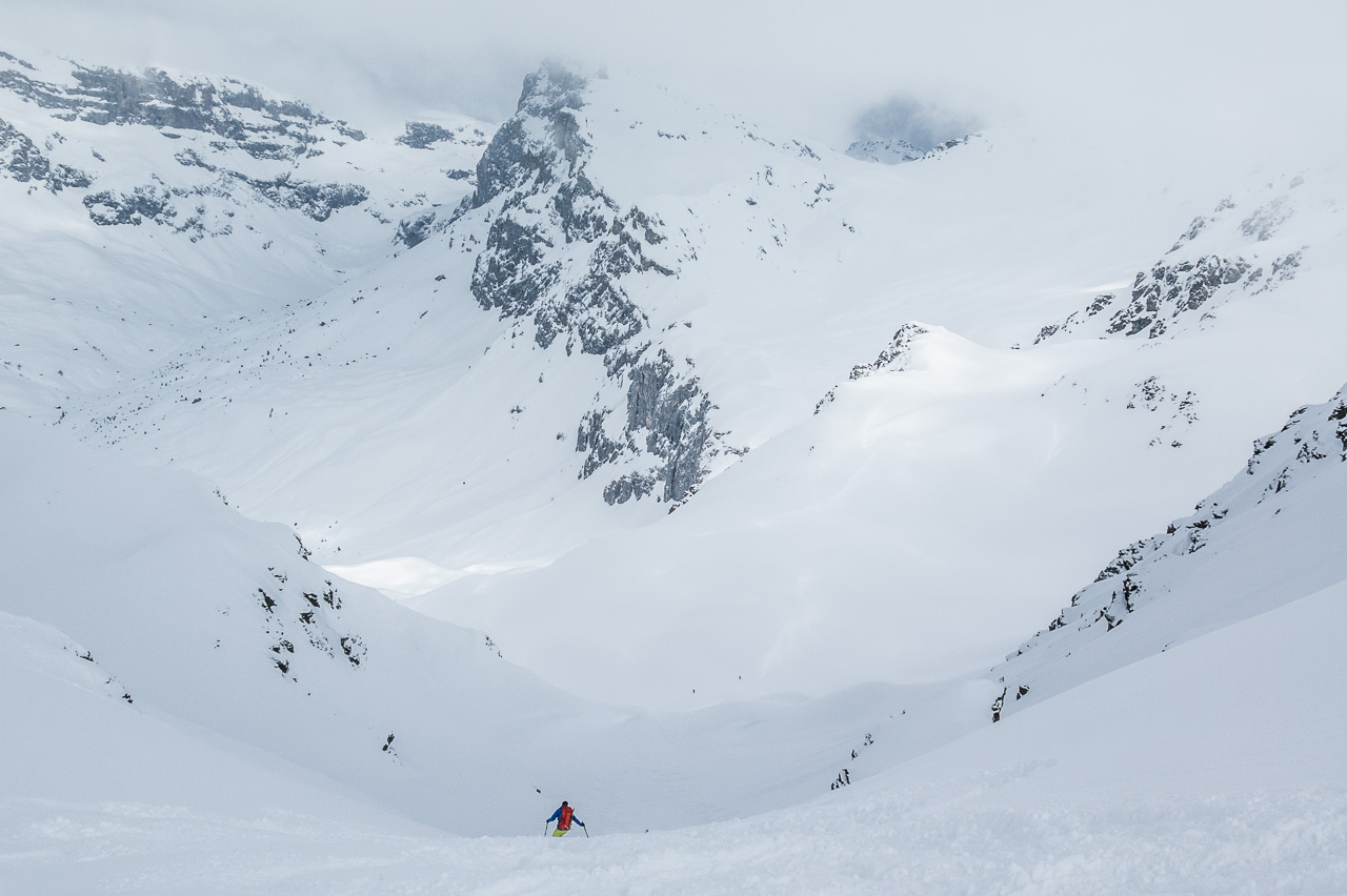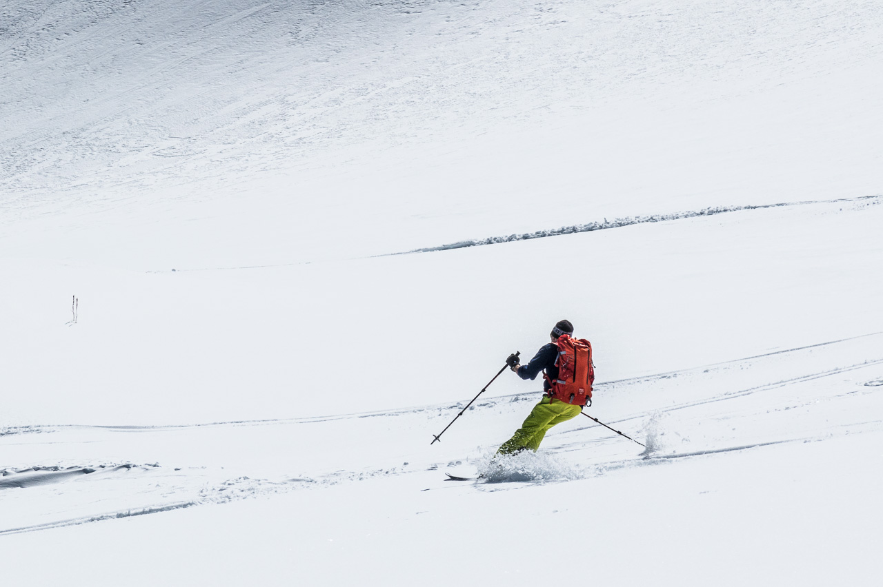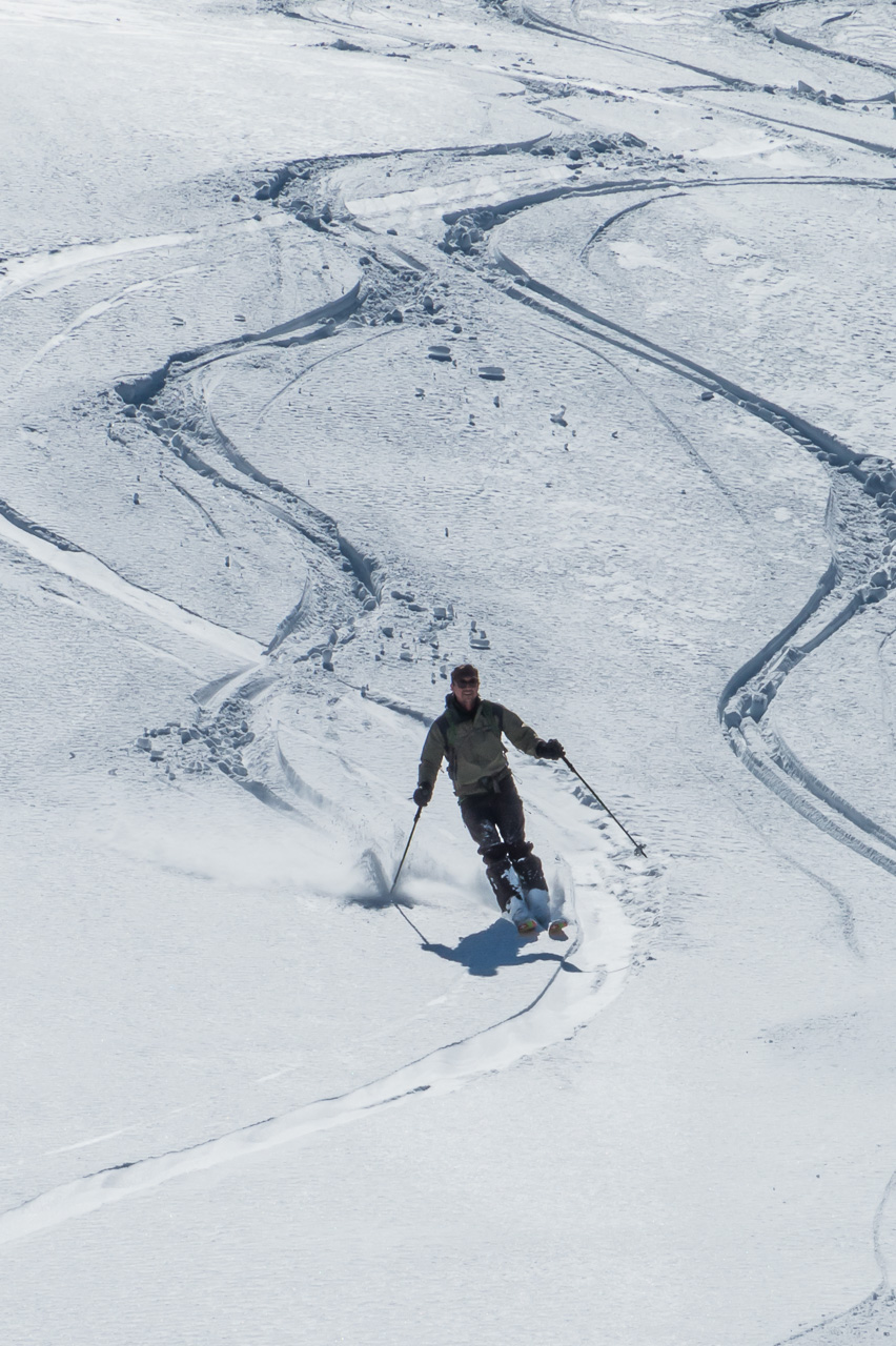 Wir halten uns nicht lange auf, steigen wieder ab, aber nicht wie der Mainstream von dort, wo wir hergekommen sind, sondern auf die andere Seite, was eine kurze Klettereinlage zur Folge hat. Dafür werden wir mit Pulverschnee im ersten Hang belohnt. Danach ist der Schnee nicht mehr ganz so toll, natürlich wurde er noch weicher. Aber wir kommen sicher wieder in Vermol an, wo wir unseren Durst löschen.
