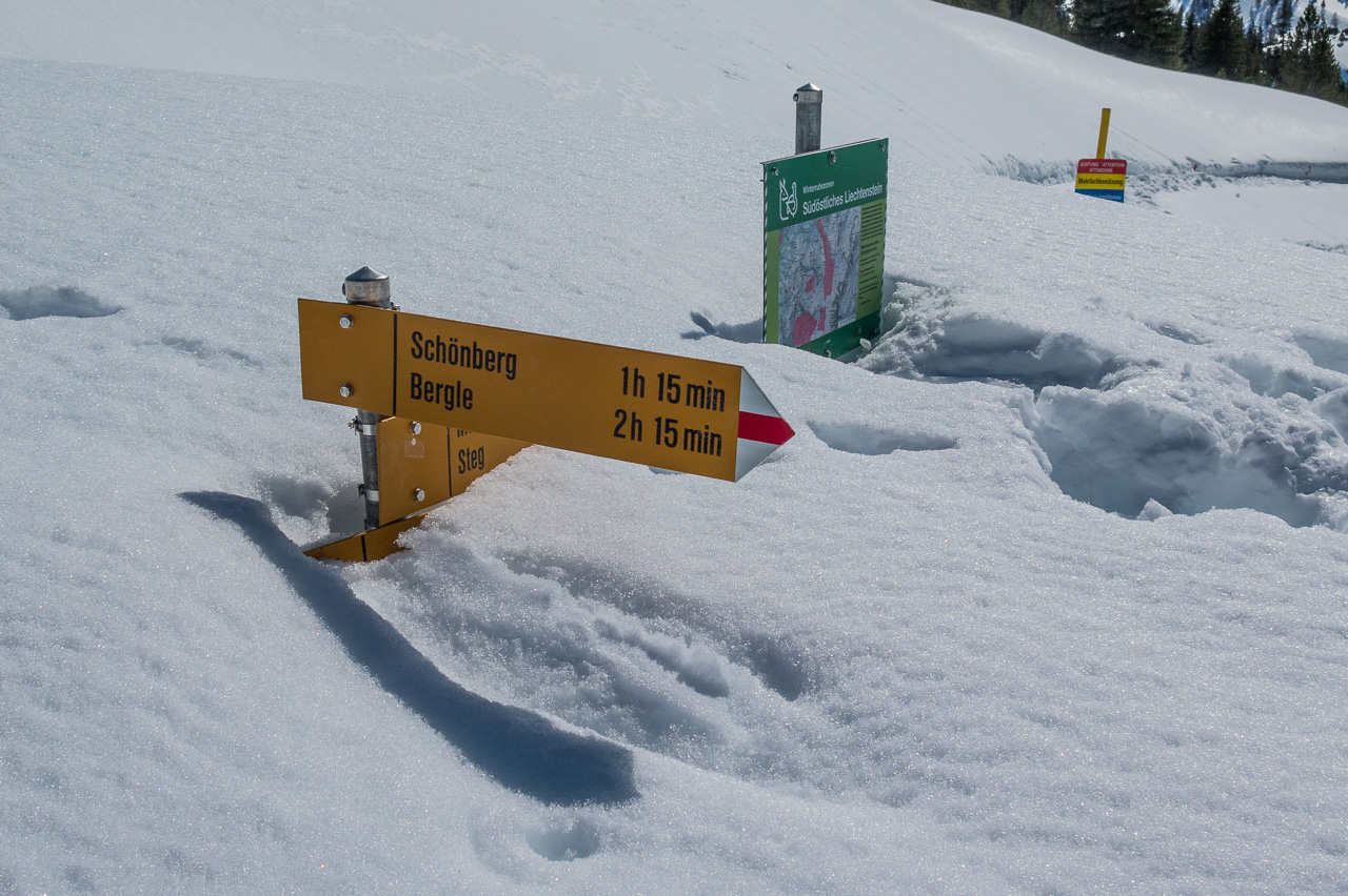 Die Abfahrt ist auch wieder nicht schlecht, ich würde den Schnee als feuchten Pulverschnee bezeichnen. Gegen unten wird er immer tiefer, beim Sautobel ist aber Schluss, wir steigen wieder hoch zum Sassförkle. Die Abfahrt auf der Forststrasse nach Malbun ist interessant, wenn die Strasse beschienen ist, fahren die Skis nicht richtig. Kaum ist Schatten von den Bäumen, laufen sie wie verrückt, um dann wieder ziemlich heftig abzubremsen, wenn die Sonne den Schnee aufgeweicht hat.