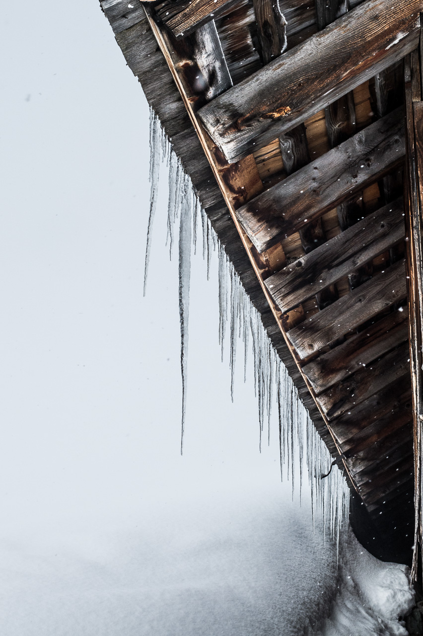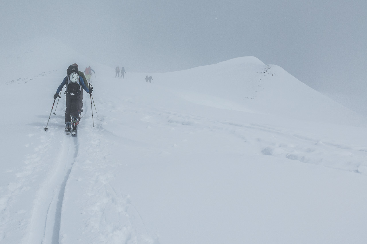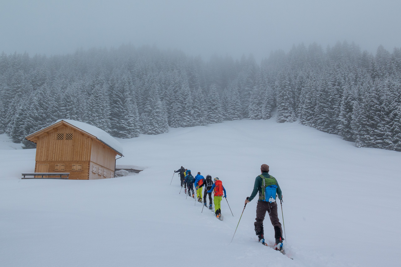 Gemäss Wetterprognosen ist heute der schlechteste Tag. Dies will er gleich unter Beweis stellen und lässt es schneien. Das verdriesst uns aber nicht, im Schneegestöber steigen wir auf zur Unteren und Oberen Röbialpe, wo wir jeweils pausieren. Nach dem Schneefall bleibt noch der Nebel, der immer wieder aufreisst und uns einen Blick auf den blauen Himmel erhaschen lässt, aber nur kurz. Wir queren in Lawinenabständen einen steilen Hang, steigen höher, immer noch mit Sicherheitsabstand. Die Gämsen scheinen davon nichts zu halten, ein Rudel von gegen dreissig Tieren quert oberhalb von uns den Hang. Für mich wäre nun genug, der weitere Weg ist steil und Nebel versperrt die Sicht. „Noch bis zu diesem Boden hier“, ruft der Tourenleiter. Also gut, aber dann ist Schluss für mich. Dieser Ansicht sind die meisten, nur drei gehen noch weiter. Na ja, ich bin vielleicht etwas übervorsichtig, aber lieber einmal zu früh als nie mehr umkehren. Der Tourenleiter mit seiner immensen Erfahrung erklärt später, weshalb er dies verantworten konnte. Die Lawinengefahr wurde vom SLF nachträglich nach unten korrigiert.