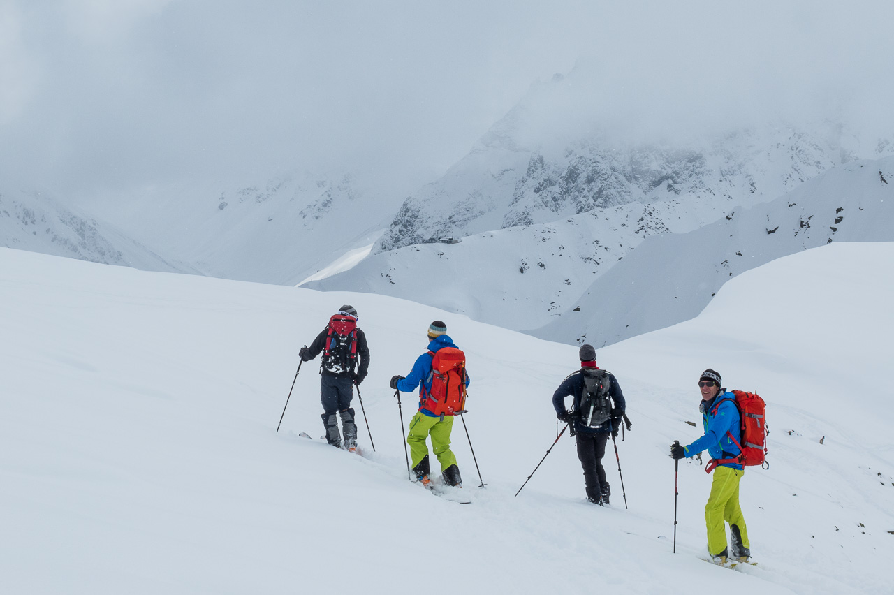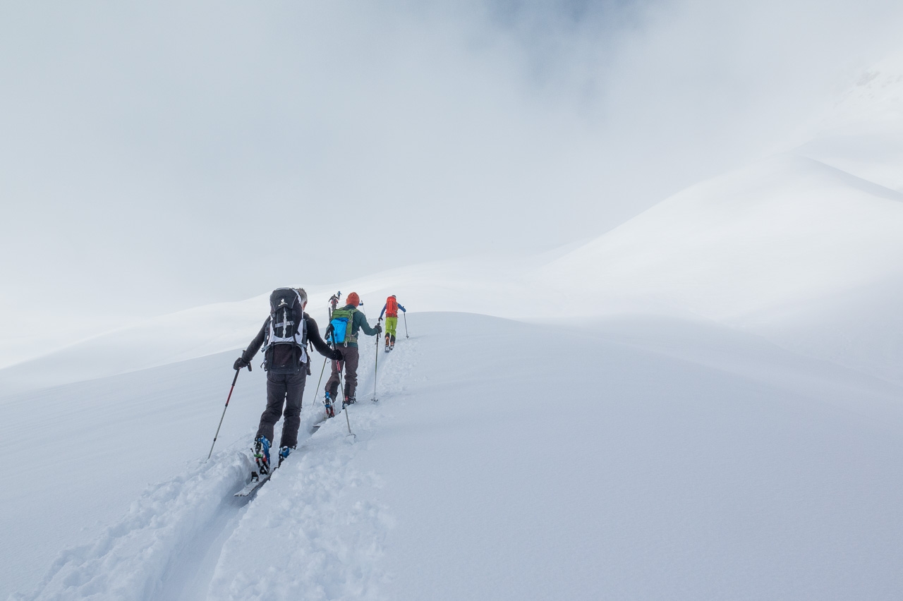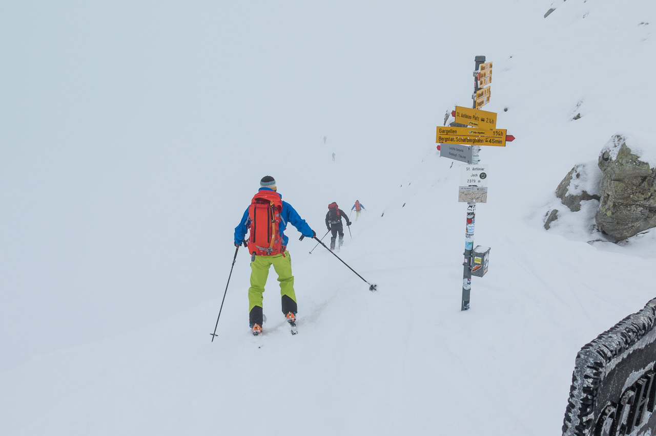 Heute sollte das Wetter besser werden. Als wir jedoch mit den Bahnen hoch fahren und den Aufstieg starten zum St. Antönier Joch, ist die ganze Landschaft immer noch in Nebel gehüllt. Auf dem Joch weht auch noch ein kalter Wind, kein gemütlicher Ort für eine Pause. Wir gehen weiter und steigen auf zu einem Vorgipfel des Riedchopfs. Auch hier halten wir es nicht lange aus, dafür geniessen wir die erste Abfahrt im Pulverschnee. Danach steht uns allerdings wieder ein Aufstieg bevor, denn wir wollen heute alle auf den Rotspitz. Zwischendurch reisst es auf, wir blicken ins Prättigau hinunter. Auf dem Gipfel ist es aber wiederum nicht sehr gemütlich. Und immer, wenn wir meinen, der Nebel löse sich auf, kommt die nächste Schwade. Wir machen uns an die Abfahrt. Die Sicht ist diesig, Konturen schwer auszumachen. Wir warten immer, bis mal wieder kurz die Sonne kommt und fahren dann los. Der Schnee ist aber über jeden Zweifel erhaben, feiner Pulverschnee verwöhnt uns. Wir streben nun Partnunstafel und dem Berggasthaus Sulzfluh zu, wo wir drei weitere Kameraden erwarten.