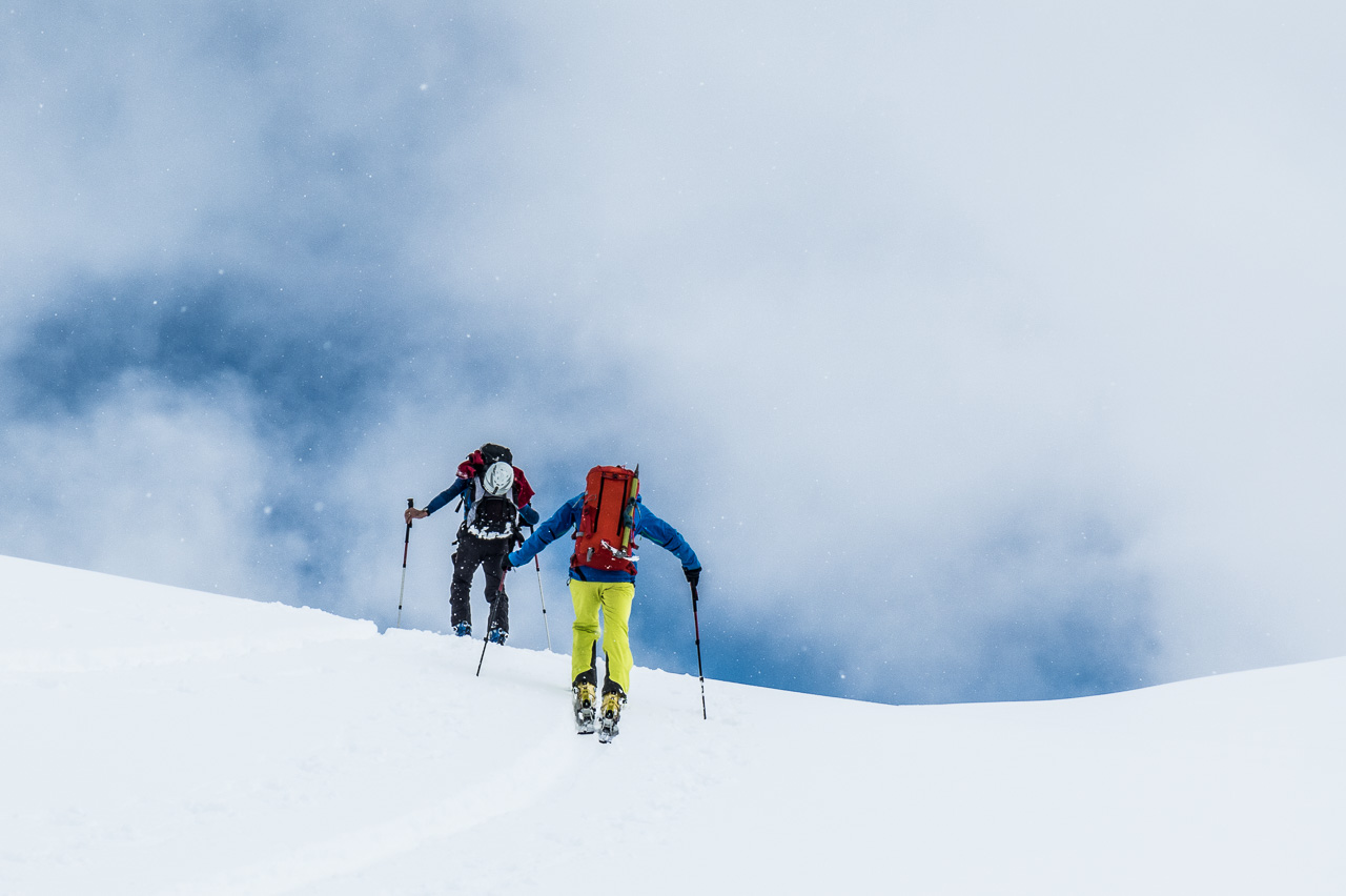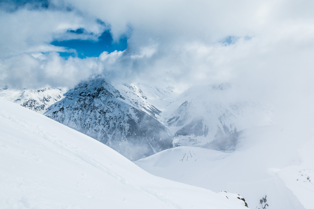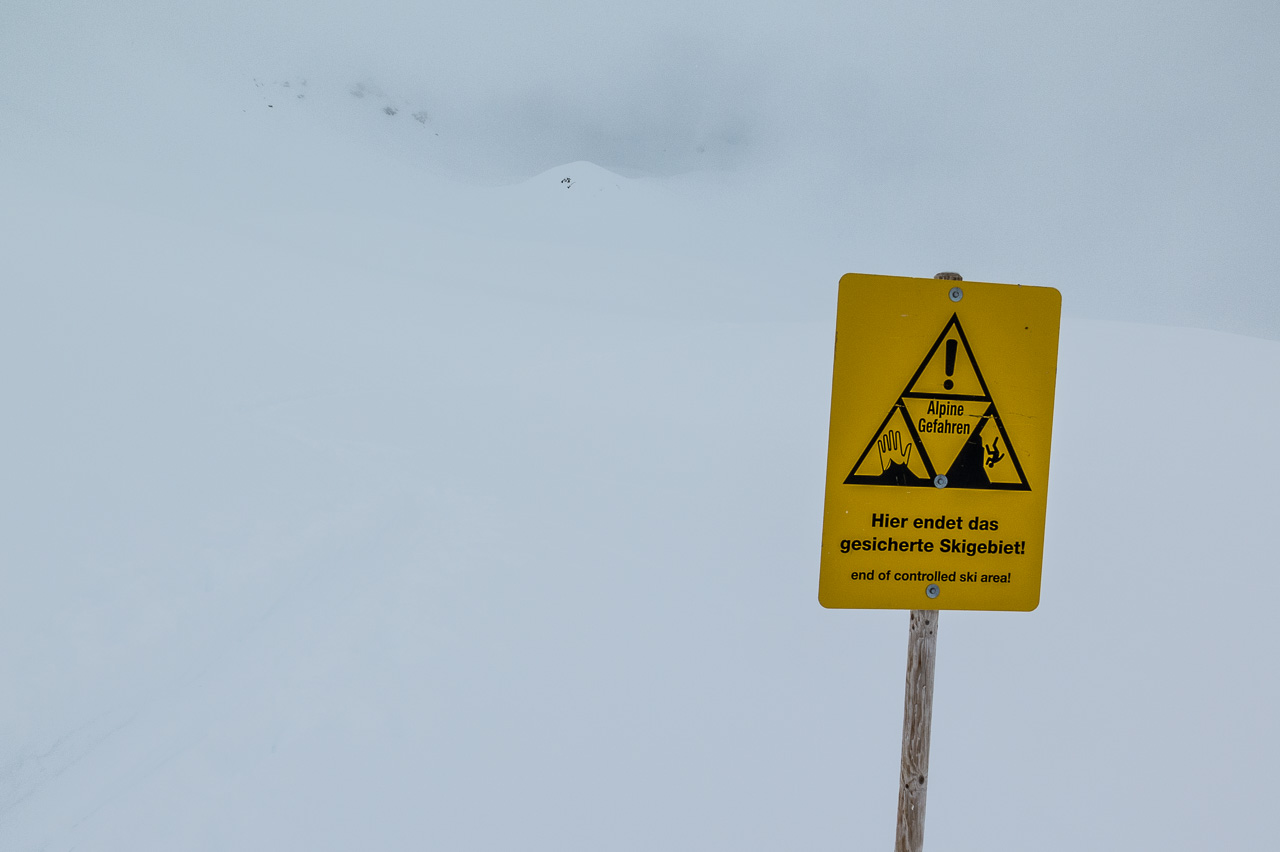 Heute sollte das Wetter besser werden. Als wir jedoch mit den Bahnen hoch fahren und den Aufstieg starten zum St. Antönier Joch, ist die ganze Landschaft immer noch in Nebel gehüllt. Auf dem Joch weht auch noch ein kalter Wind, kein gemütlicher Ort für eine Pause. Wir gehen weiter und steigen auf zu einem Vorgipfel des Riedchopfs. Auch hier halten wir es nicht lange aus, dafür geniessen wir die erste Abfahrt im Pulverschnee. Danach steht uns allerdings wieder ein Aufstieg bevor, denn wir wollen heute alle auf den Rotspitz. Zwischendurch reisst es auf, wir blicken ins Prättigau hinunter. Auf dem Gipfel ist es aber wiederum nicht sehr gemütlich. Und immer, wenn wir meinen, der Nebel löse sich auf, kommt die nächste Schwade. Wir machen uns an die Abfahrt. Die Sicht ist diesig, Konturen schwer auszumachen. Wir warten immer, bis mal wieder kurz die Sonne kommt und fahren dann los. Der Schnee ist aber über jeden Zweifel erhaben, feiner Pulverschnee verwöhnt uns. Wir streben nun Partnunstafel und dem Berggasthaus Sulzfluh zu, wo wir drei weitere Kameraden erwarten.