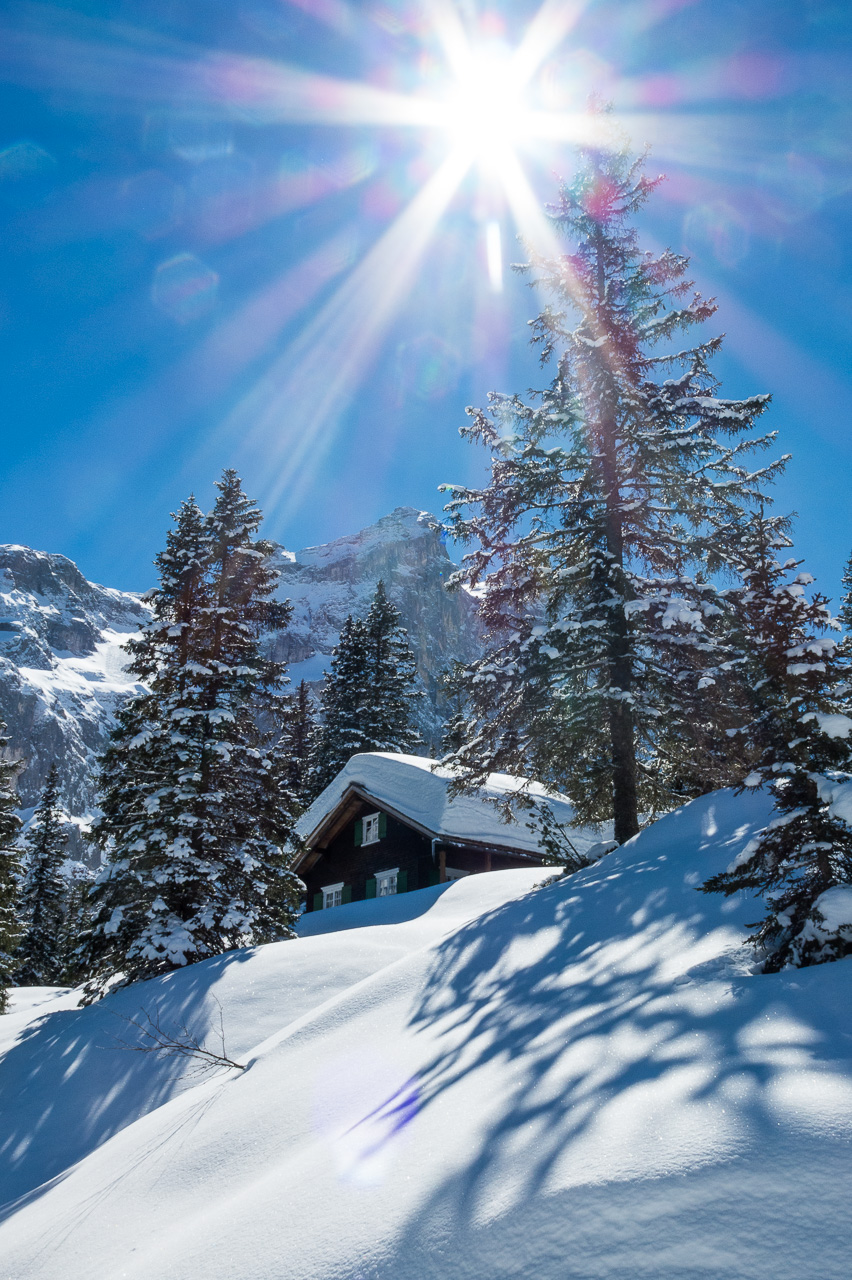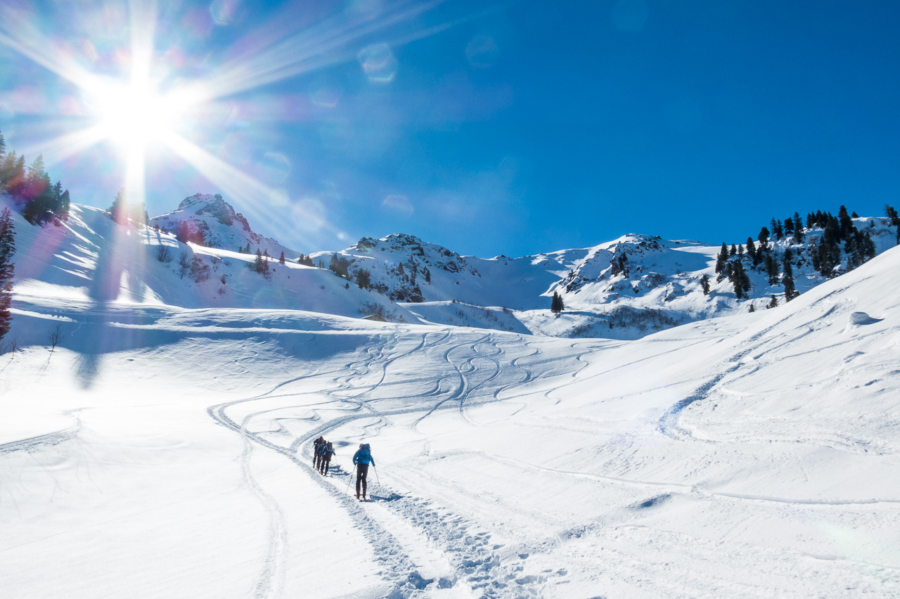 Wir nehmen Hang um Hang, locker-flockiger Pulverschnee lässt uns schweben. Wir verfahren das ganze Tälchen, eine Spur neben der anderen. Wenn ich eines nicht möchte, dann das: Jetzt hier aufsteigen. Zuschauen müssen, wie andere alles verfahren. So wie die paar, die uns entgegenkommen. Über 1000 Höhenmeter P-U-L-V-E-R-S-C-H-N-E-E! Der Wahnsinn! Völlig geflasht und ausser Atem kommen wir im Talboden an. Nach der Verschnaufpause steht uns noch ein kurzer Aufstieg zur Lindauerhütte bevor. Wunderschön, der Weg durch den verschneiten Wald! Und in der Hütte geniessen wir dann gleich einen Radler auf der Sonnenterrasse. So schön können Skitouren sein, diese war beinahe perfekt.