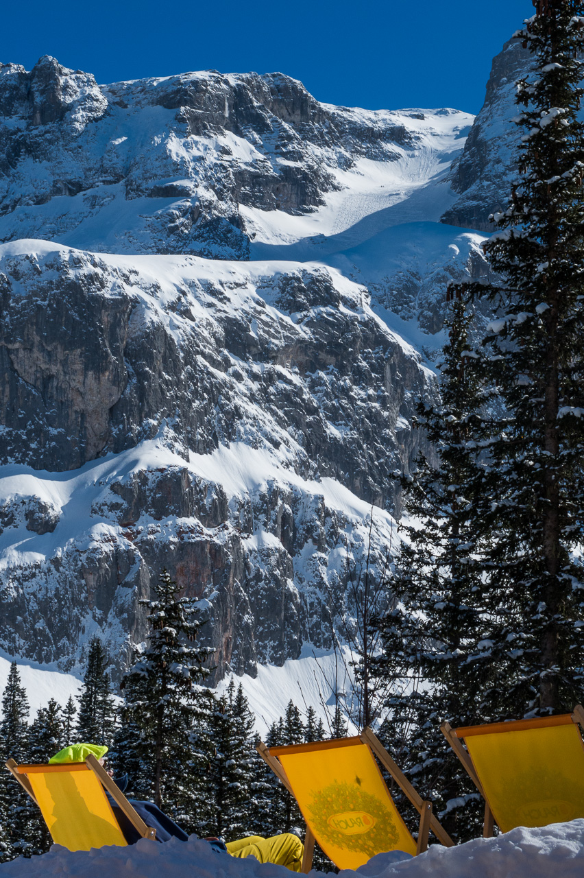 Der Gipfelhang ist sonnenbeschienen und deshalb schon etwas hart. Weiter unten, wo mehr Schatten ist, geniessen wir wieder Pulverschnee vom Feinsten. Einfach unglaublich, was wir hier wieder erleben. Nach einer kurzen Pause ziehen wir die Felle nochmals auf und steigen das Eistobel hoch. Mir reicht es aber bald einmal, ich geniesse lieber die Stimmung. Ich stehe mitten zwischen gewaltigen Felswänden, welche von Alpendohlen bewohnt sind. Sie geben ihre Flugkünste zum Besten, was immer wieder ein Grund zum Staunen ist. Die anderen kehren auch um, gemeinsam fahren wir zurück zur Lindauer Hütte. Und geniessen dort, na klar, den einen oder anderen Radler.