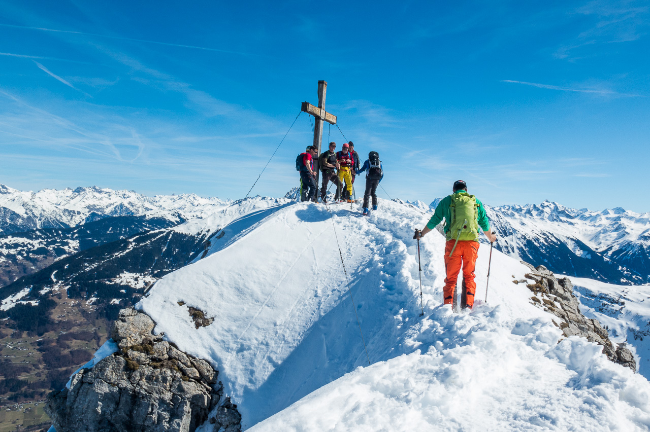 Heute ist alles anders. Rosarot kündigt sich der Tag an, kein Wölkchen ist am Himmel auszumachen. Wir sind kaum zu bremsen, endlich geht es los. Im Schatten ist es noch ziemlich kühl, aber über uns leuchtet die mächtige Sulzfluh, unser Ziel, bereits im Morgenlicht. Nur die Windfahnen trüben etwas die Vorfreude. Bald erreichen wir ebenfalls die Sonne, es ist gleich viel wärmer. Aber wo geht es da hoch? Ich sehe nur Felswände. Irgendwo dazwischen muss ein Durchschlupf sein. Tatsächlich, ein steiles Couloir zwingt uns kurz zum Skitragen, bevor es wieder wie gewohnt weitergeht. Nun können wir auch die Gipfelparade geniessen, hunderte Bergspitzen erheben sich in unserem Blickfeld. Je höher wir kommen, desto heftiger weht der Wind. Kurz unter dem Gipfel, an einem windstillen Plätzchen, entschliessen wir uns zur Felldemontage, denn auf dem Gipfel scheint es zu stürmen. Dort angekommen, sind wir überwältigt von der Aussicht. Einfach gewaltig!