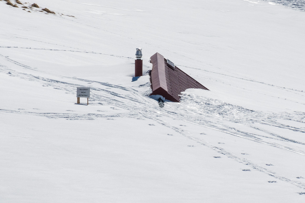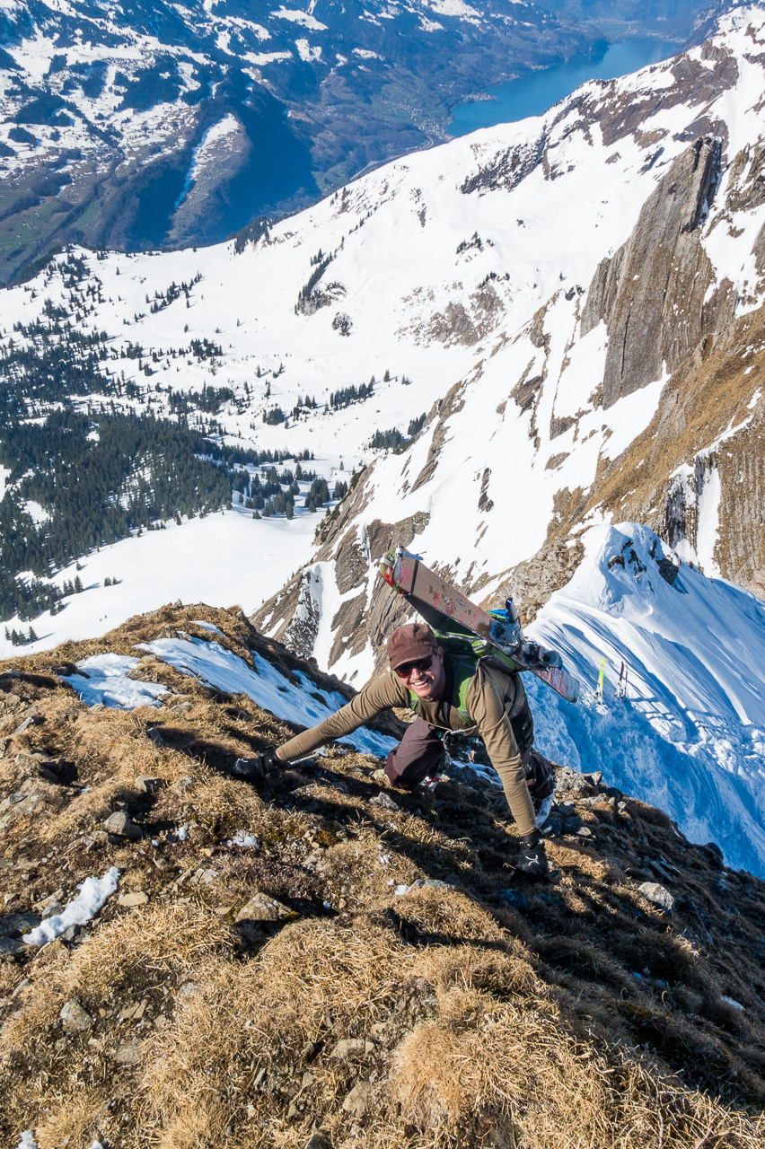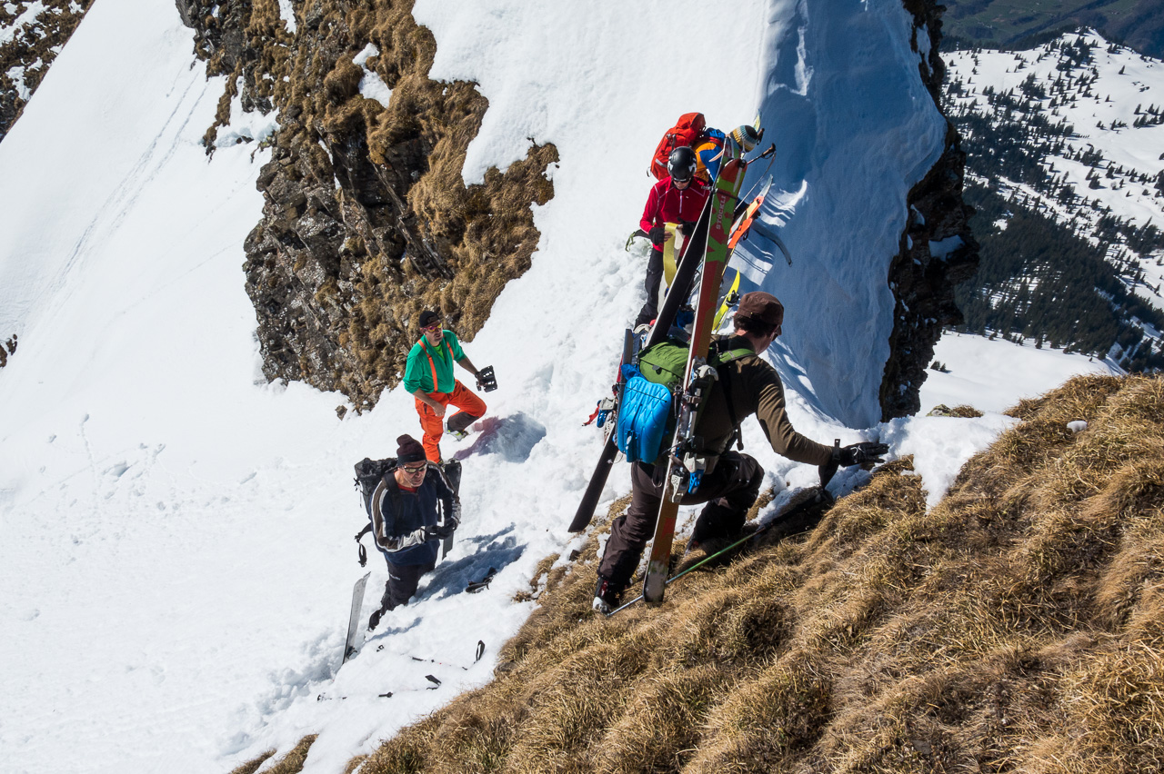 Wir steigen weiter hoch, der Blick öffnet sich ins Toggenburg. Da kann ich in Erinnerungen schwelgen, die noch gar nicht so lange her sind, zum Beispiel an die Besteigungen des Lütispitzes und des Gulme in den Herbstferien im Toggenburg. Wir traversieren den Rand einer Senke, wo am tiefsten Punkt eine Alphütte steht, jedenfalls weist das Dach, das noch knapp aus dem Schnee ragt, darauf hin. Zwischen Gross und Chli Fulfirst steigen wir hoch, auf der Scharte schnalle ich die Skier auf, während die anderen es noch konventionell probieren. Die letzten Meter arten wieder in eine Kletterei aus, aber weniger herausfordernd als jene auf die Tschaggunser Mittagspitze. Auch dieser Gipfel bietet nicht übermässig Platz, so dass wir gleich wieder auf die andere Seite absteigen zu einem Podest, das ein Kamerad gegraben hat, damit wir die Skis besser anziehen können. Das ist auch nötig, denn der Hang hat ungefähr 45 Grad Neigung.