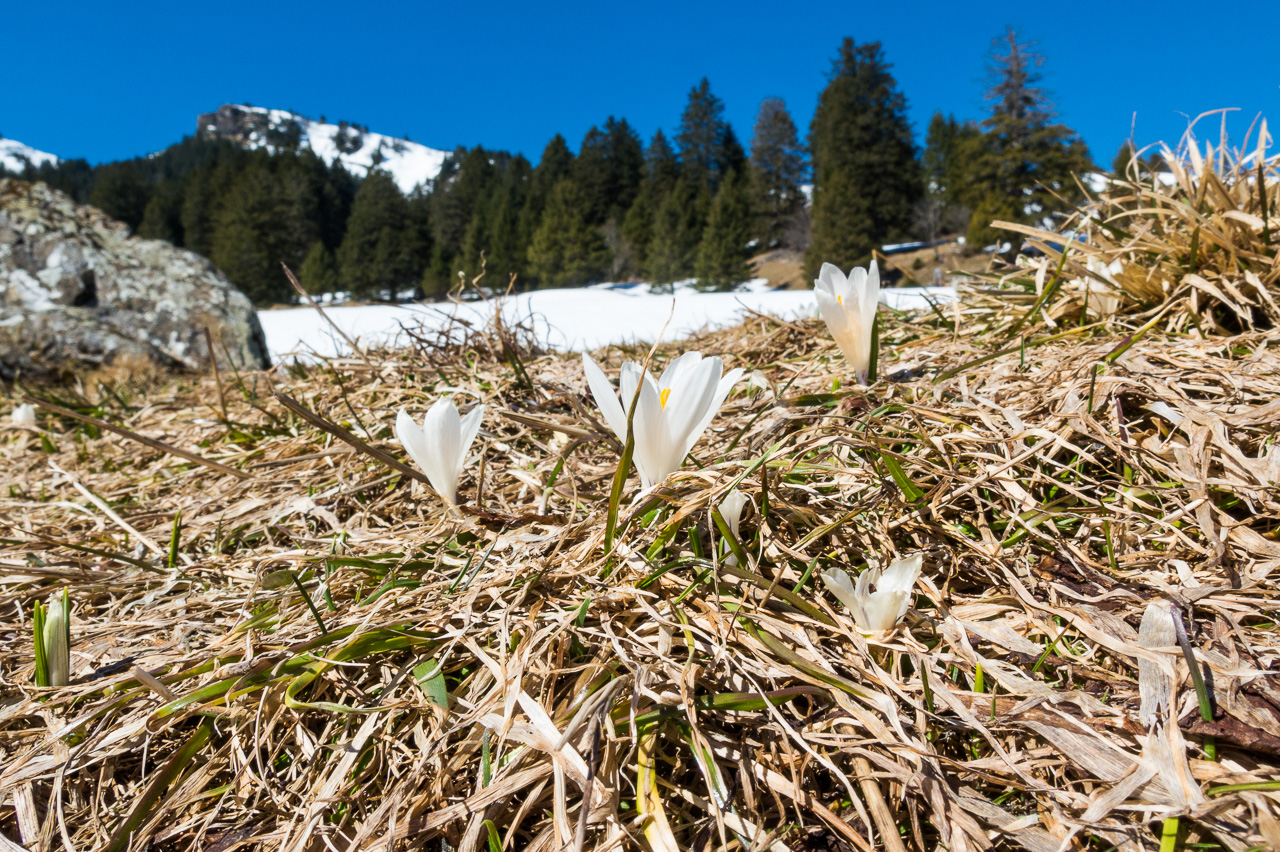 Erst als der Spass vorbei ist, machen wir Pause, ehe wir auf einer Forststrasse zurückkehren zum Berghaus. Und am Schluss künden Krokusse endgültig den Frühling an. Was für ein Finale einer sensationellen Tourenwoche! Unser ältester Teilnehmer meinte später, das sei eine der besten Tourenwoche gewesen, die er je gemacht hätte. Und das waren viele!