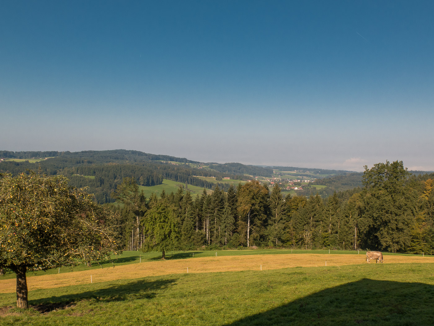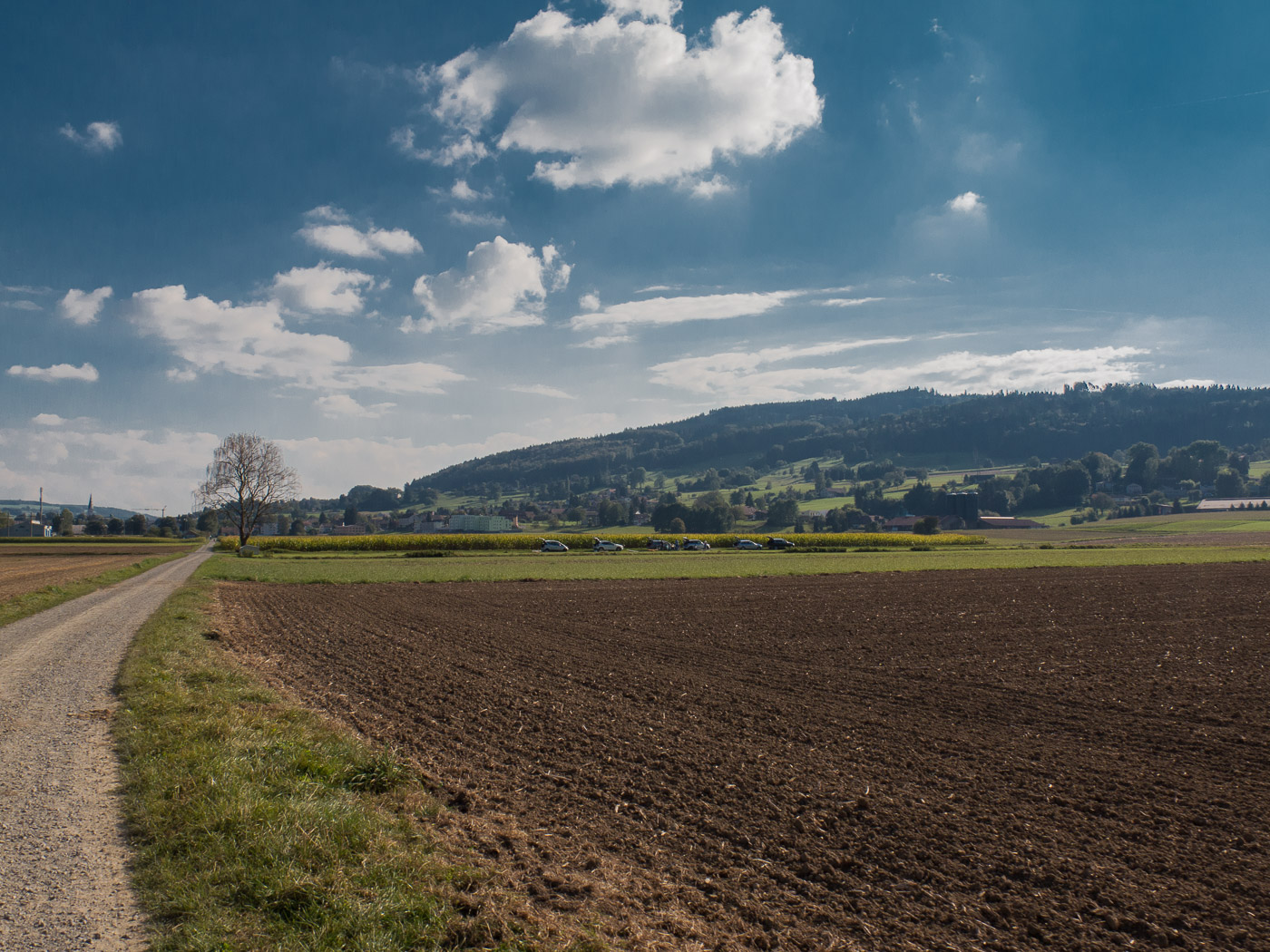 Bei schönstem Herbstwetter fahren wir auf dem Radweg, einer ehemaligen Eisenbahnstrecke, Richtung Beromünster, bei Winon drehen wir rechts ab und fahren hoch, durch den Wald, ein Stück Feld, dann wieder kurz Wald, weiter zum Bogetehof. Von hier sieht man den Stierenberg in seiner ganzen Grösse. Nun, das ist jetzt schon ganz dick aufgetragen. Er ist zwar der höchste „Berg“ im Kanton Aargau, aber mit 872 Meter doch sehr bescheiden.