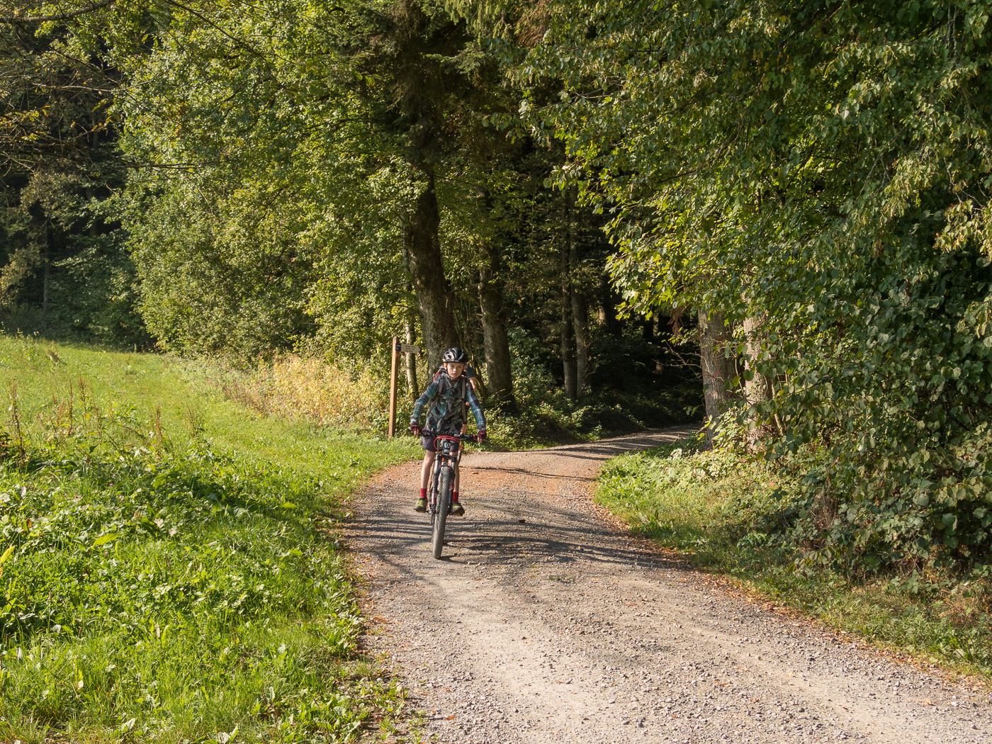 Nun denn, das tut der Schönheit der Tour natürlich keinen Abbruch, wir fahren über einen Feldweg weiter nach Niederwil und Rickenbach, wo es jetzt richtig zur Sache geht. Kontinuierlich steigt die Strasse an. Rückwärts blickend erkennen wir im Dunst den Pilatus, einiges näher den Landessender. Bei Hinter Sterenberg haben wir die maximale Höhe schon fast erreicht. Leicht ansteigend fahren wir weiter zur Chanzel, mit 812 Meter der Scheitelpunkt unserer Tour. Nun lassen wir es krachen, im Nu sind wir bei der Knabenrütihütte unten. Dort zweigt ein Singletrail rechts ab, den wir natürlich nehmen, der Ältere voraus, den ich dann erst bei der nächsten Hütte, der Waldhütte Reinach, wieder sehe. Das ist gleichzeitig unser Zwischenziel, der SAC Homberg führt dort einen geselligen Anlass durch.