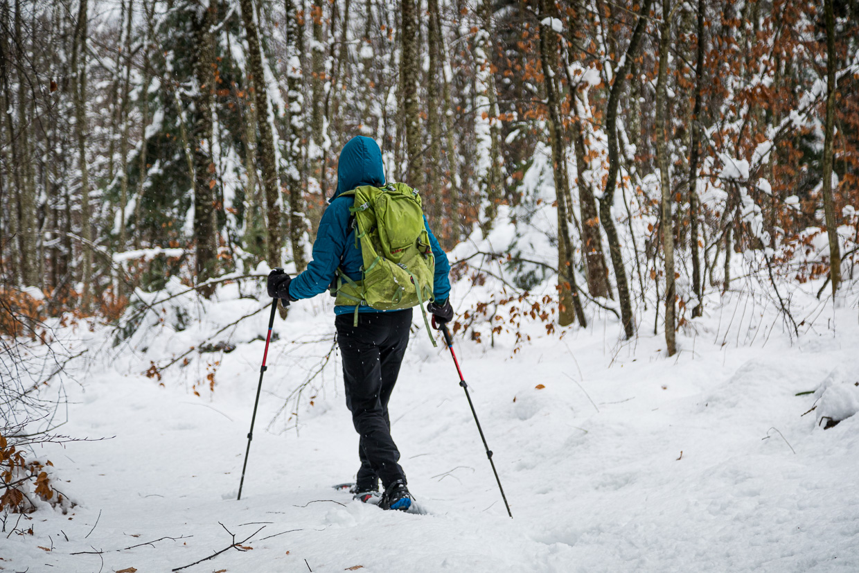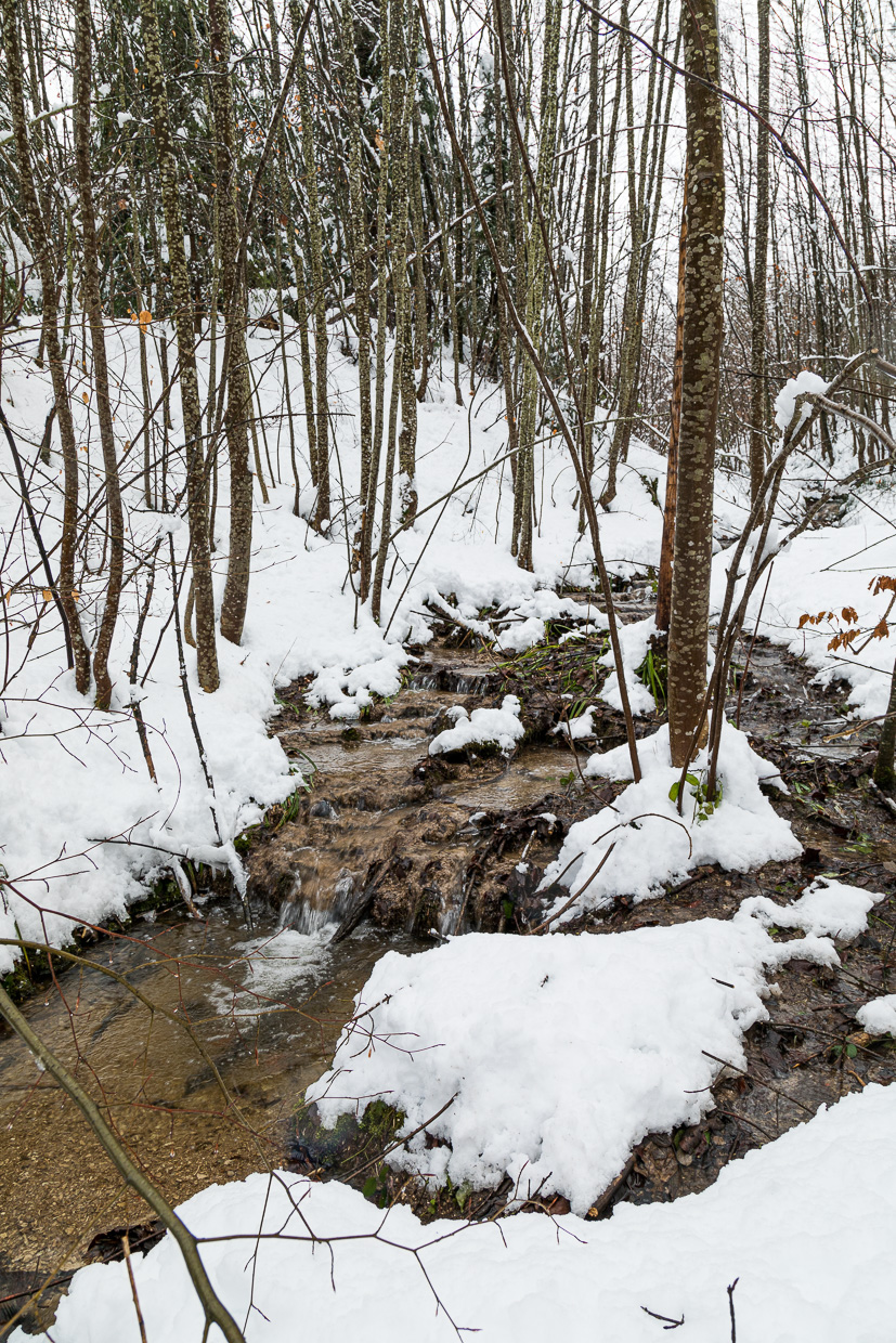 Leider war Tauwetter, es tropfte von den Bäumen. Aber es lag so viel Schnee, dass das noch nicht ins Gewicht fiel. Ich hatte mir schon eine Route ausgesucht, wählte einen Weg, den ich noch nie gegangen war. So war ich sicher, dass wir alleine waren. Tatsächlich hatte es immer weniger Spuren, je tiefer wir in den Wald wanderten. Irgendwann hörten sie ganz auf, das war der Moment, um die Schneeschuhe anzuziehen. Es war ganz still, wir waren mausbeinallein. Kleine Bäume ragten in den Weg hinein, niedergedrückt durch den nassen Schnee und nun festgefroren. Wir befreiten sie, sie schnellten hoch. In der Nähe rief ein Schwarzspecht, ein Mäusebussard hockte hoch oben auf einem Baum.