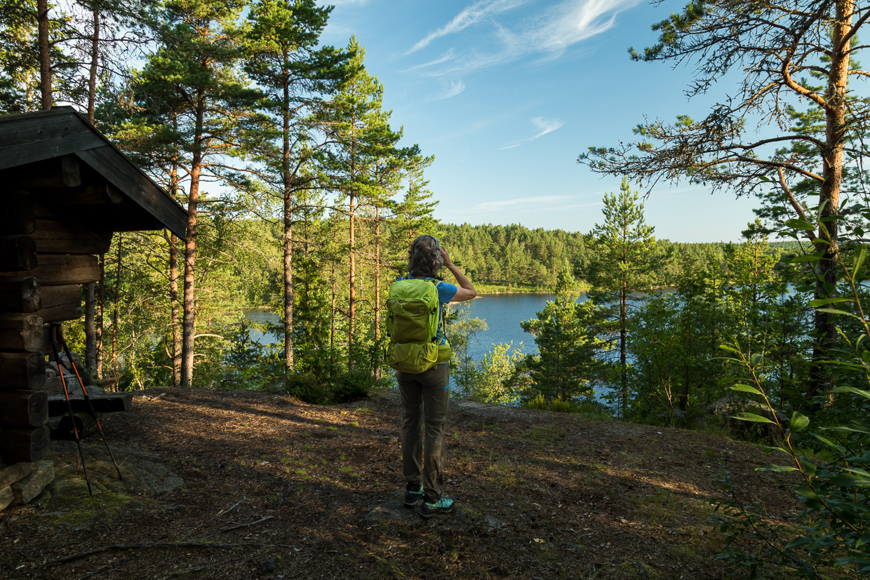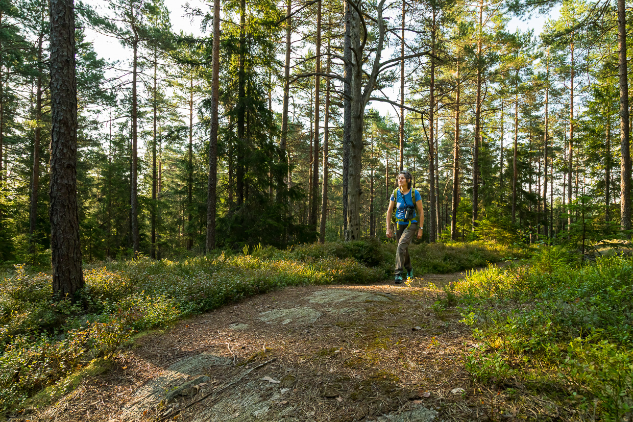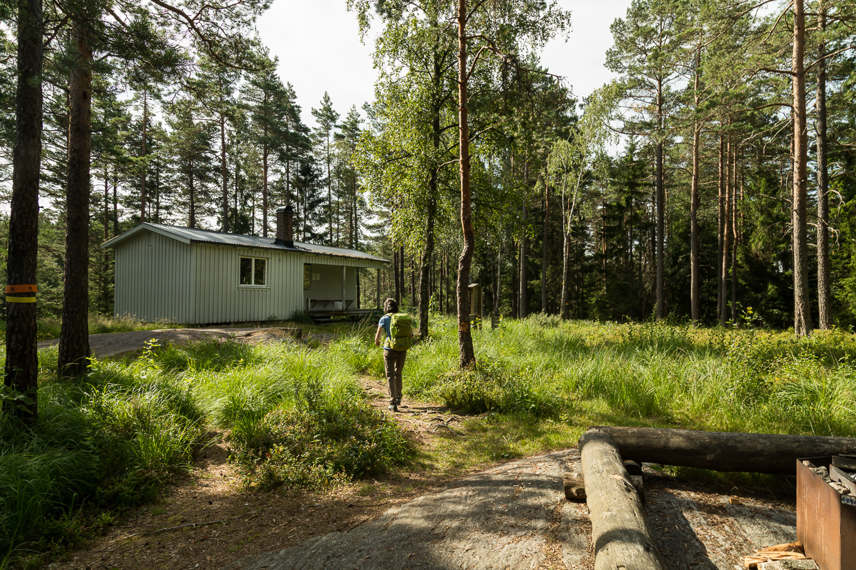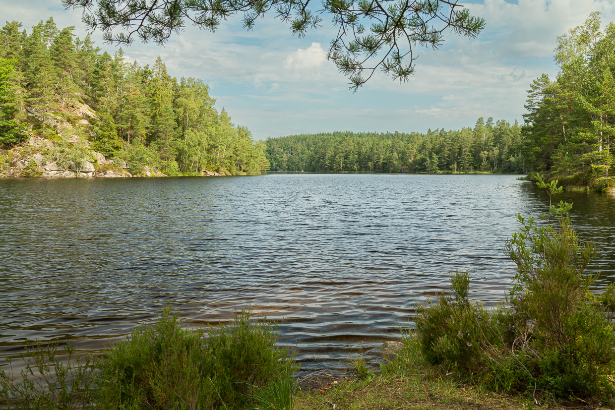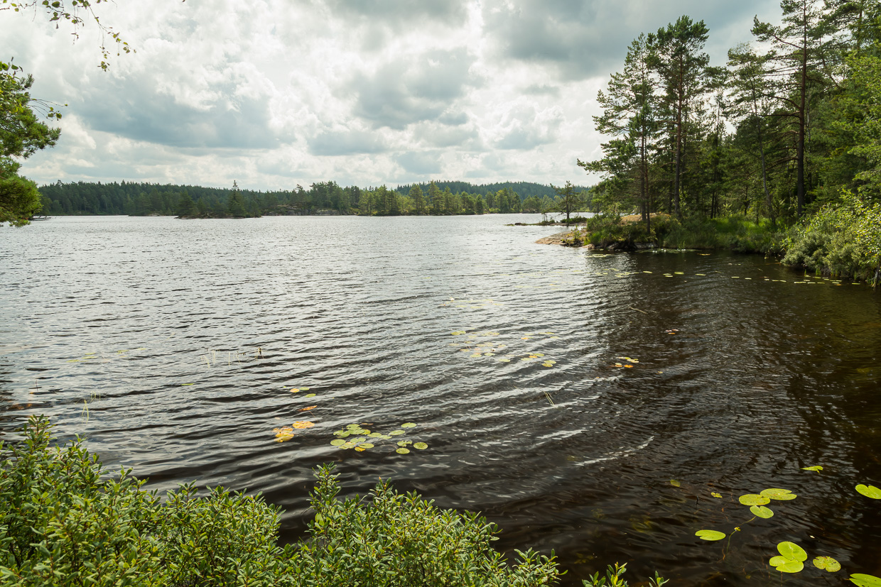 Beim Unterkunftswechsel wollten wir nicht einfach von A nach B fahren, sondern unterwegs noch etwas unternehmen. Da bot sich das Kynnefjäll an, eine typische Wald- und Seenlandschaft in Schweden. Nach ein paar Irrungen erreichen wir den Ausgangspunkt. Um halb sieben starten wir zur Wanderung. Es ist still, wir sind still. Durch lichten Föhrenwald, erreichen einen See, wo es einen Unterstand gibt zum Übernachten. Diese Unterstände gibt es überall verteilt auf den grossen Wanderwegen.