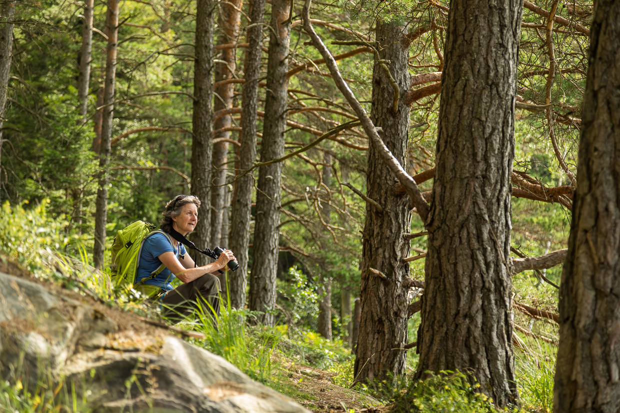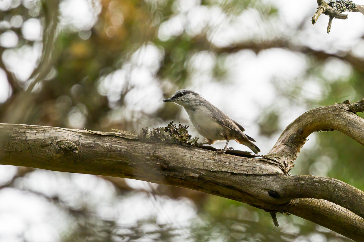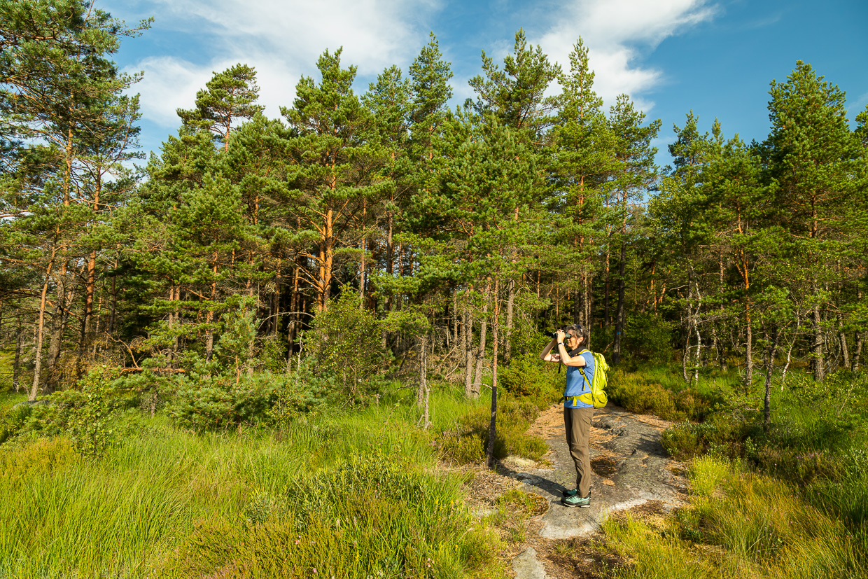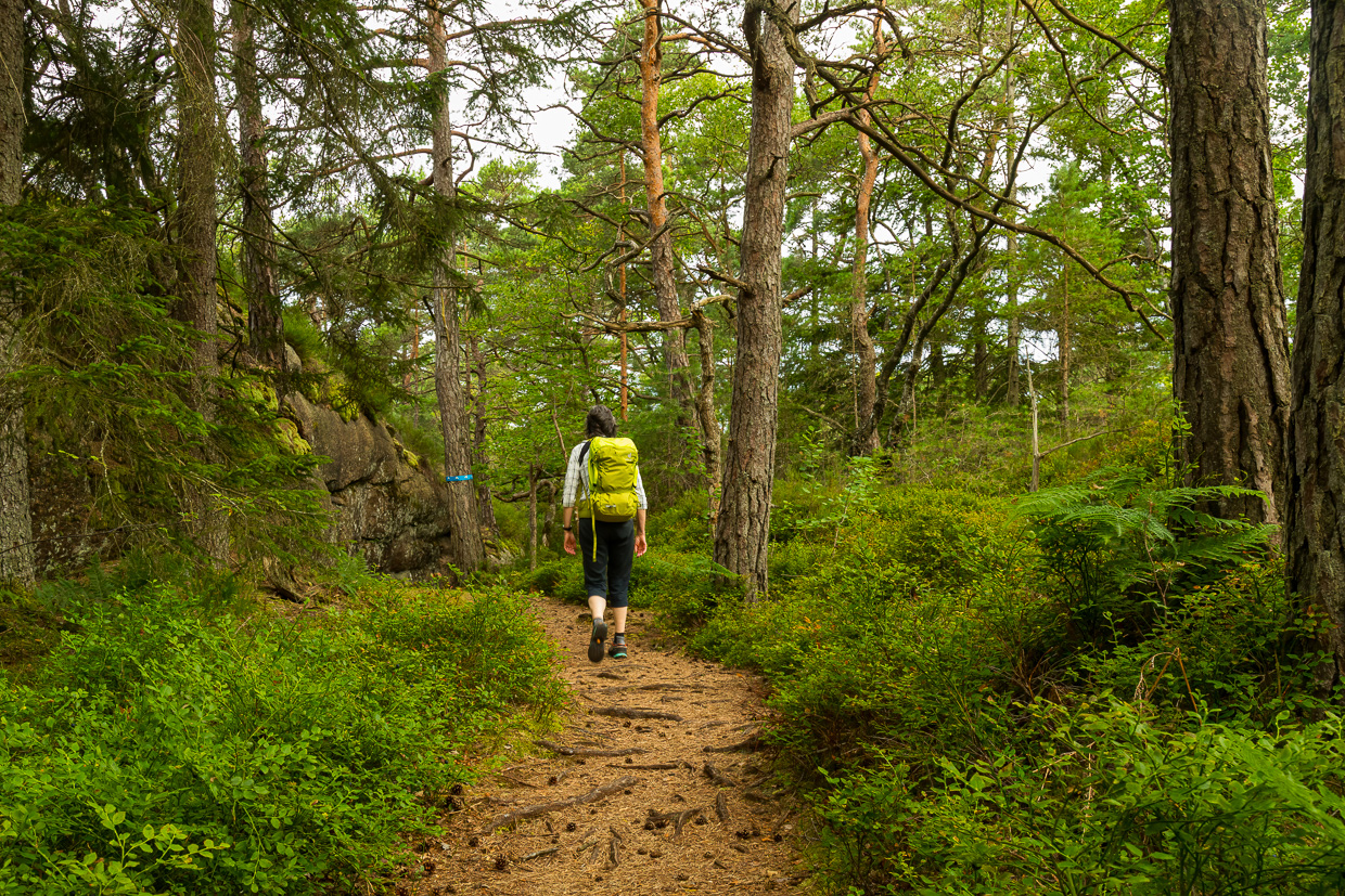 Statt dem Wegweiser folgt die Route nun der Strasse an eine Bucht. Wir üblich hoffen wir hier Sterntaucher oder wenigstens Prachttaucher zu finden. Vergeblich. Dafür müssen wir nun einer Überlandstrasse ohne Trottoir folgen. Das scheint so ein Komoot-Ding zu sein, dass die Routen immer ein Stück weit Strassen entlang führen, jedenfalls war es noch bei jeder der Fall, die wir gewandert sind. Zum Glück können wir bald abbiegen in den Wald und steigen dort hoch, wo wir wieder auf den ausgeschilderten Wanderweg treffen. Wir wandern durch einen schönen Föhrenwald, zwischendurch haben wir Ausblick auf die Umgebung.