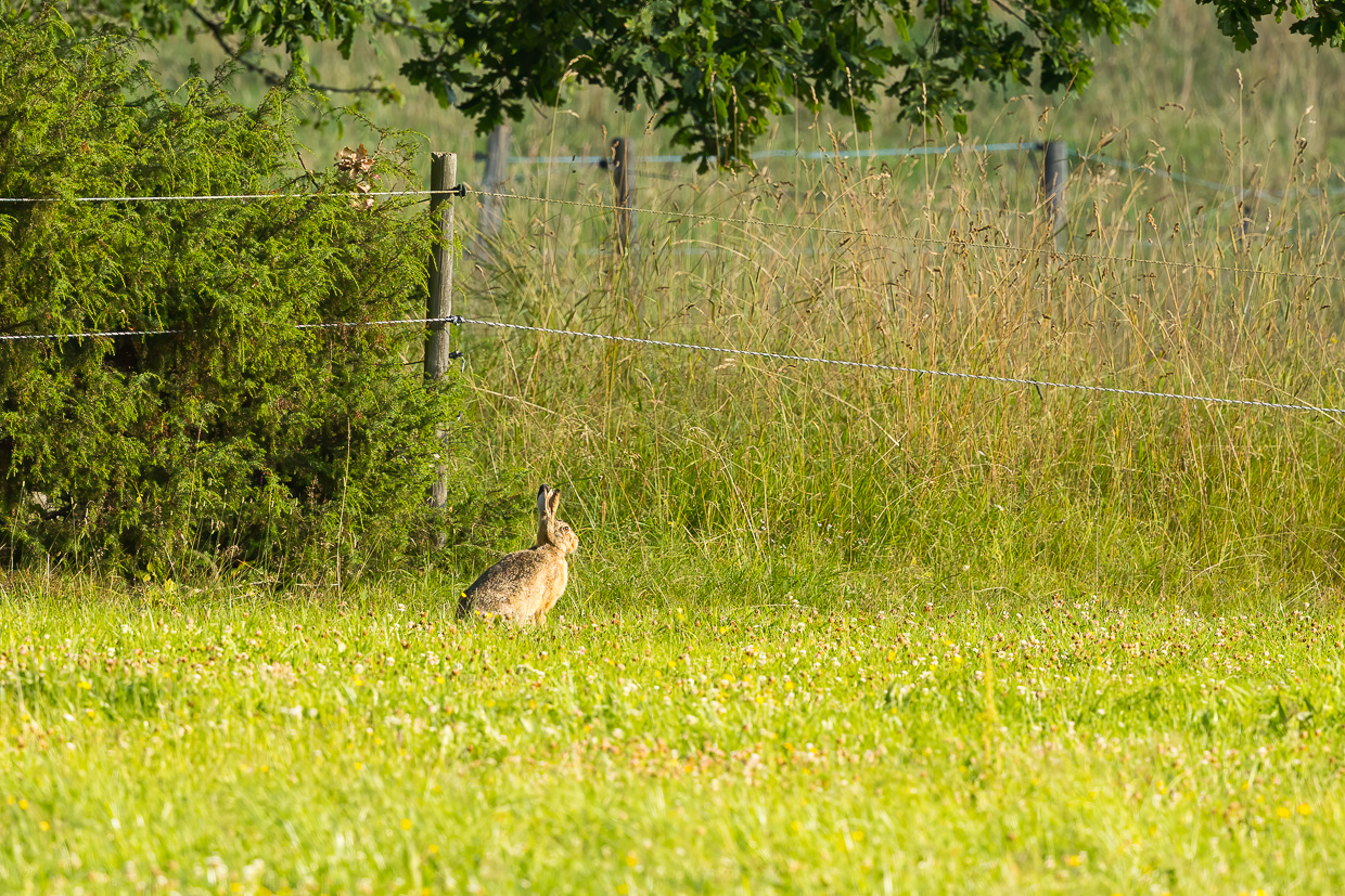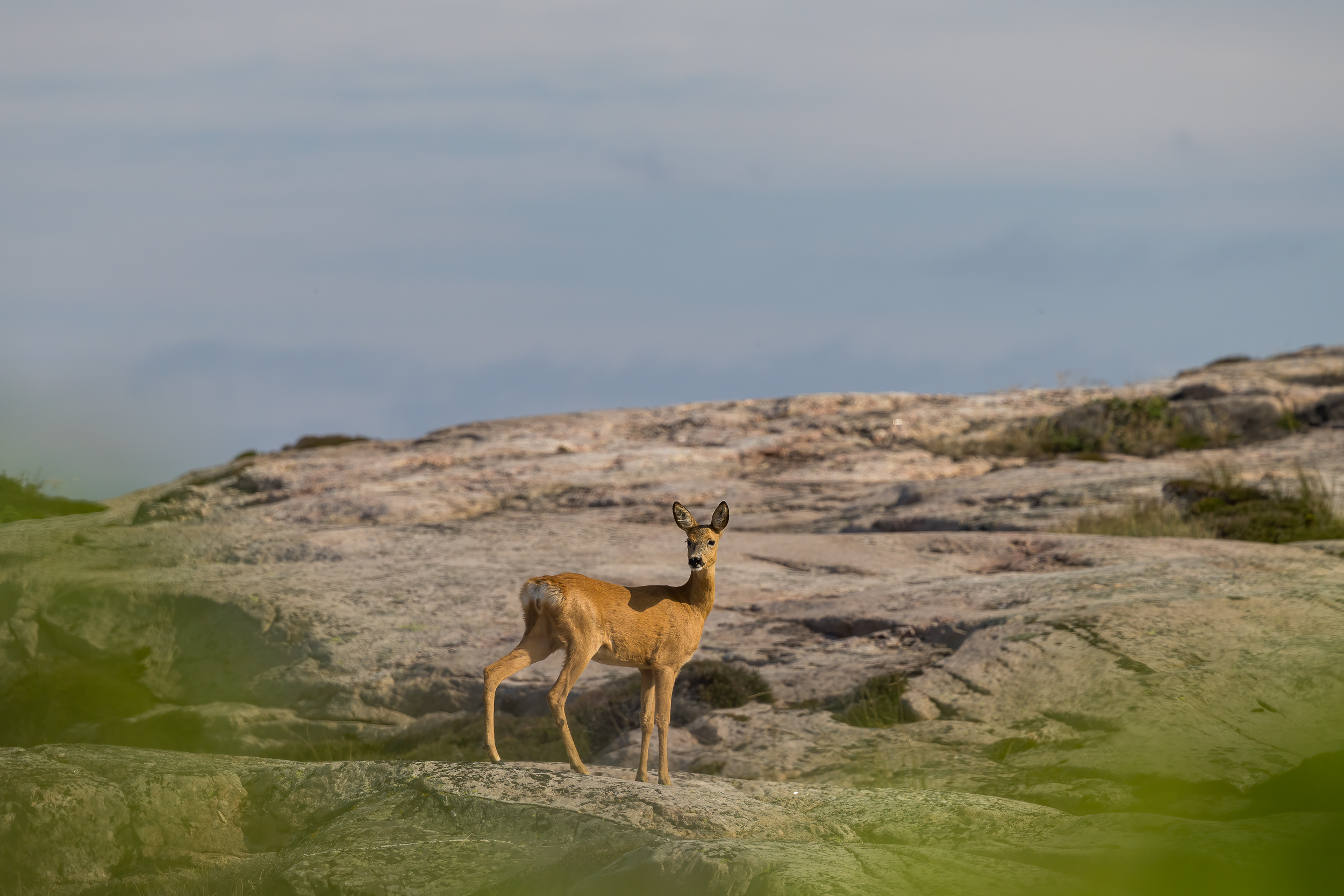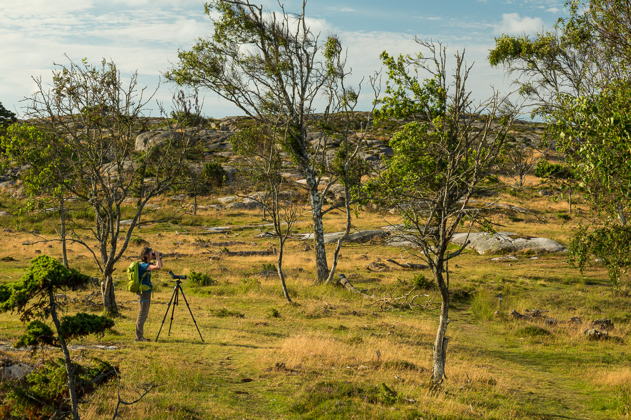 Der erste Ausflug an die Küste führt uns ins Tjurpannans Naturreservat an der Schärenküste. Wir parkieren bei einem Campingplatz, wo wir praktischerweise das Auto laden können (wir haben ein EV gemietet). Schon auf der Weide vis-à-vis hoppeln Hasen. Wir wenden uns der Küste zu. Die Bäume, die auf der Wiese wachsen, deuten auf zeitweise heftigen Wind hin. Es ist das ideale Habitat für Feldlerchen, die hier ihre Singflüge veranstalten.