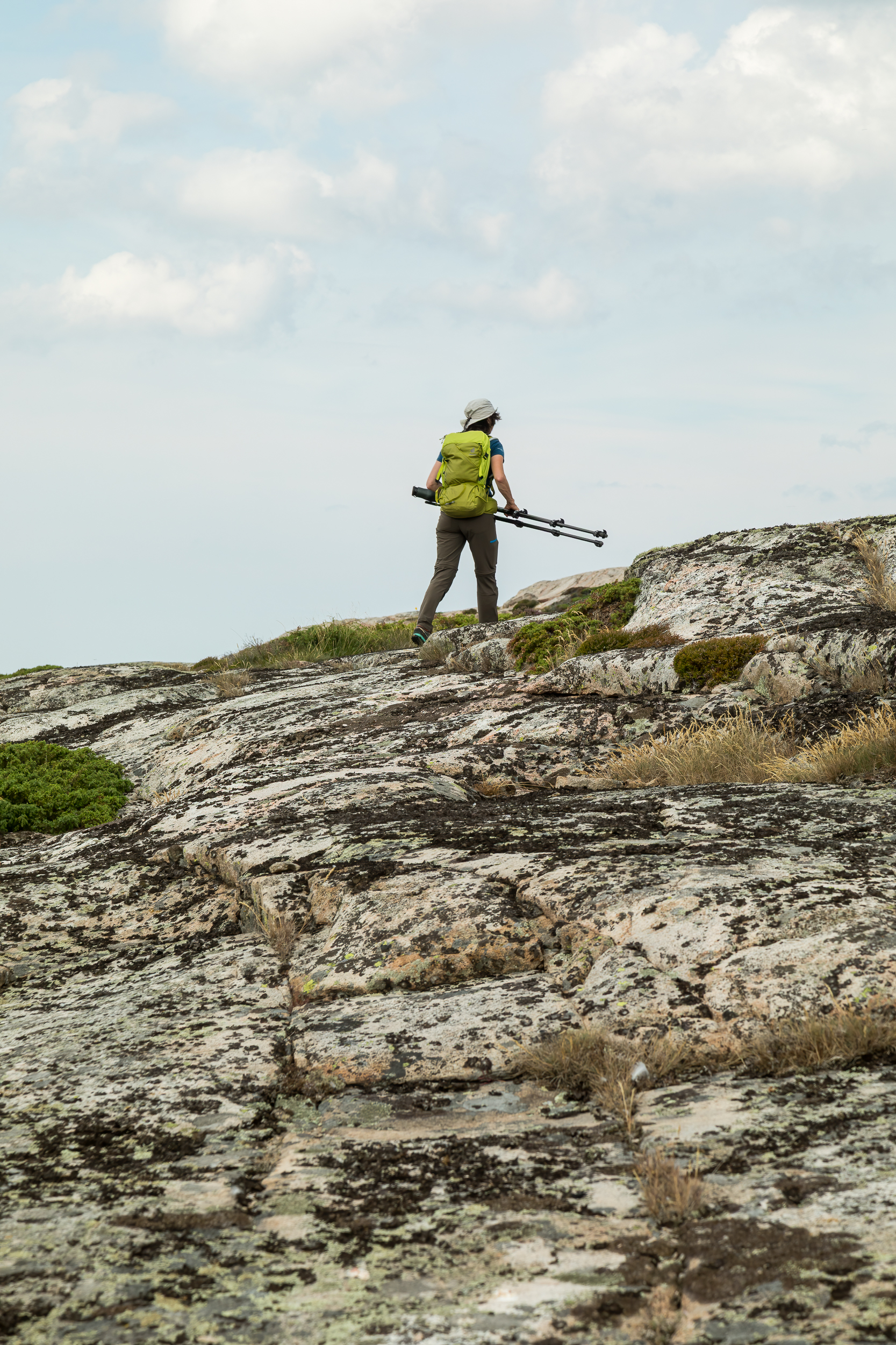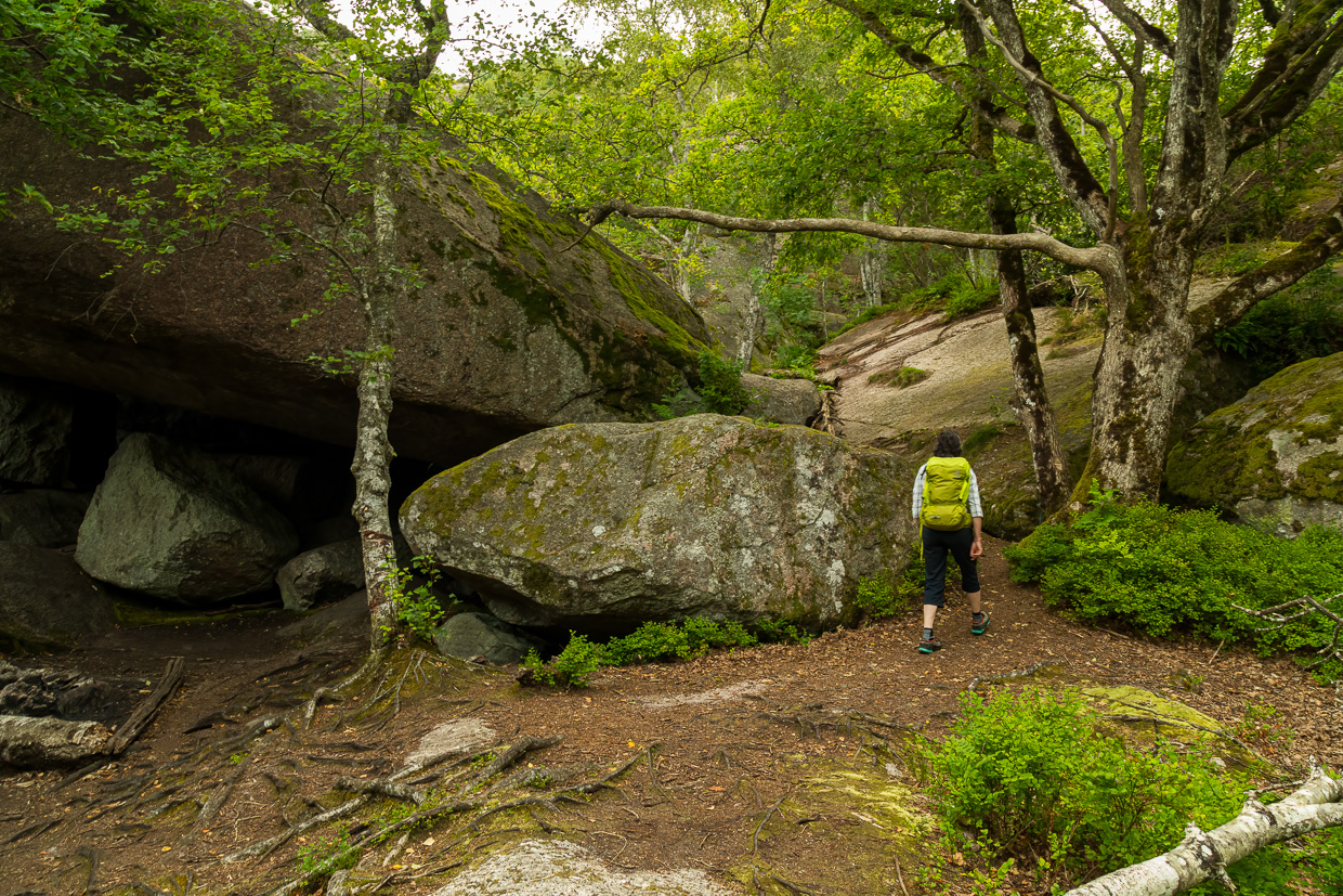 Eine Zusatzschlaufe führt auf den höchsten Punkt, das lassen wir uns natürlich nicht nehmen. Steil geht es bergan. Irgendwann ist nicht ganz klar, wo der Weg nun weiter geht. Ich gehe zwischen den Felsen hoch, sehe aber keine Markierung, dafür stehe ich nun am Fuss einer Felsplatte. Sieht nicht schwierig aus, ich steige hoch. Macht Spass, so Reibungskletterei! Allerdings brauche ich die Hände gar nicht, es ist nicht so steil. Bald stehe ich oben und treffe dort auf den Weg. Offensichtlich war ich nicht auf dem richtigen, aber schön war er. Wir geniessen die Aussicht, bevor wir wieder den Abstieg in Angriff nehmen.