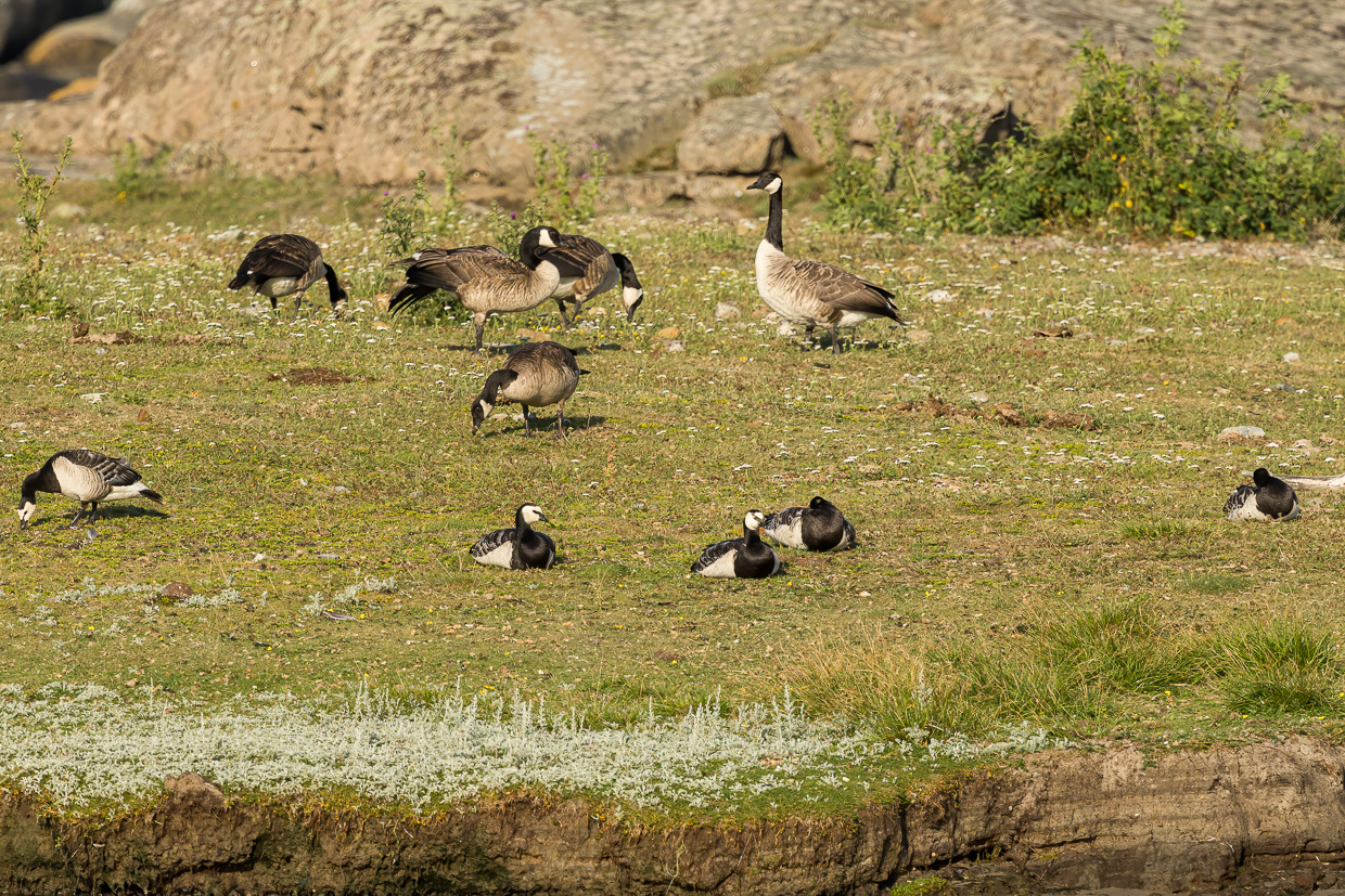 Grosshamn ist ein Vogelberingungsstation im Naturreservat Ramsvikslandet. Alleine das weckte unsere Neugier, so dass wir früh am Morgen dort hinfahren. Wir sind vor allem auf die Seevögel gespannt, die man hier finden soll. Zuerst entdecken wir aber Weisswangengänse zwischen den Kanadagänsen. Dorngrasmücken, Wiesenpieper und Bachstelzen trifft man überall an. Wir gehen zur Küste, wo bereits drei Personen mit Fernglas aufs Meer schauen. Es sind Einheimische, und zumindest der eine kennt sich mit Vögeln aus. Er weisst uns auf die Krähenscharbe hin, weit draussen auf einem Felsen. Ah ja, jetzt sehe ich sie. Alleine hätte ich sie vermutlich übersehen. Wie immer am Meer schwimmen zahlreiche Eiderenten. Aber da sind auch Vögel, die ich bis jetzt nicht gesehen habe, weisser Flügelfleck, ansonsten schwarz und mit roten Beinen. Gryllteisten! Das ist eine der Seevogelarten hier, ich mache den Einheimischen darauf aufmerksam. Er zuckt nur mit den Schultern, für ihn sind sie nichts besonderes, ich hingegen freue mich wie ein kleines Kind.