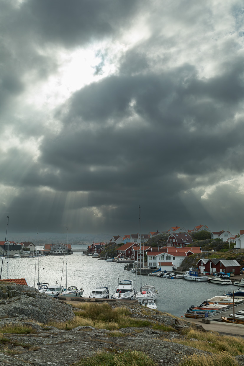 Der Himmel ist bedeckt und es windet, als wir losfahren Richtung Klädesholmen. Dazu müssen wir über die grosse Brücke fahren, die von Norums Holme aus so fotogen ausgesehen hat. In Klädesholmen werden die Strasse immer enger, wir fahren bald durch enge Gässchen, aber das scheint der richtige Weg in den Hafen zu sein. Tatsächlich erreichen wir den, es stürmt. Nun sind die Parkplätze hier gebührenpflichtig, zahlbar aber nur mit Swish, dem schwedischen Pendant zu Twint, das wir natürlich nicht haben. Wir klemmen deshalb das Geld mit einem Zettel unter den Scheibenwischer: „Wir sind Schweizer Touristen und haben kein Swish.“ Na ja, alles war noch da, bis wir wieder abfuhren.