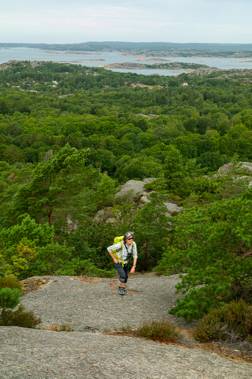 Wir spazieren der felsigen Küste entlang, auf dem Wasser sind viele Segel- und Motorboote unterwegs, aber kaum Vögel. Auf dem Meer schwimmen Eiderenten, die häufigste Entenart an schwedischen Küste, jedenfalls während unseres Aufenthaltes. Kormorane sieht man auch überall, ebenso Möwen, vor allem Silbermöwen, aber auch Heringsmöwen. Ein Reh taucht auf aus den Büschen, läuft über den Felsen. Auch wir steigen die Felsen hoch, sind in vertrautem Gelände unterwegs, allerdings auf Meereshöhe. Da kommen von hinten drei Mountainbiker, die hier die Felsen hoch fahren. Respekt! Wir kommen oben an, haben eine herrliche Aussicht aufs Meer. Lange halten wir uns aber nicht auf, kehren wieder zurück zum Auto, das unterdessen aufgeladen ist.