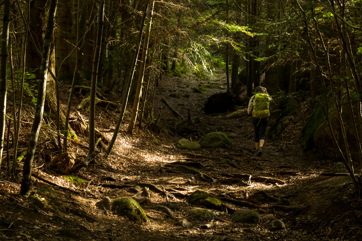 Wir kommen an eine Verzweigung auf dem Wanderweg. Ein Plakat spricht eine deutliche Warnung aus, dass der eine Weg gerade nicht unterhalten wird und entsprechend nicht so toll zu begehen ist. Gesperrt ist er aber nicht, also nehmen wir diesen Weg. Es geht abwärts, ist dreckig und nass. War’s das? Sieht so aus, jedenfalls ist der weitere Weg gut zu gehen. Aber dann stehen wir an einer überschwemmten Fläche. Nach der vergeblichen Suche nach einer Alternative versuchen wir es über die Äste und Stämme, die schon jemand bereit gelegt hat. Trockenen Fusses erreichen wir die andere Seite.