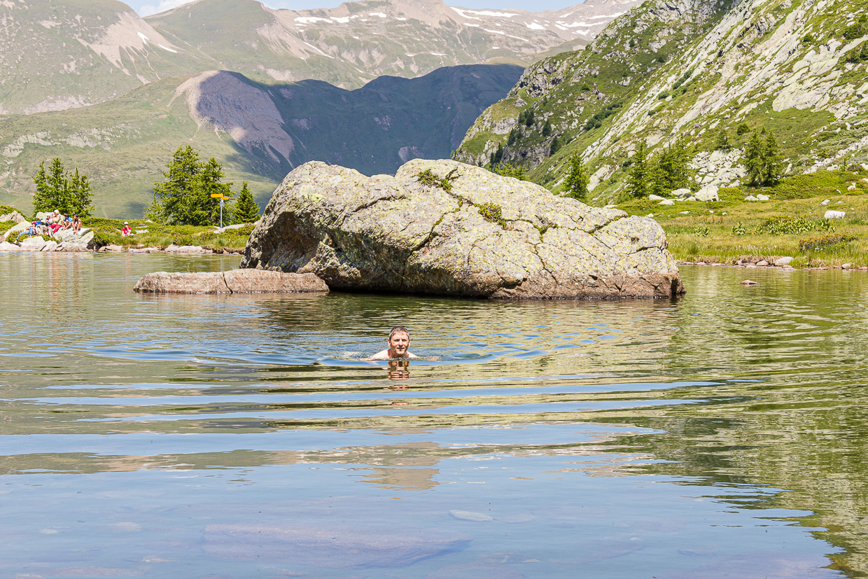 Zugegeben, schwimmen mit Kaulquappen mag nicht jedermanns Geschmack sein, aber die Tierchen sind völlig harmlos. Die Kinder jedenfalls werden sich freuen. Und während sie plantschen, können die Eltern die wunderschöne Landschaft geniessen und ebenfalls mit der Jungmannschaft einen Schwumm wagen. Bis wir aber an diesem Ziel sind, steht uns noch ein steiler Aufstieg durch eine urchige, immer wieder wechselnde Landschaft bevor.