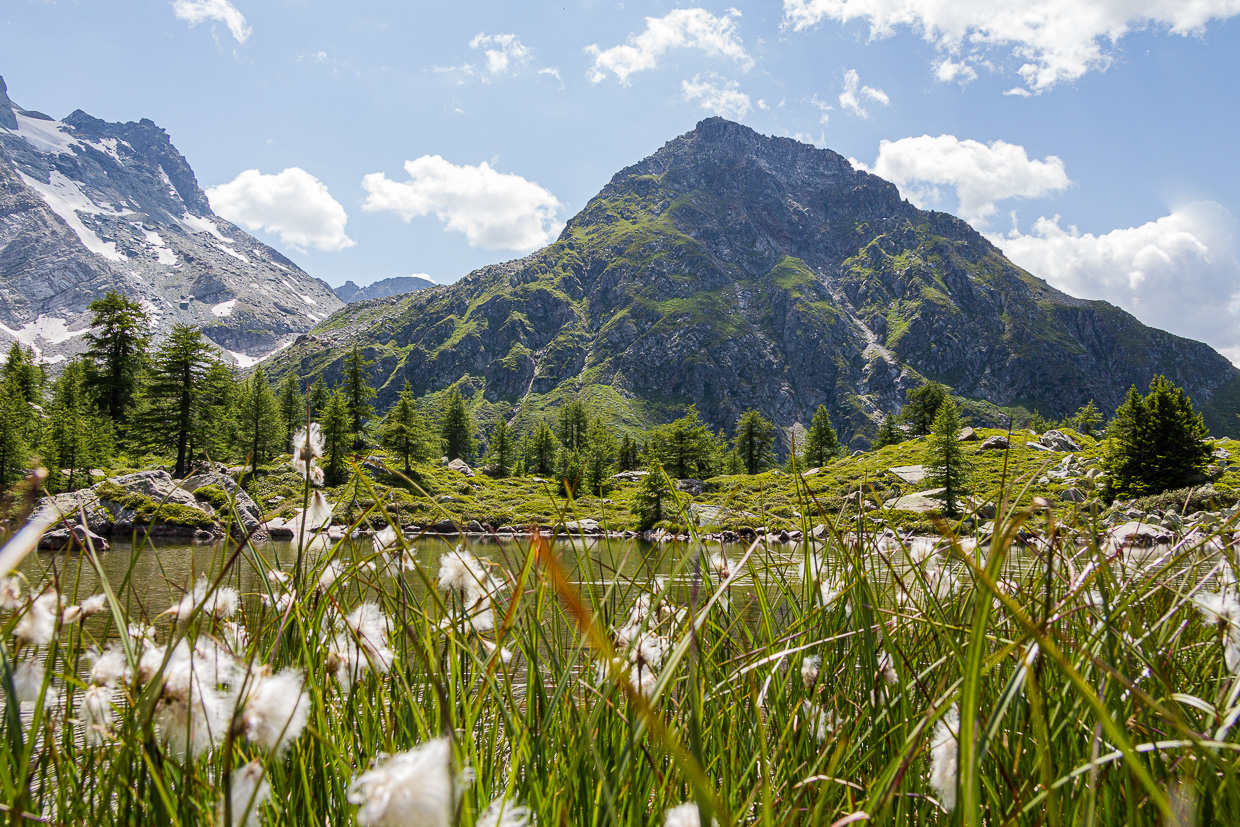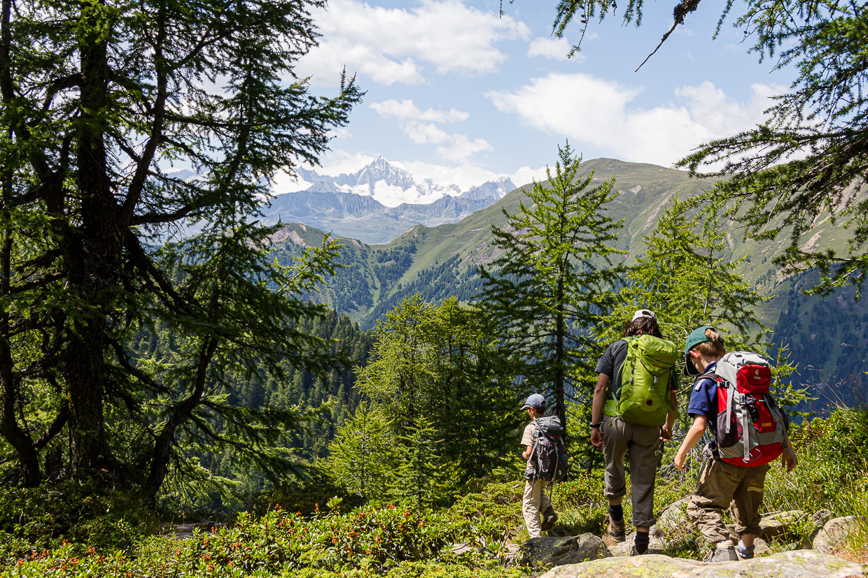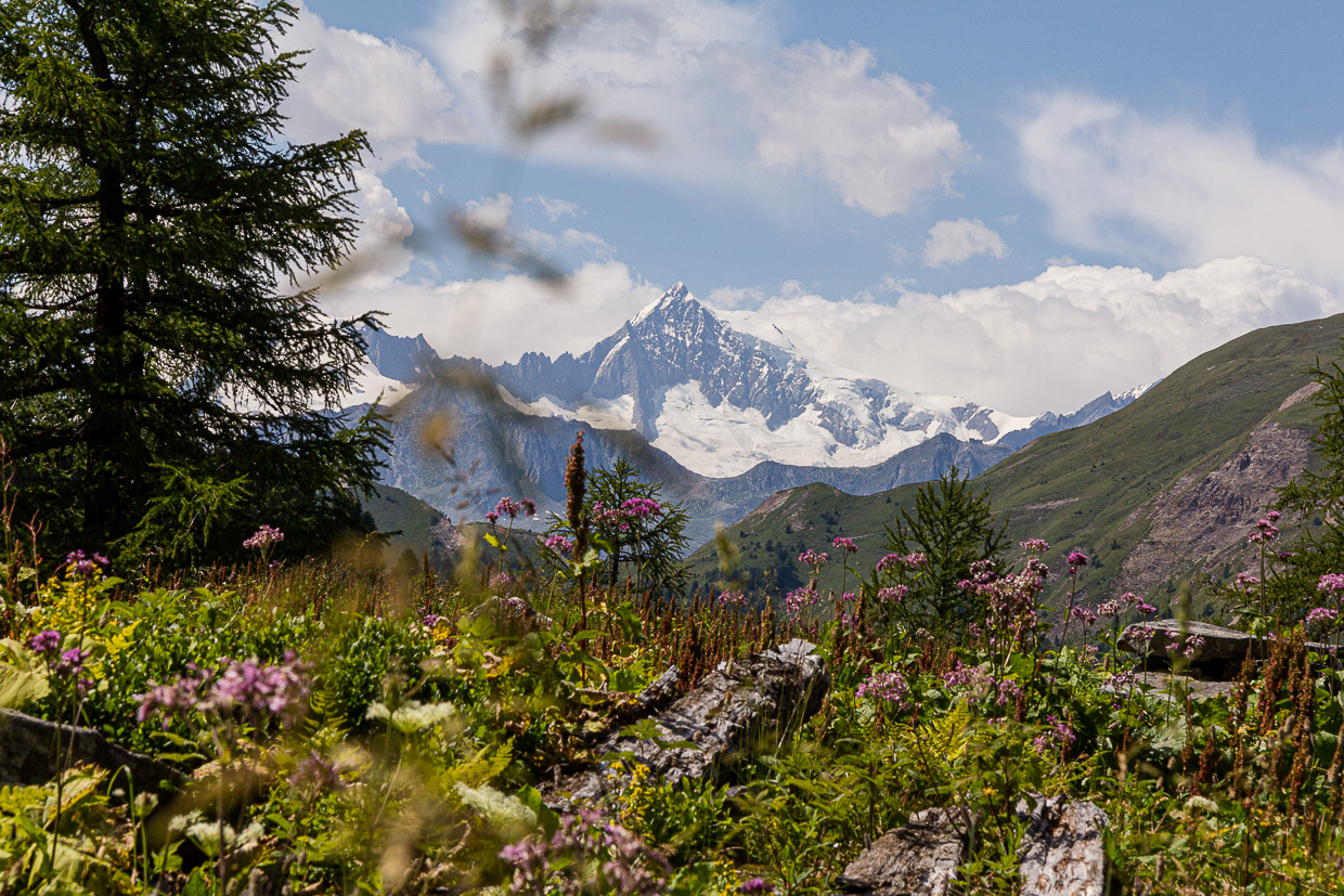 Nun ändert sich die Landschaft. An die Stelle des dunklen Fichtenwaldes tritt lichter Lärchenwald. Dieser bietet genug Licht für viele schöne Blumen wie den Purpurenzian und Schmetterlinge. Immer wieder sind Murmeltiere zu hören, sehen tun wir jedoch keine. Bei „Schäre“ folgen wir direkt dem Wegweiser zum Mässersee. Dominierten vorher Bergwiesen mit Gras und Blumen, finden wir hier vor allem Alpenrosen und Heidelbeeren vor. Auch die Bäume werden immer weniger, so dass wir nun noch weiter blicken können. Das Aletschhorn überragt am Horizont die anderen Berge, wir sehen den Oberaargletscher und das Nesthorn.