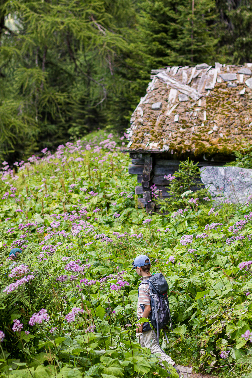 Nach einer langen Pause machen wir uns wieder an den Abstieg. Bei „Schäre“ zweigen wir rechts ab Richtung „Alter Mässerchäller“. Die Weiden verganden auch hier allmählich, was aber so gewollt ist im Zusammenhang mit dem Landschaftspark Binntal. Wir treffen auf verfallene Alphütten, Zeugen bäuerlichen Wirtschaftens.