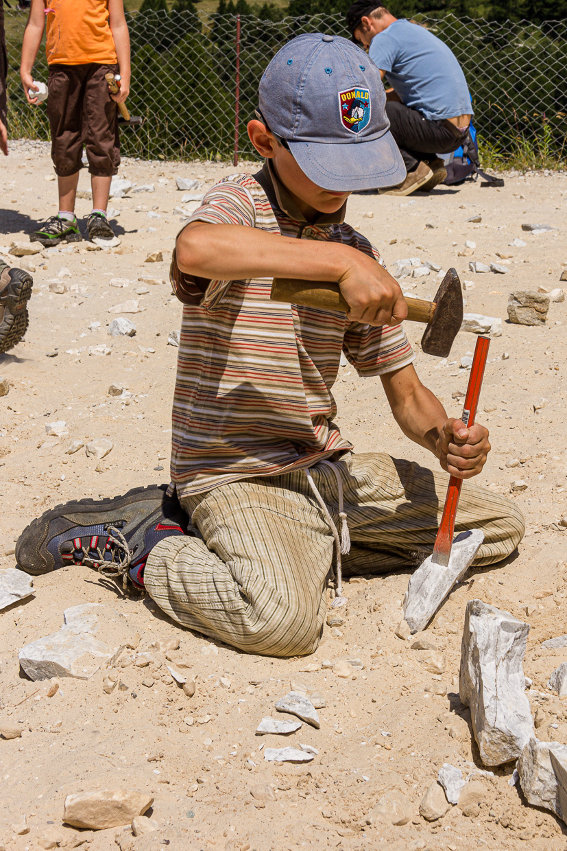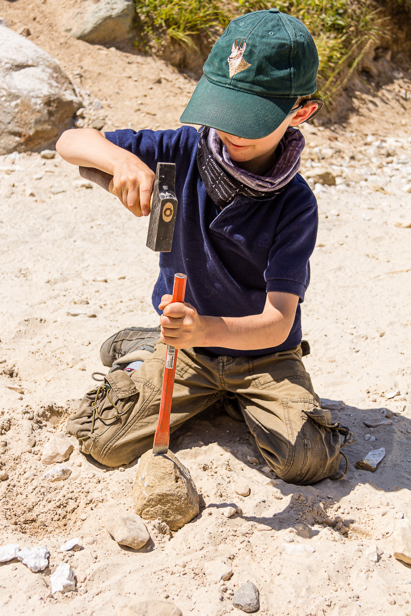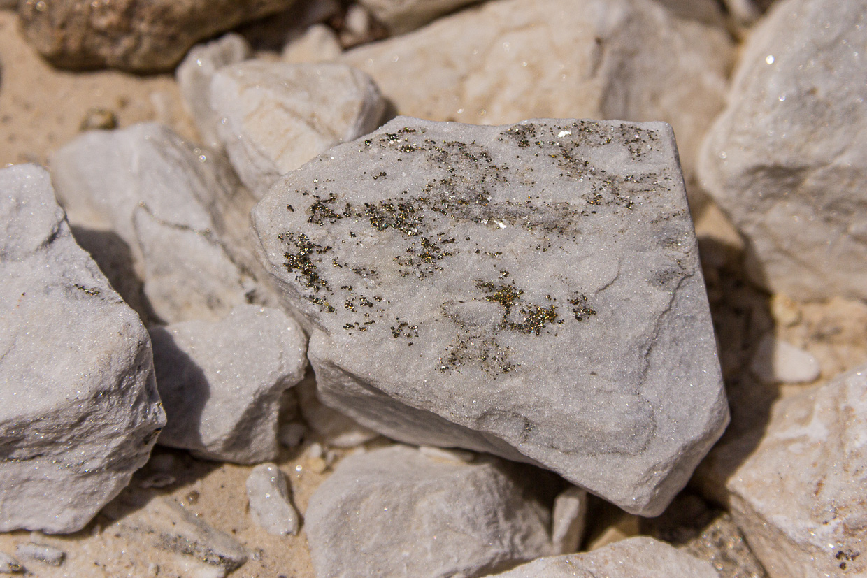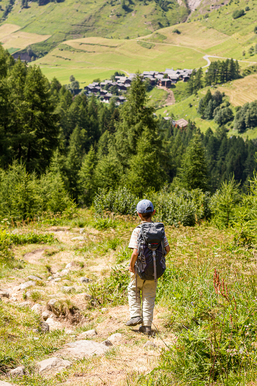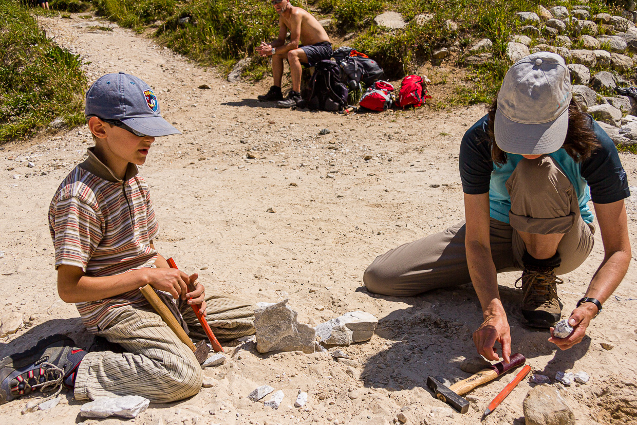 Wir erreichen die Mineraliengrube Lengenbach. Hier können die Kinder (und auch Erwachsenen) den Abraum nach Schätzen durchsuchen. Am häufigsten findet man hier den weissen, körnigen Dolomit, der mit Pyrit – auch als Katzengold bekannt – durchzogen ist. Zum Glück ist es mit dem gefüllten Rucksack nicht mehr weit bis Fäld, wo wir die Tour im strategisch günstig gelegenen Restaurant abschliessen.