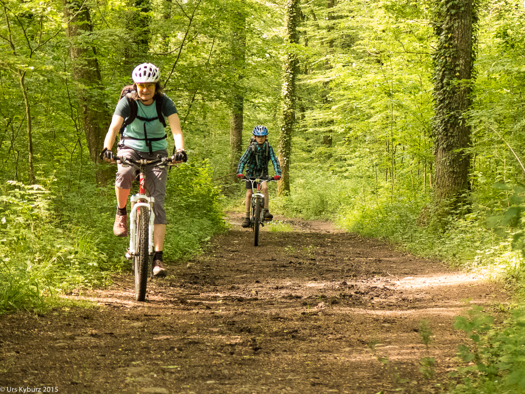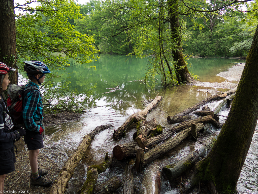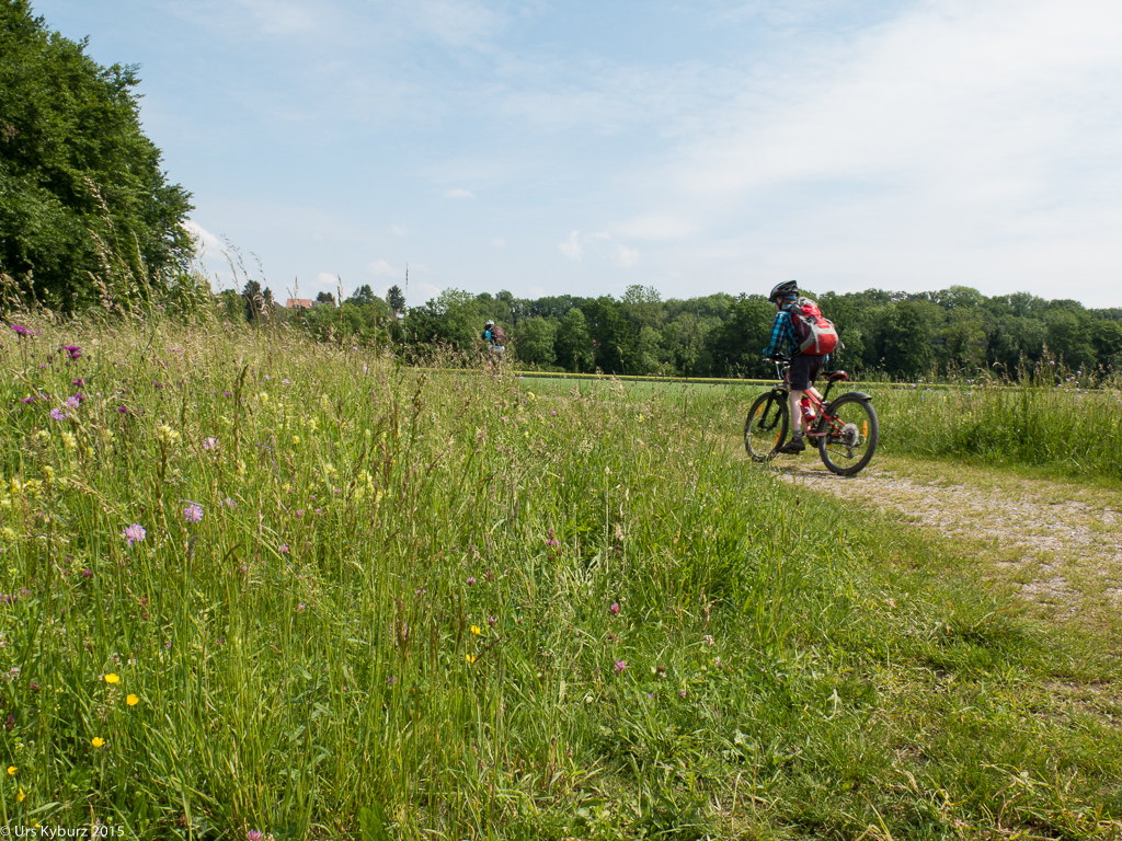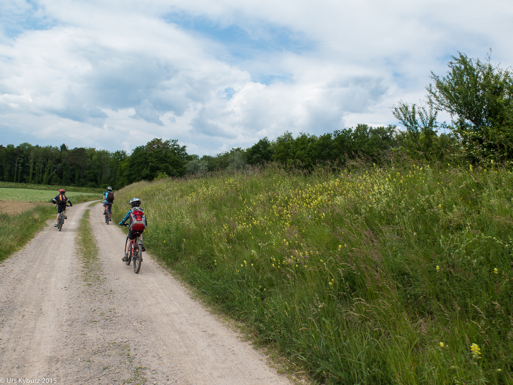 Wir sind nun auf der Rheinroute, der Nummer 2. Wie so Velofahrer. Zum Glück fahren wir nicht allzu lange auf der Strasse, schon bald nach Rheinau biegt der Radweg rechts in einen Feldweg. Und es geht wieder mal hinunter an den Rhein. Plötzlich eine Verzweigung: Links Veloweg, rechts steht „Wurzelweg“ auf dem gelben Wegweiser. „Papa, fahren wir rechts?“ Klar, schiesslich haben wir Rechtsverkehr :-). Und der Name ist Programm. Es rüttelt und schüttelt über die Wurzeln, dass es eine Freude ist. Ich bleibe einmal kurz stecken, und schon sind die Kinder weg. Auf dem Radweg warten sie wieder. „Das war cool!“, war die Reaktion der Kids. Schon bald verzweigt der Weg wieder. Natürlich fahren wir wieder rechts auf dem Singletrail, diesmal flowig durch einen schönen, lichten Föhren- und Eichenwald. Herrlich! Aber die Kinder sind natürlich schon wieder ausser Sichtweite. Erst am Ende des Waldes, wo der Weg wieder breit und somit langweilig ist, sehen wir sie wieder.