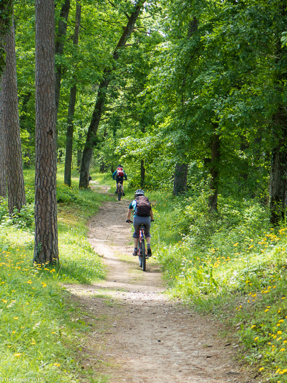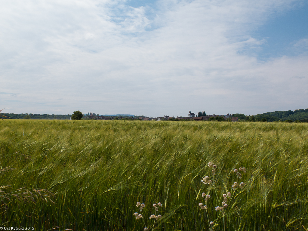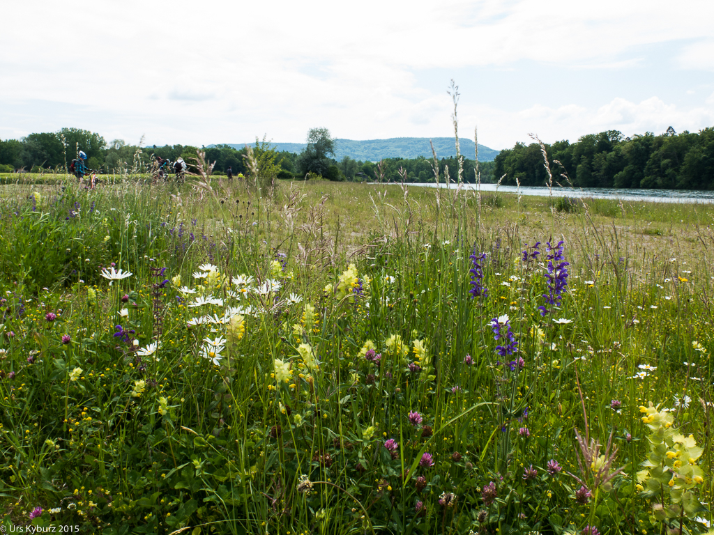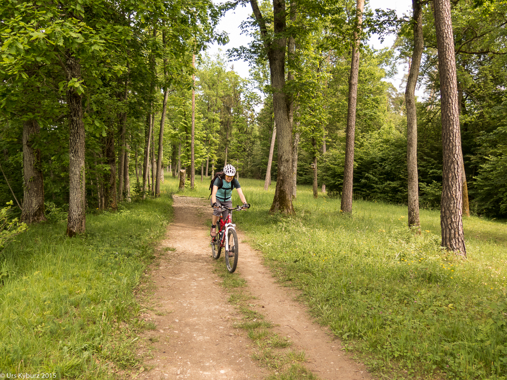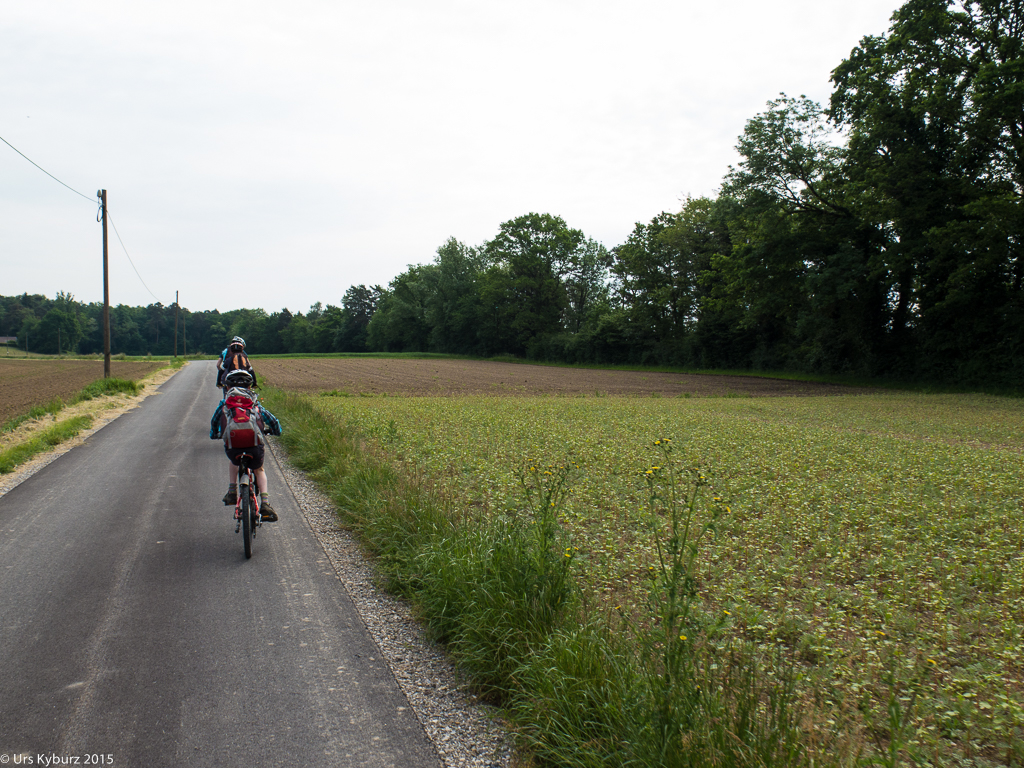Wir sind nun auf der Rheinroute, der Nummer 2. Wie so Velofahrer. Zum Glück fahren wir nicht allzu lange auf der Strasse, schon bald nach Rheinau biegt der Radweg rechts in einen Feldweg. Und es geht wieder mal hinunter an den Rhein. Plötzlich eine Verzweigung: Links Veloweg, rechts steht „Wurzelweg“ auf dem gelben Wegweiser. „Papa, fahren wir rechts?“ Klar, schiesslich haben wir Rechtsverkehr :-). Und der Name ist Programm. Es rüttelt und schüttelt über die Wurzeln, dass es eine Freude ist. Ich bleibe einmal kurz stecken, und schon sind die Kinder weg. Auf dem Radweg warten sie wieder. „Das war cool!“, war die Reaktion der Kids. Schon bald verzweigt der Weg wieder. Natürlich fahren wir wieder rechts auf dem Singletrail, diesmal flowig durch einen schönen, lichten Föhren- und Eichenwald. Herrlich! Aber die Kinder sind natürlich schon wieder ausser Sichtweite. Erst am Ende des Waldes, wo der Weg wieder breit und somit langweilig ist, sehen wir sie wieder.
