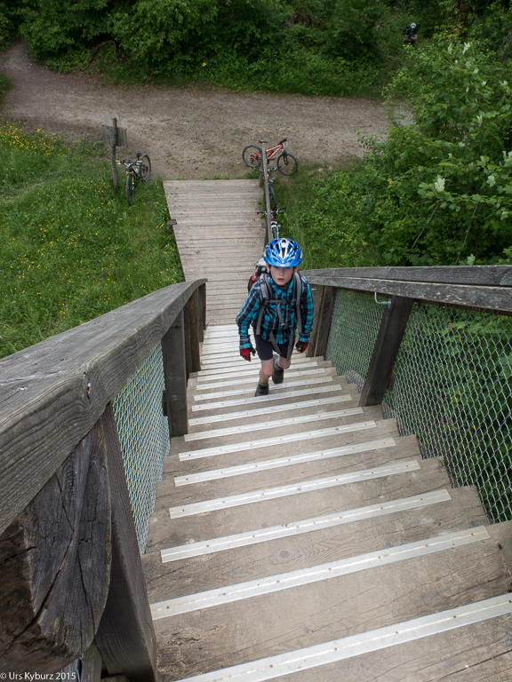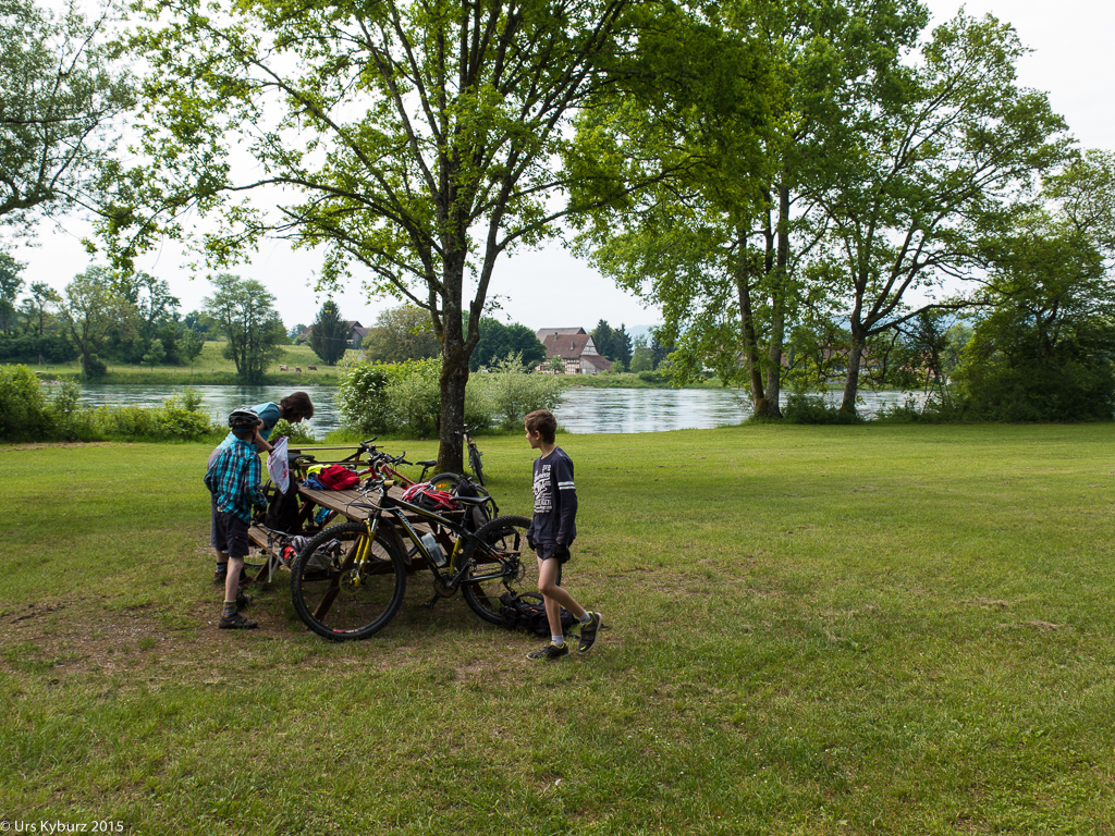 Auf der Weiterfahrt kommen an einem Hide vorbei. Wir schauen schnell rein (ohne Feldstecher sowieso nicht so das Wahre), entdecken einen Silberreiher. Durch die Thurauen fahren wir zurück, nehmen den einen oder anderen Singletrail mit. Ein Turm erlaubt den Blick auf die Mündung der Thur in den Rhein. Das nächste Ziel ist nun aber endgültig der Zeltplatz. Und eine tolle Biketour nimmt ihr Ende.