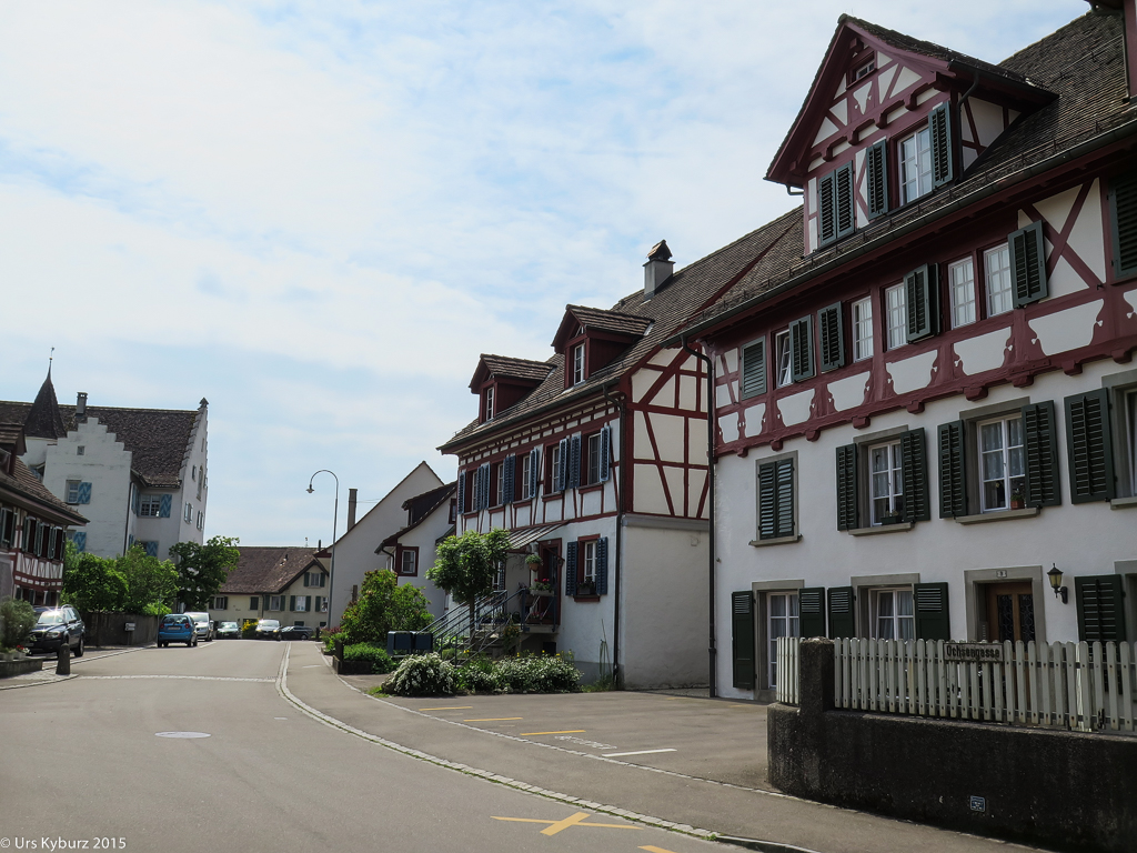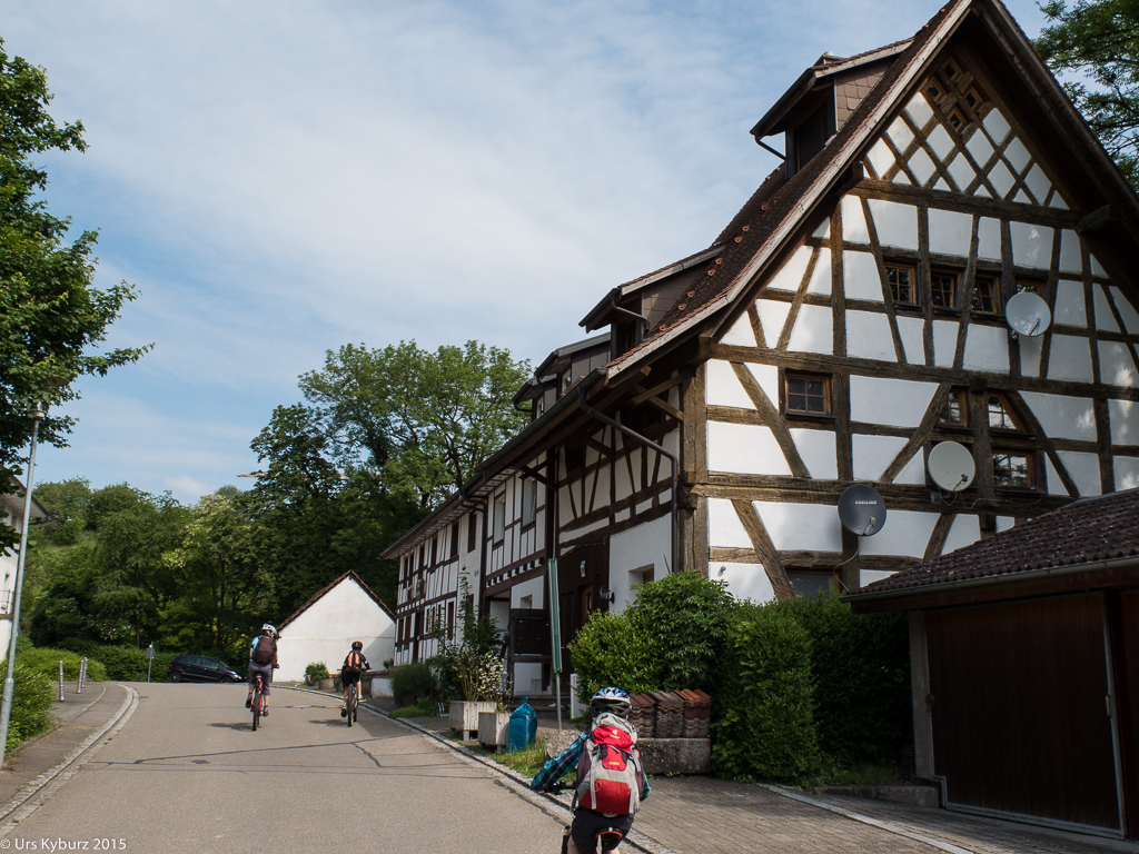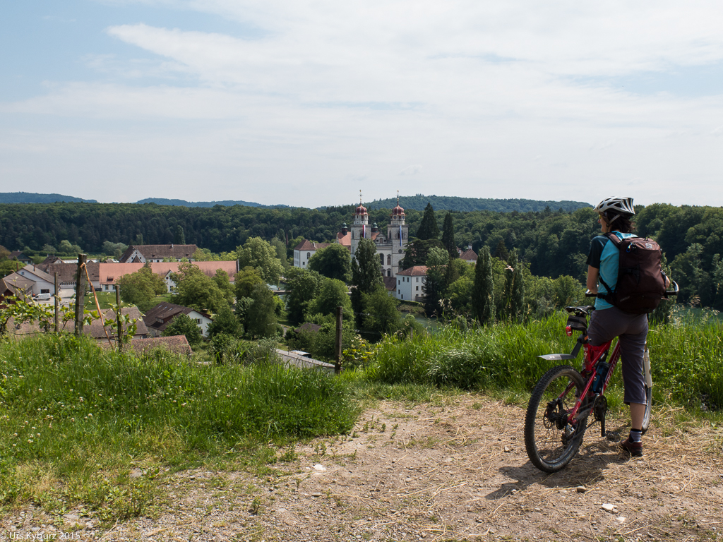 Und schon erreichen wir die Brücke bei Rheinau, die uns wieder in die Schweiz führt. Statt direkt auf der anderen Seite wieder retour zu fahren, nehmen wir den ganzen Weg rund um die Halbinsel unter die Räder. An einem gemütlichen Ort ausserhalb des Dorfes ist die Mittagsrast fällig. Ich stelle fest, dass nun auch die Akkus leer sind im GPS. Und keine Ersatz-Akkus dabei. Das passt ja zum heutigen Tag. Nach der Pause fahren wir auf dem nächsten Singletrail hinunter an den Rhein, allerdings ist der Weg eher langweilig, da schön flachgewalzt und gesplittet. Es macht trotzdem Spass. Beim ehemaligen Kloster Rheinau schauen wir ebenfalls vorbei, bevor wir wieder retour fahren.