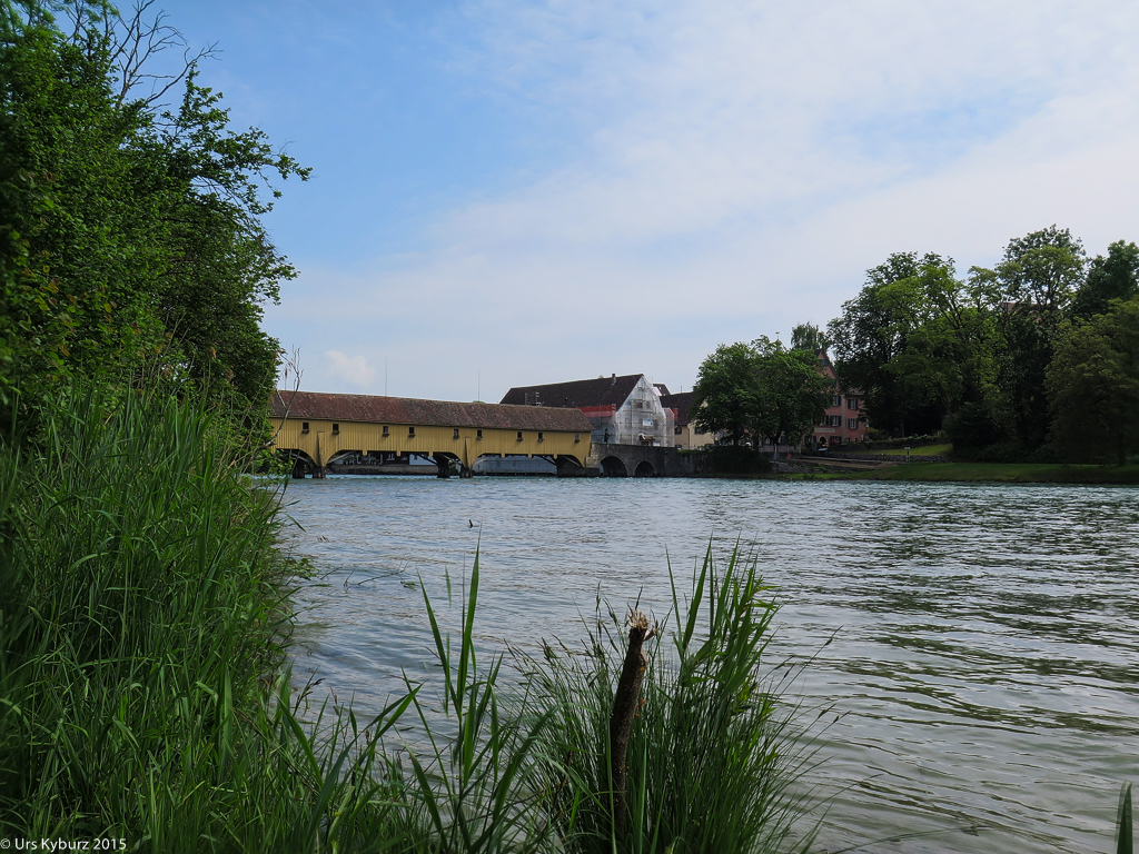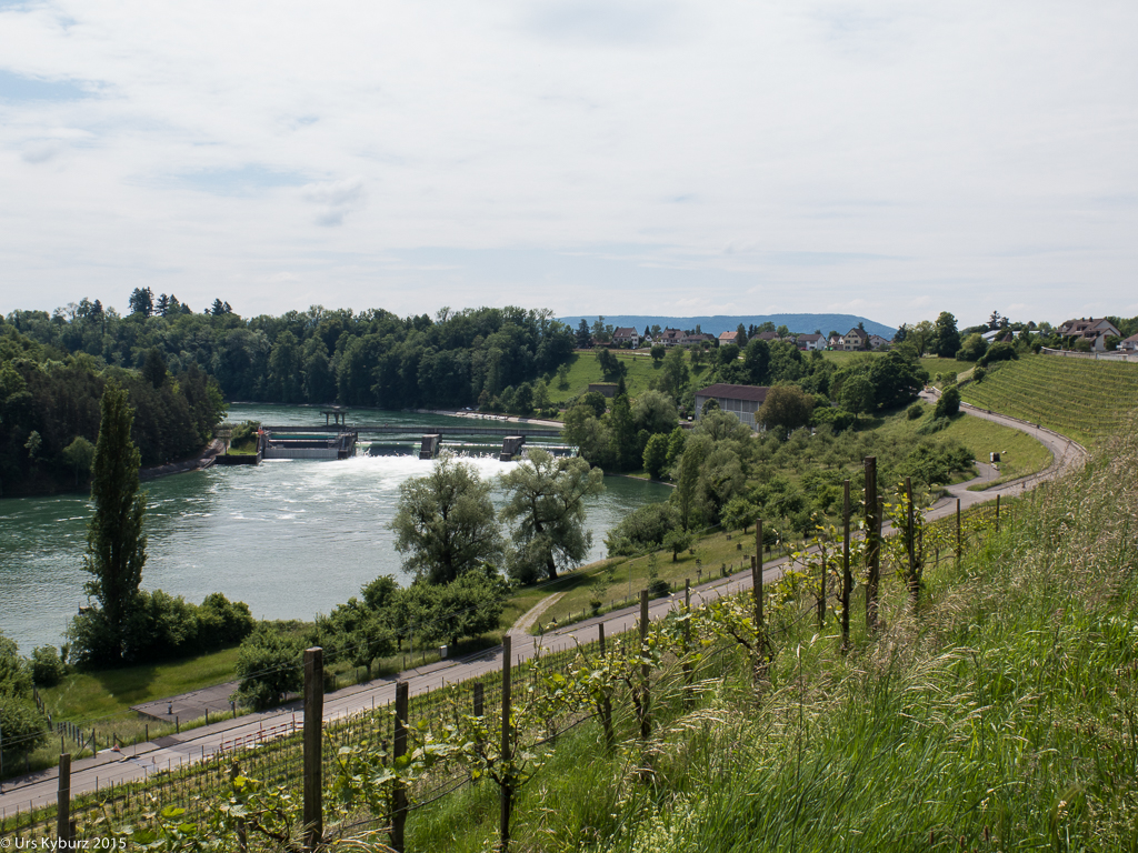 Kurz darauf überqueren wir den Rhein. Leider können wir nur ein kurzes Stück dem Fluss folgen, ein Velofahrverbot zwingt uns auf die Hauptstrasse. Und hätte ich die Karte nicht ebenfalls im Zelt liegen lassen, hätte ich gesehen, dass wir nur die Strasse überqueren müssten. Stattdessen fahren wir nun auf der Ausserortstrasse, die erst noch ansteigt. Wir fahren nun von oben her nach Rüdlingen, machen eine Schleife und unterqueren die Strasse, auf der wir soeben hochgefahren sind. Nun sind wir doch noch auf dem richtigen Weg. Gemütlich fahren wir auf einer asphaltierten Strasse, aber ohne Motorfahrzeugverkehr. Nach einem Parkplatz führt ein Weg zum Rhein hinunter. Abfahrt! Denn dort wartet schliesslich ein Singletrail. Aber der Weg ist unter Wasser, an ein Weiterkommen ist nicht zu denken. Und glaubt man dem Campingchef, wäre es noch ungemütlicher gekommen.