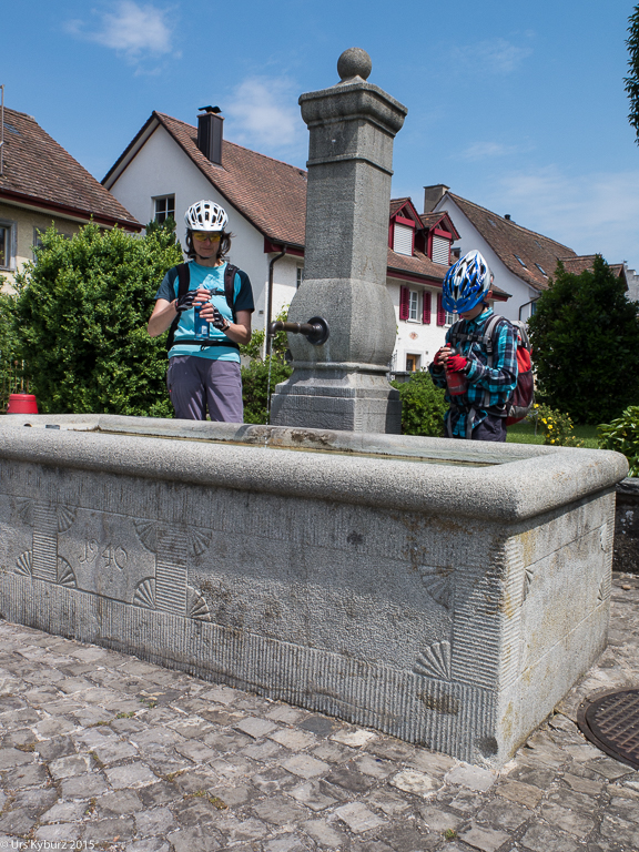 Wir kehren wieder auf die Strasse zurück und radeln gemütlich dahin. Aber endlich hat dieser Asphalt ein Ende, wir biegen in eine Waldstrasse ein. Und auf einmal biegt ein kleines Weglein ab. „Dürfen wir?“, fragen die Kinder erwartungsfroh. „OK, los!“. Und sie preschen davon, fliegen über den Singletrail. Ein Genuss, und nicht schwierig, ideal für Anfänger. Zwischendurch erhaschen wir einen Blick auf den Rhein und das Restaurant „zum Schiff“ in Ellikon auf der gegenüberliegenden Seite. Gleichzeitig sind wir hier auf der Grenze. Auf der einen Seite stehen wir im „Canton Schaffhausen“, auf der anderen im „Grossherzogtum Baden“, so die Beschriftung des Grenzsteins. Nach kurzer Fahrt erreichen wir eine schöne, grosse Wiese, die zum Rasten einlädt, da die Kinder bereits Hunger haben.