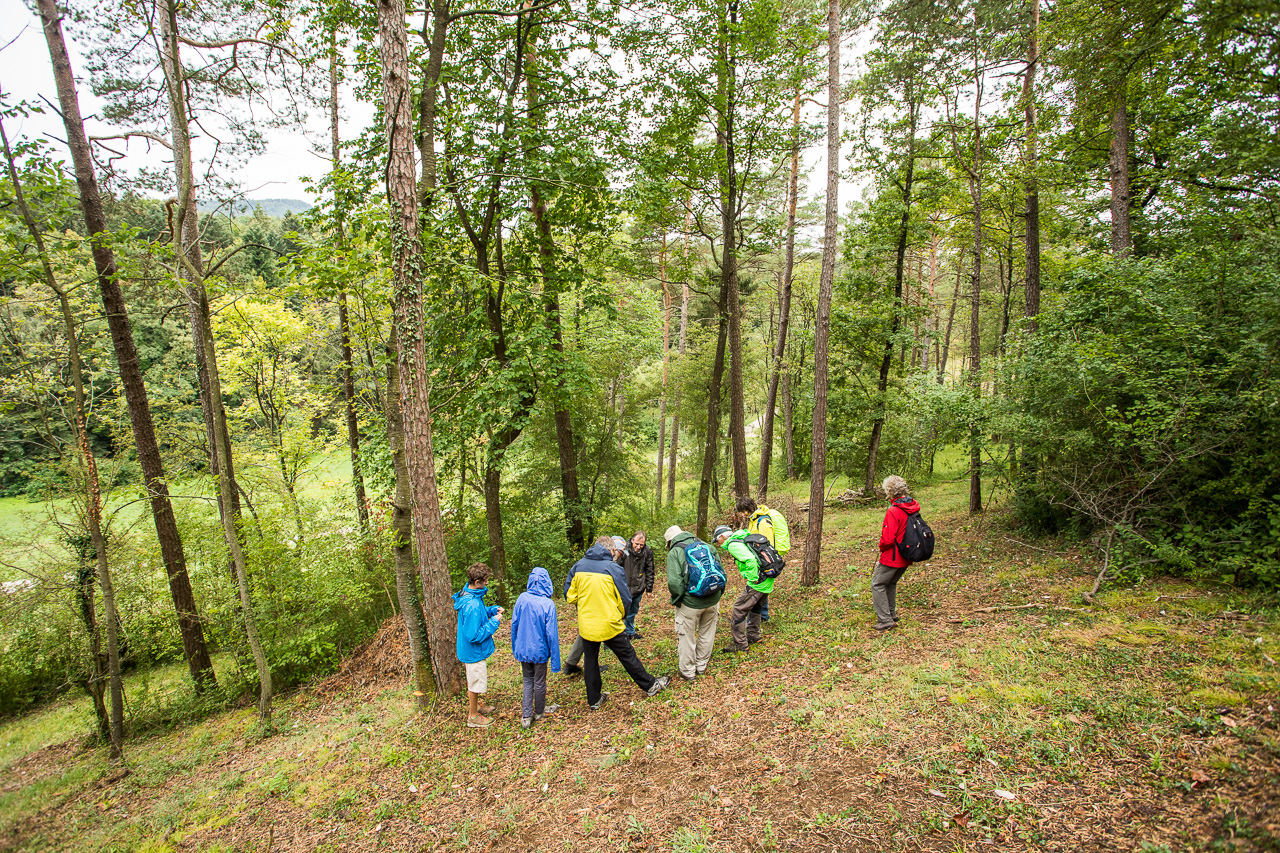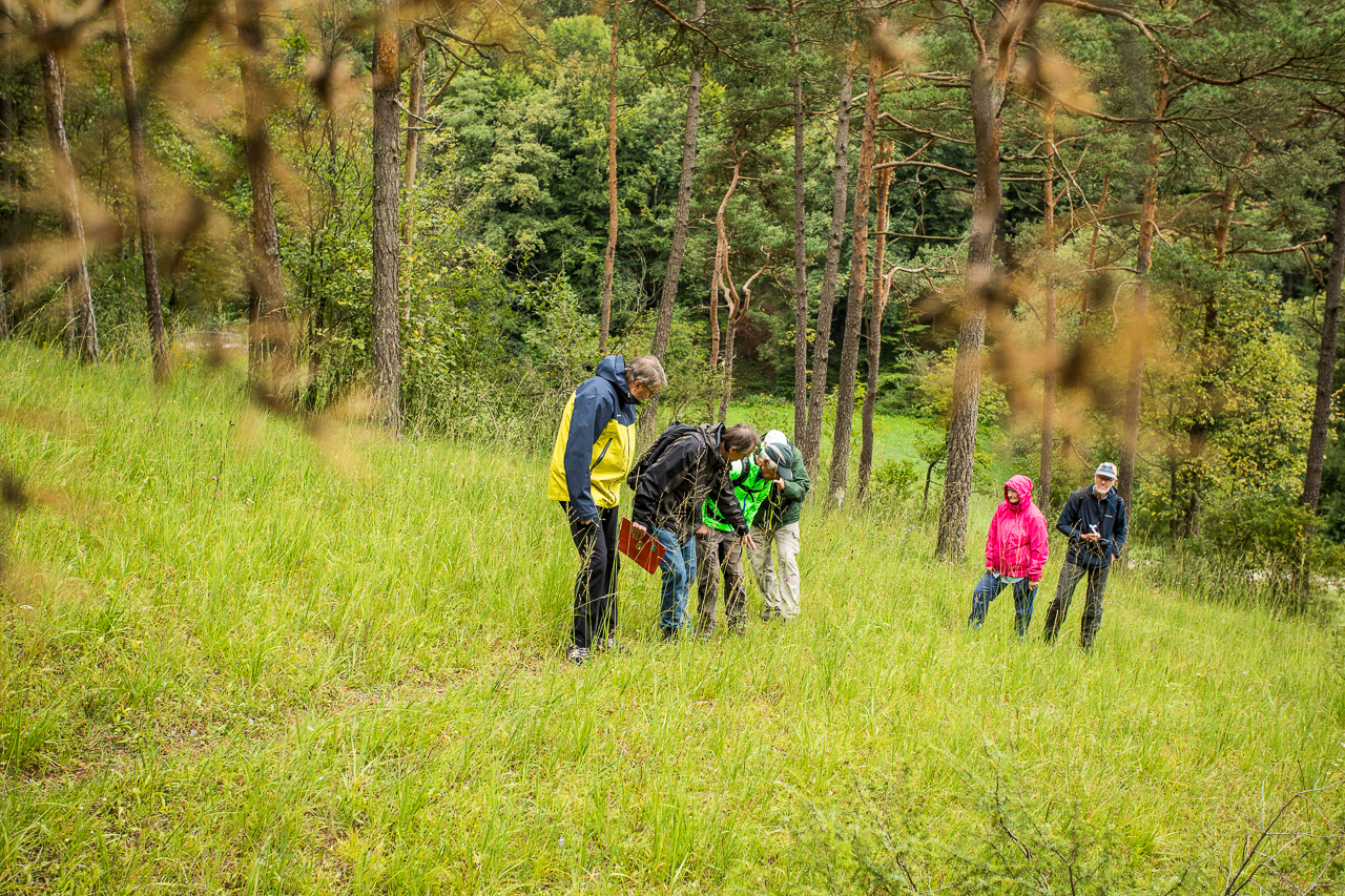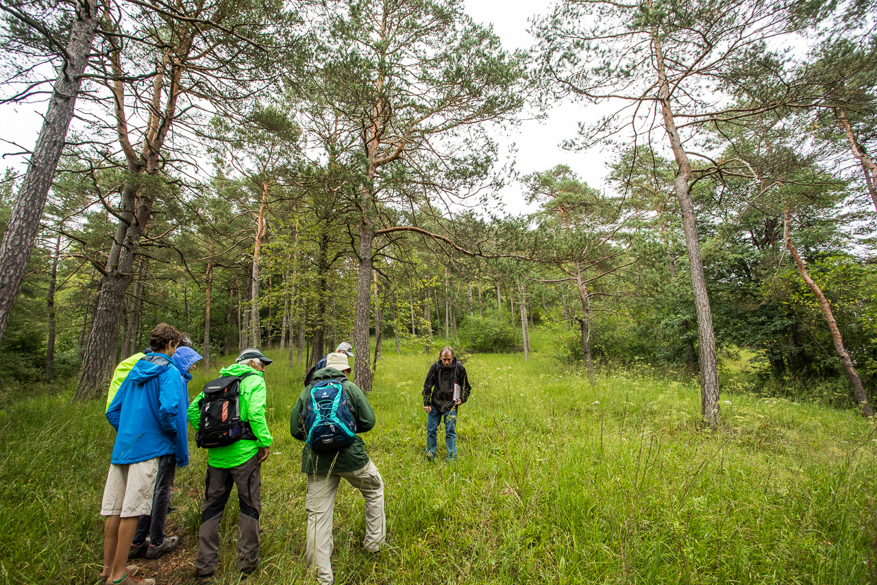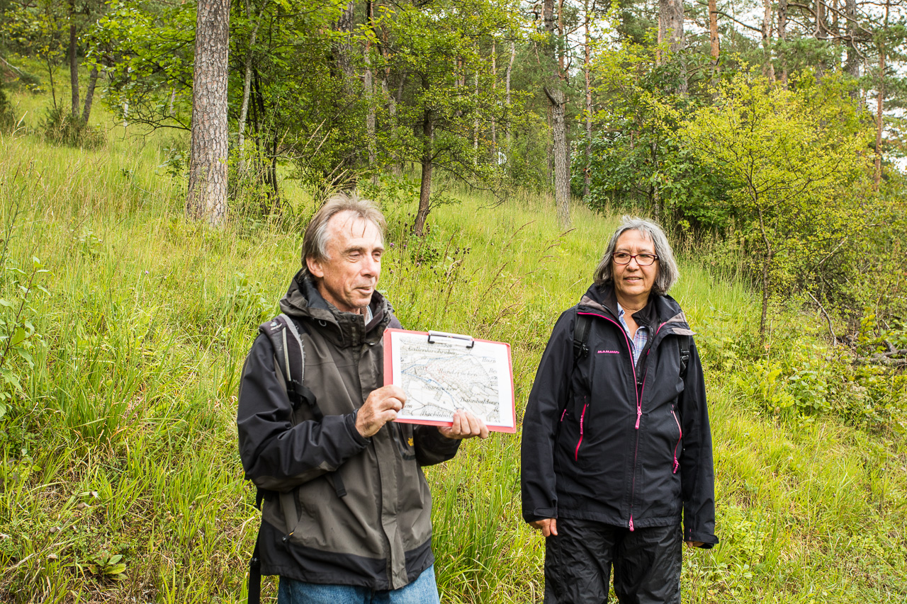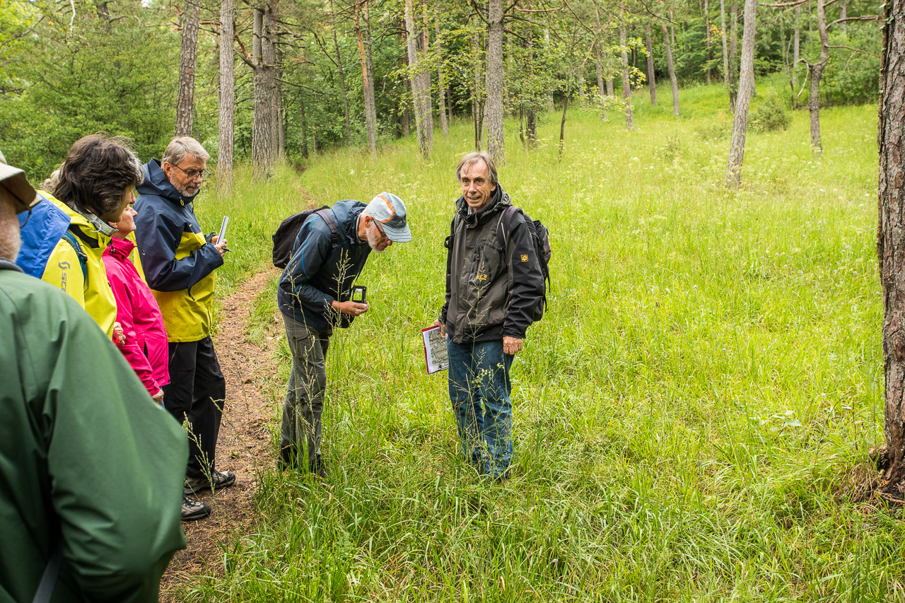 Herr Gasser zeigt uns anhand von Karten die Entwicklung des Gebietes in den letzten 150 Jahren. Ursprünglich war unterhalb des Föhrenwaldes ein Rebberg, bis die Reblaus den Reben den Garaus machte. Danach wurde es als Weidegebiet genutzt. Der Wald diente bis Ende des vorletzten Jahrhunderts als Waldweide, welche dann aber verboten wurden, um eine Übernutzung des Waldes zu verhindern. Das hatte zur Folge, dass der Wald dichter wurde, dadurch verschwanden viele lichtliebende Pflanzen. Dieser Wald hier konnte wieder ausgelichtet werden, damit diese Pflanzen wieder zurückkommen, darunter viele Orchideen. Allerdings muss die Wiese gemäht werden, da eine Beweidung immer noch verboten und nur mit einer Ausnahmegenehmigung möglich ist.