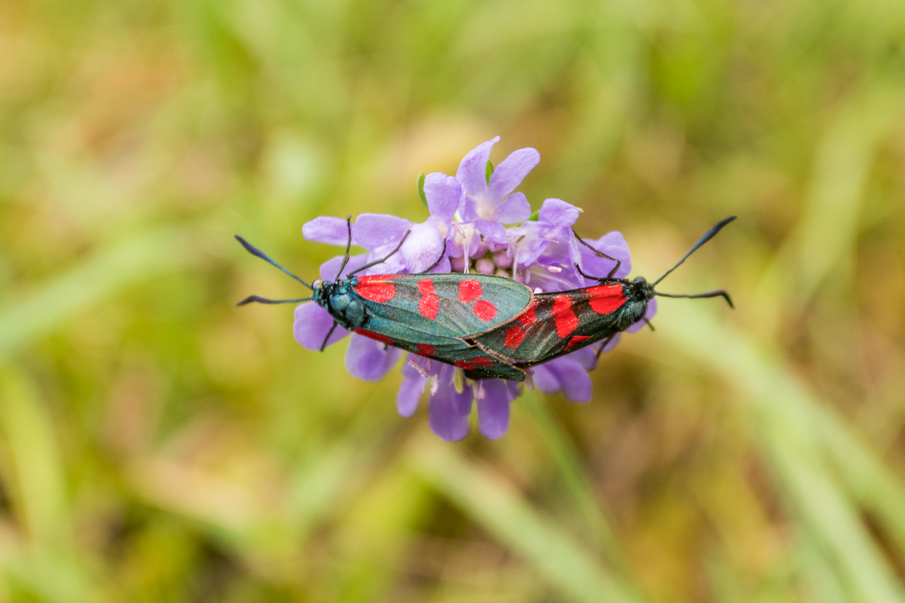 Herr Gasser zeigt uns noch eine Rarität, die hier wieder angesiedelt wird. Und dann weckt ein Baum unsere Aufmerksamkeit. Silvan fragt sich, was das wohl für einer ist. Die Blätter sind denen des Ahorns ähnlich, aber ein Ahorn ist es nicht. Kurz darauf klärt uns Herr Gasser auf: Es handelt sich um die Elsbeere, einen seltenen Baum. Er ist verwandt mit der Mehlbeere, deren Früchte früher dazu verwendet wurden, das Mehl zu strecken. Wir verlassen den Wald wieder, kommen auf die Wiese, die früher ein Rebberg war. Im Wald wurde der Oberboden und Mergel abgetragen, um damit die Rebberge fruchtbarer zu machen. Dies war die Chance für konkurrenzschwache Pflanzen, die wenig Nährstoff brauchen. Auf einer Skabiose paaren sich Blutströpfchen, Bläulinge hängen an den Gräsern und warten auf besseres Wetter.
