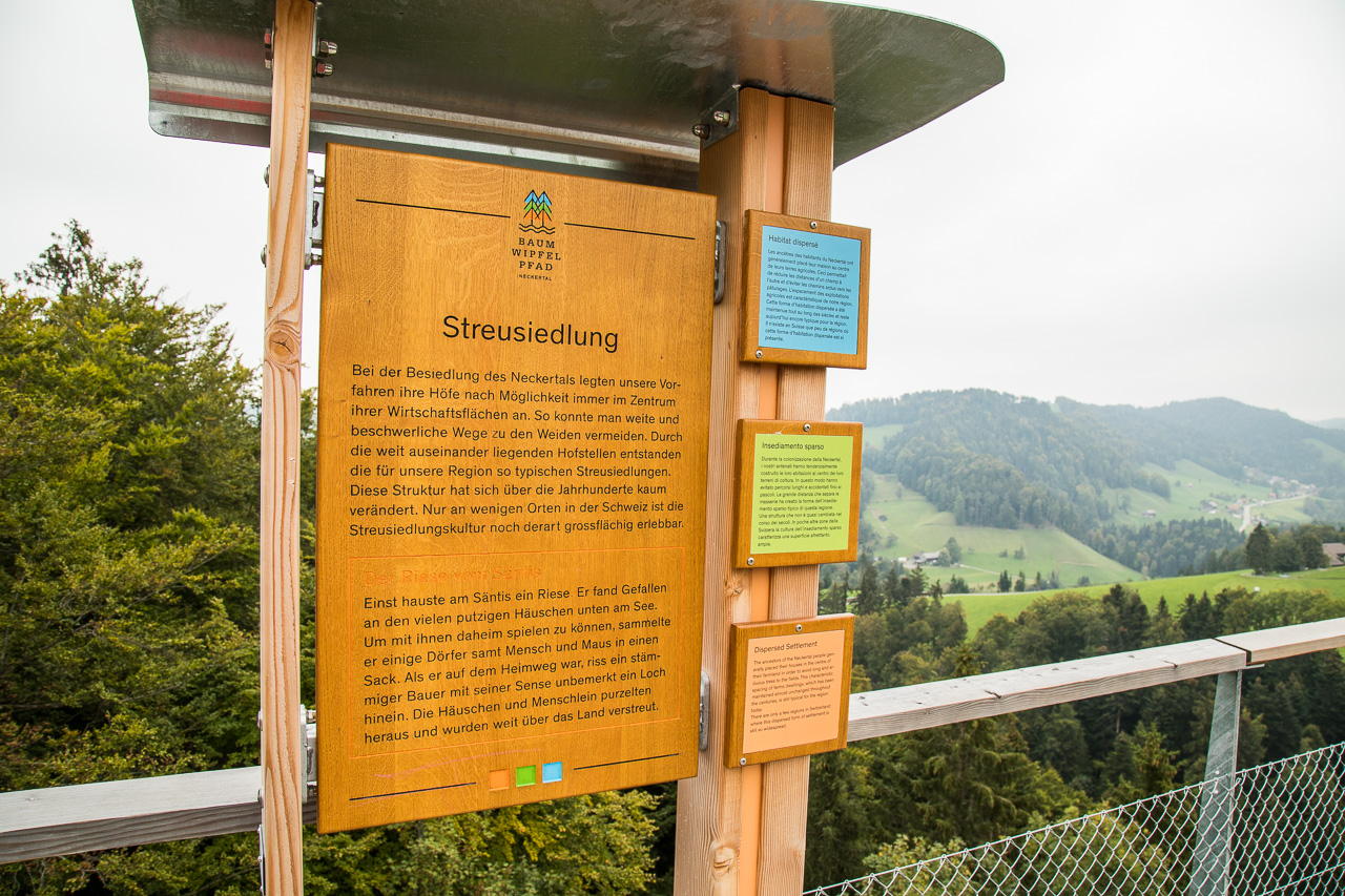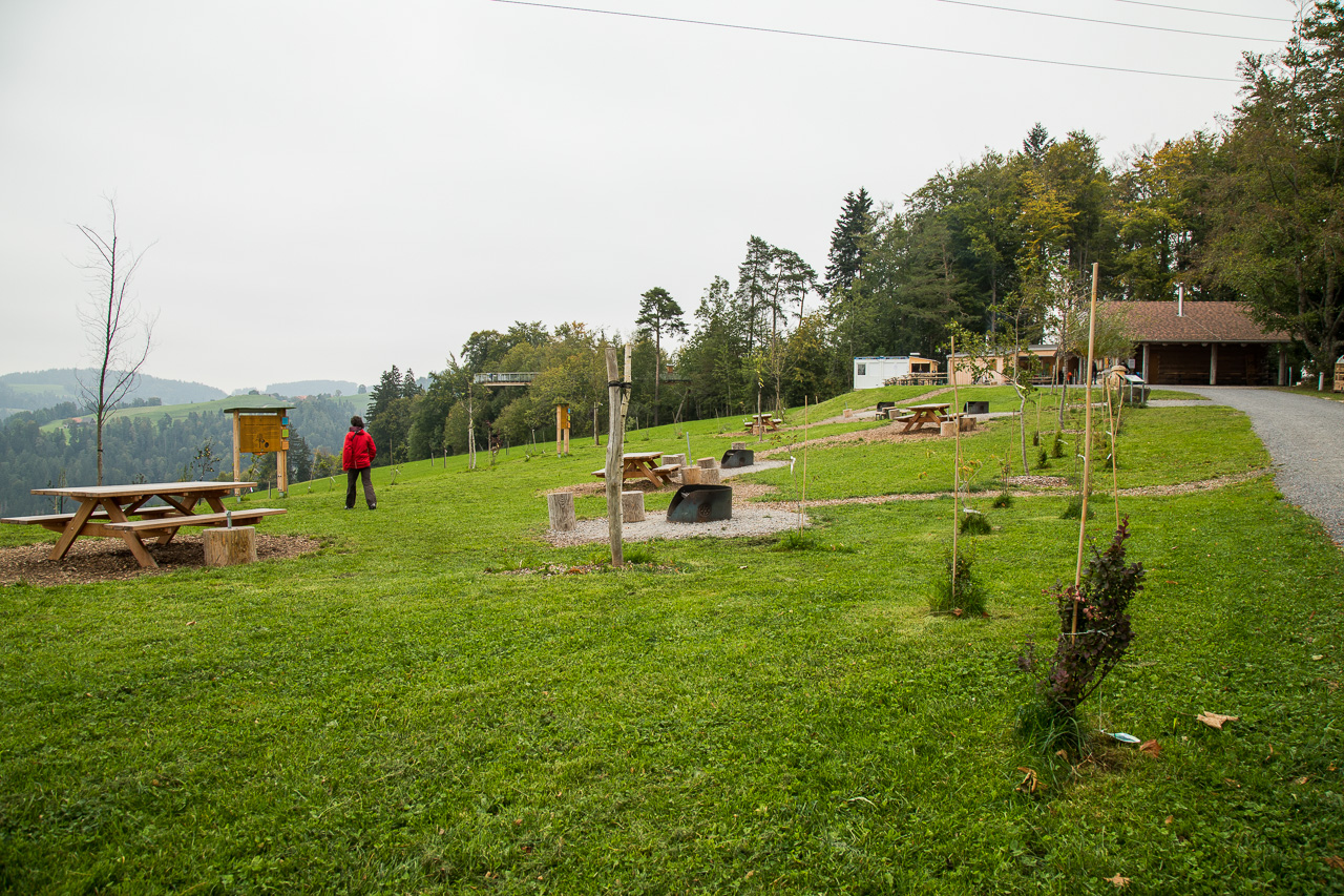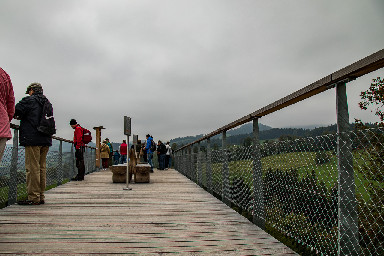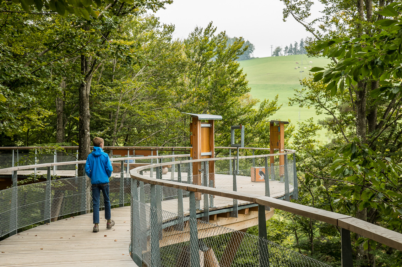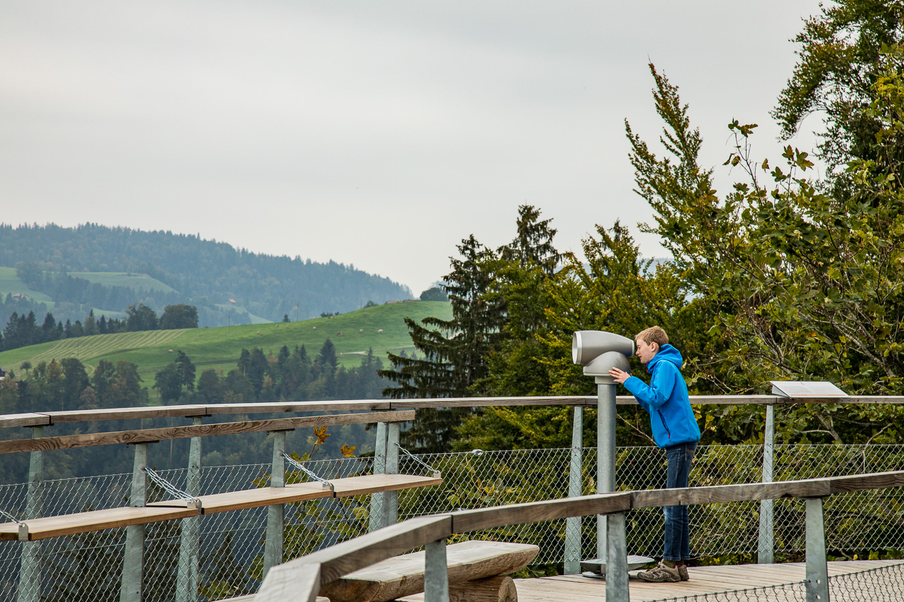 Die nordöstliche Ecke der Schweiz ist auf unserer Landkarte bis jetzt ein weisser Fleck. So sind wir denn auch überrascht, wie hügelig die Gegend hinter dem Zürichsee ist. Rauf, runter, rauf, runter, durch Täler und über Pässe. Zwischendurch zweifeln wir, ob wir noch auf dem richtigen Weg sind. Aber dann finden wir dieses Mogelsberg doch noch, ein kleines Dorf in den Hügeln des Neckertals. Der Baumwipfelpfad scheint ja ein wahrer Publikumsmagnet zu sein, der Parkplatz ist fast voll und Ordnungspersonal weist die Fahrzeuge ein. Positiv ist, dass man nicht direkt vor dem Eingang parkieren kann, sondern zuerst einige hundert Meter gehen muss.