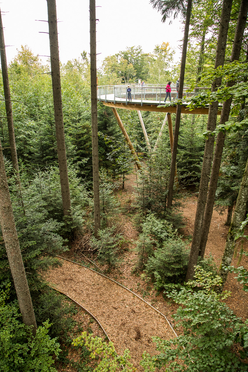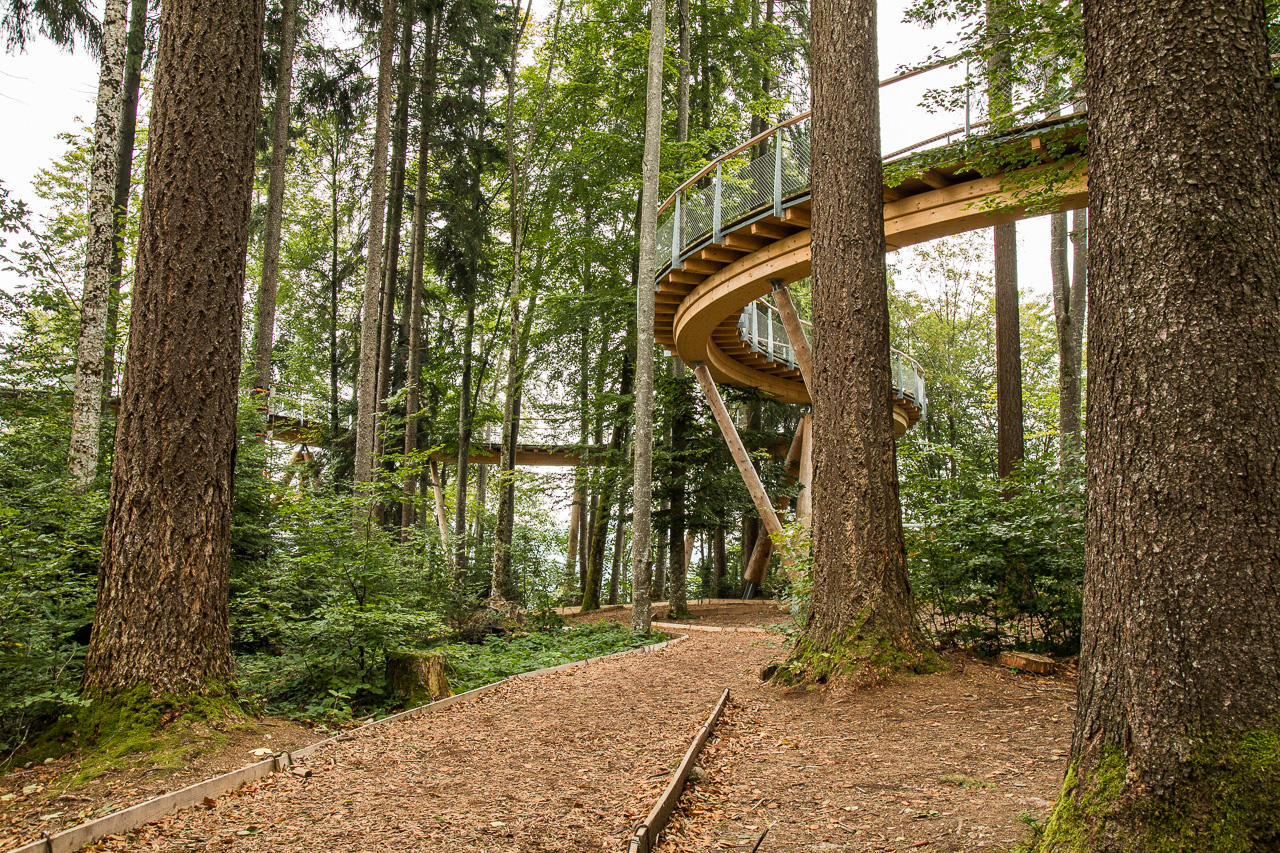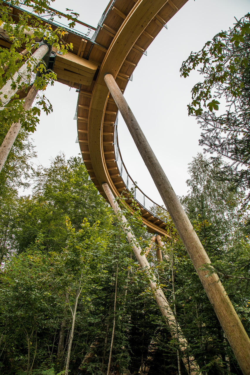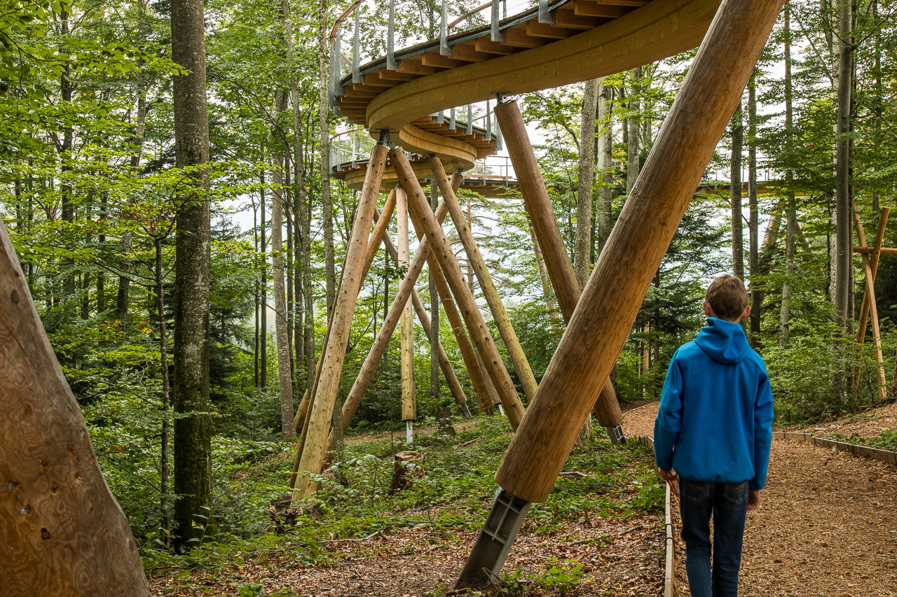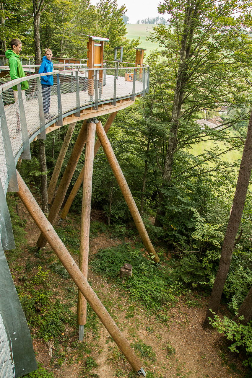 Die nordöstliche Ecke der Schweiz ist auf unserer Landkarte bis jetzt ein weisser Fleck. So sind wir denn auch überrascht, wie hügelig die Gegend hinter dem Zürichsee ist. Rauf, runter, rauf, runter, durch Täler und über Pässe. Zwischendurch zweifeln wir, ob wir noch auf dem richtigen Weg sind. Aber dann finden wir dieses Mogelsberg doch noch, ein kleines Dorf in den Hügeln des Neckertals. Der Baumwipfelpfad scheint ja ein wahrer Publikumsmagnet zu sein, der Parkplatz ist fast voll und Ordnungspersonal weist die Fahrzeuge ein. Positiv ist, dass man nicht direkt vor dem Eingang parkieren kann, sondern zuerst einige hundert Meter gehen muss.