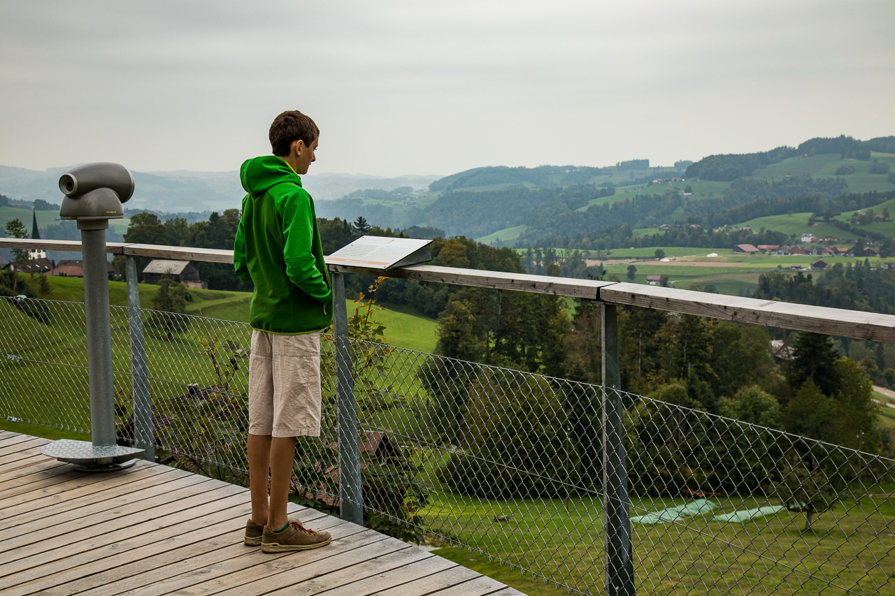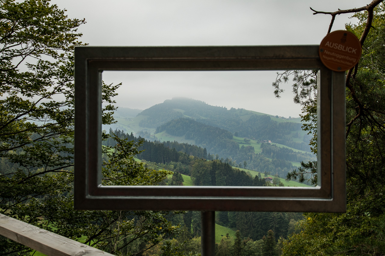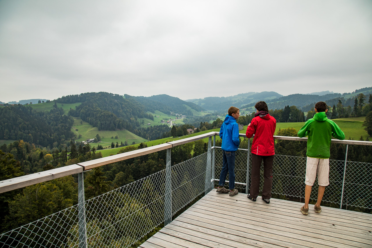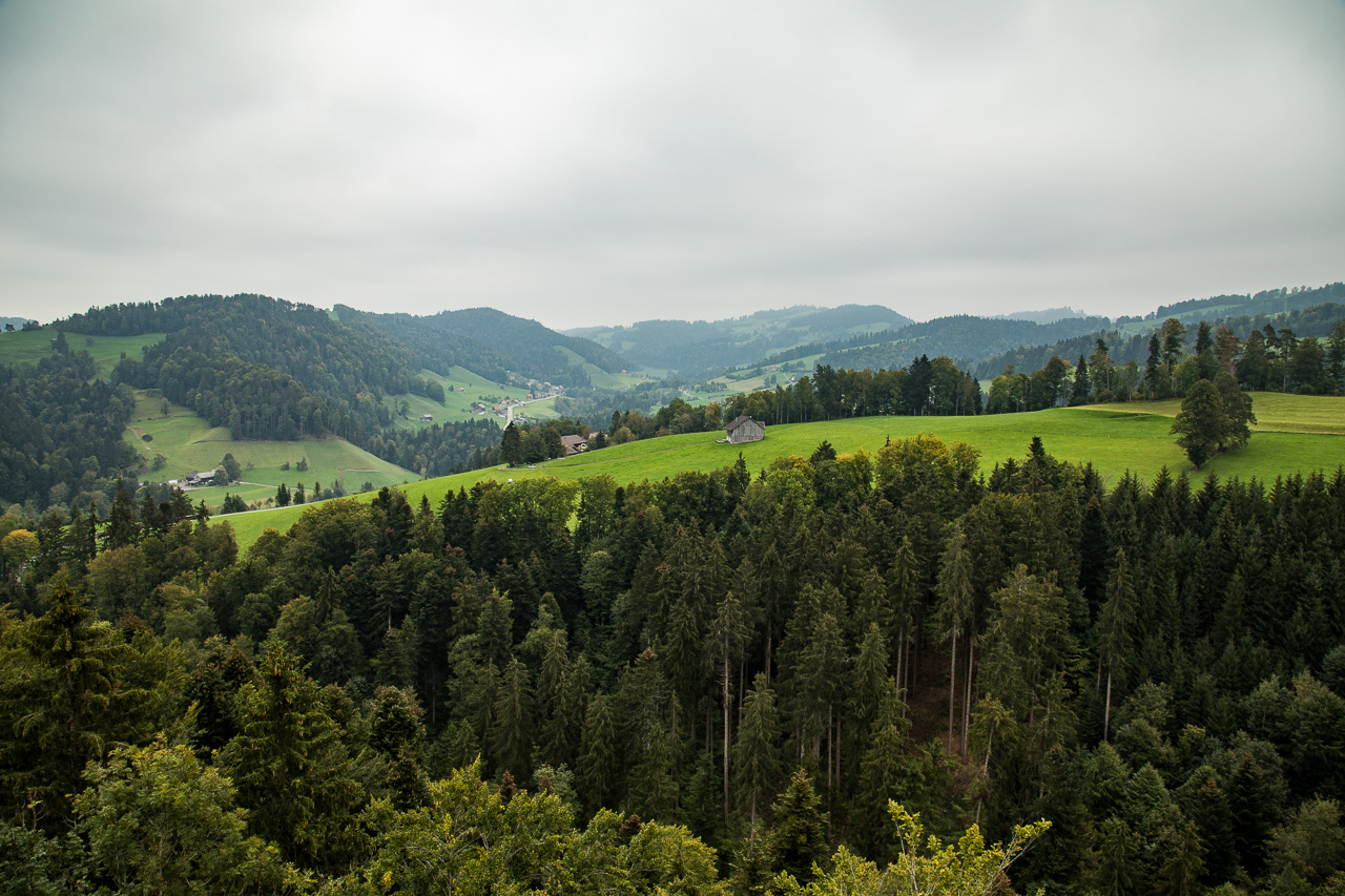 Eine Abzweigung führt hinaus zu einer Aussichtskanzel, die den Blick auf die offene Hügellandschaft des unteren Toggenburges ermöglicht. Kühe grasen, das Bimmeln der Glocken ist bis hier hinauf zu hören, Bauernhöfe liegen verstreut in der Landschaft, die der Sage nach dem Riesen vom Säntis aus einem Sack gefallen sein sollen.