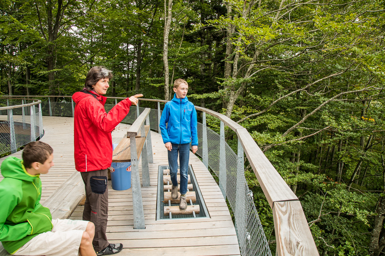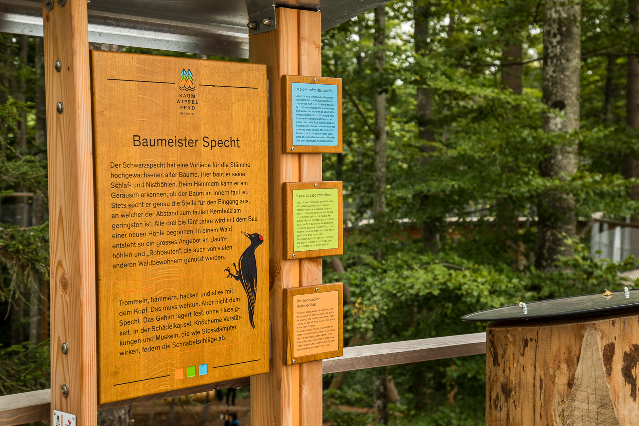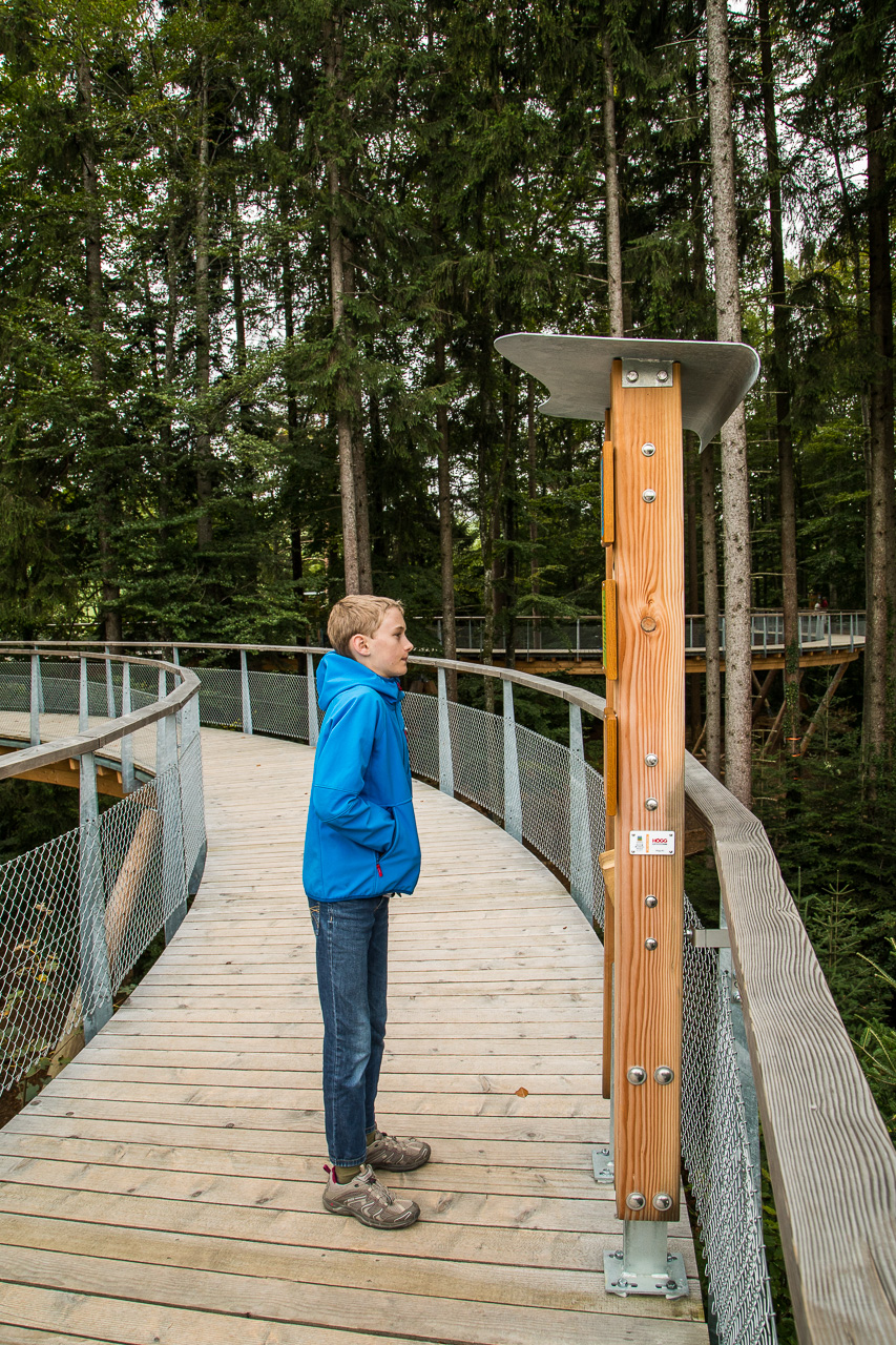 40 Franken kostet der Eintritt für eine Familie. Wir blättern die hin und begeben uns auf den Trail. Es handelt sich nicht um schmale, wacklige Hängebrücken hoch oben zwischen den Bäumen, sondern um einen breiten, rollstuhl- und kinderwagengängigen Holzweg, der auf Pfeilern abgestützt ist. Tafeln vermitteln uns viel Wissenswertes über den Wald und seine Bewohner. Oder hast du gewusst, dass…