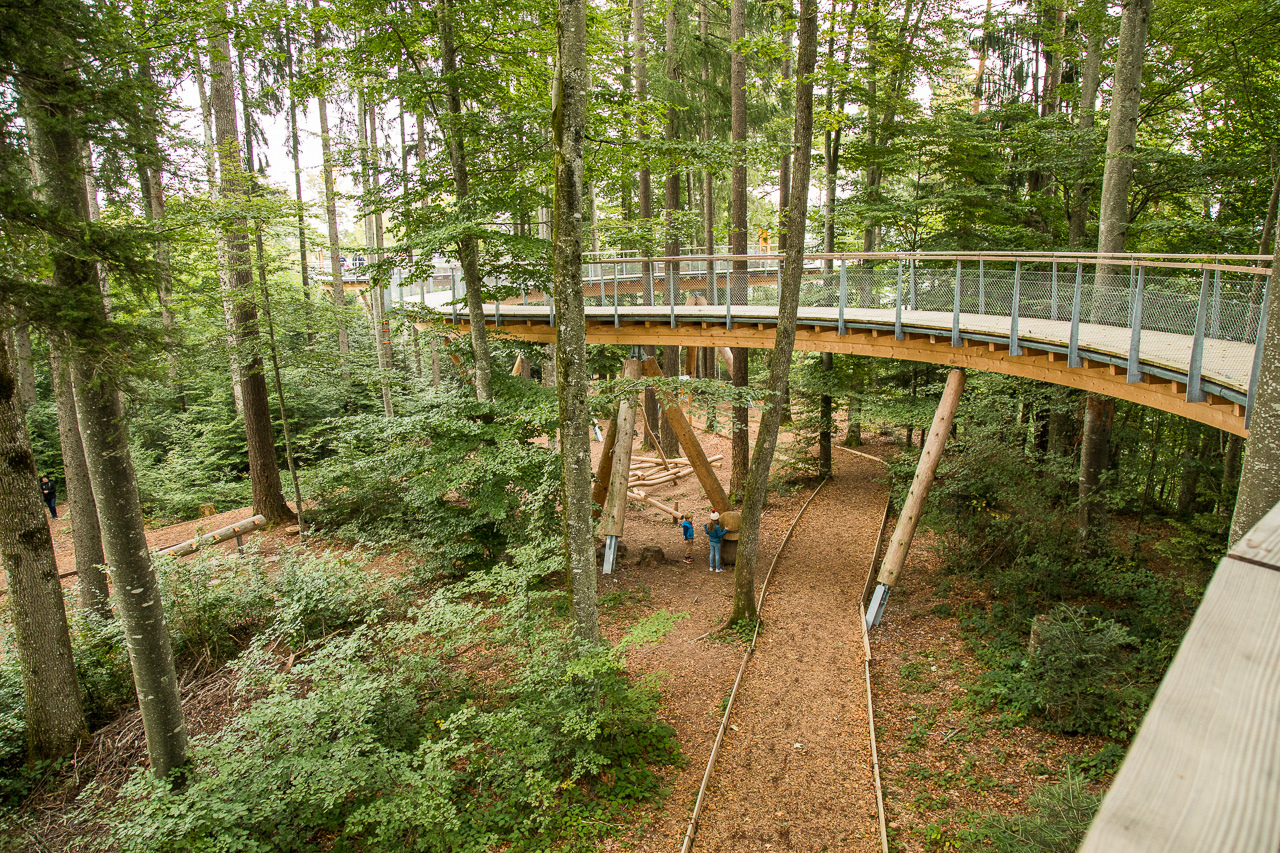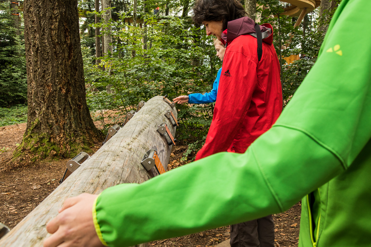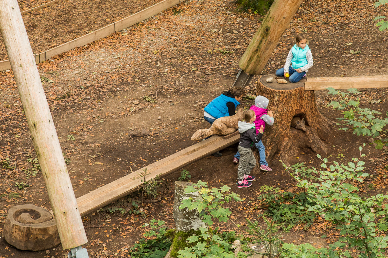 Gemütlich schlendern wir von Tafel zu Tafel, geniessen den Ausblick von oben auf das Geschehen am Waldboden. Dort sind nämlich zahlreiche Spielgeräte installiert, die rege von den Kindern benutzt werden.
