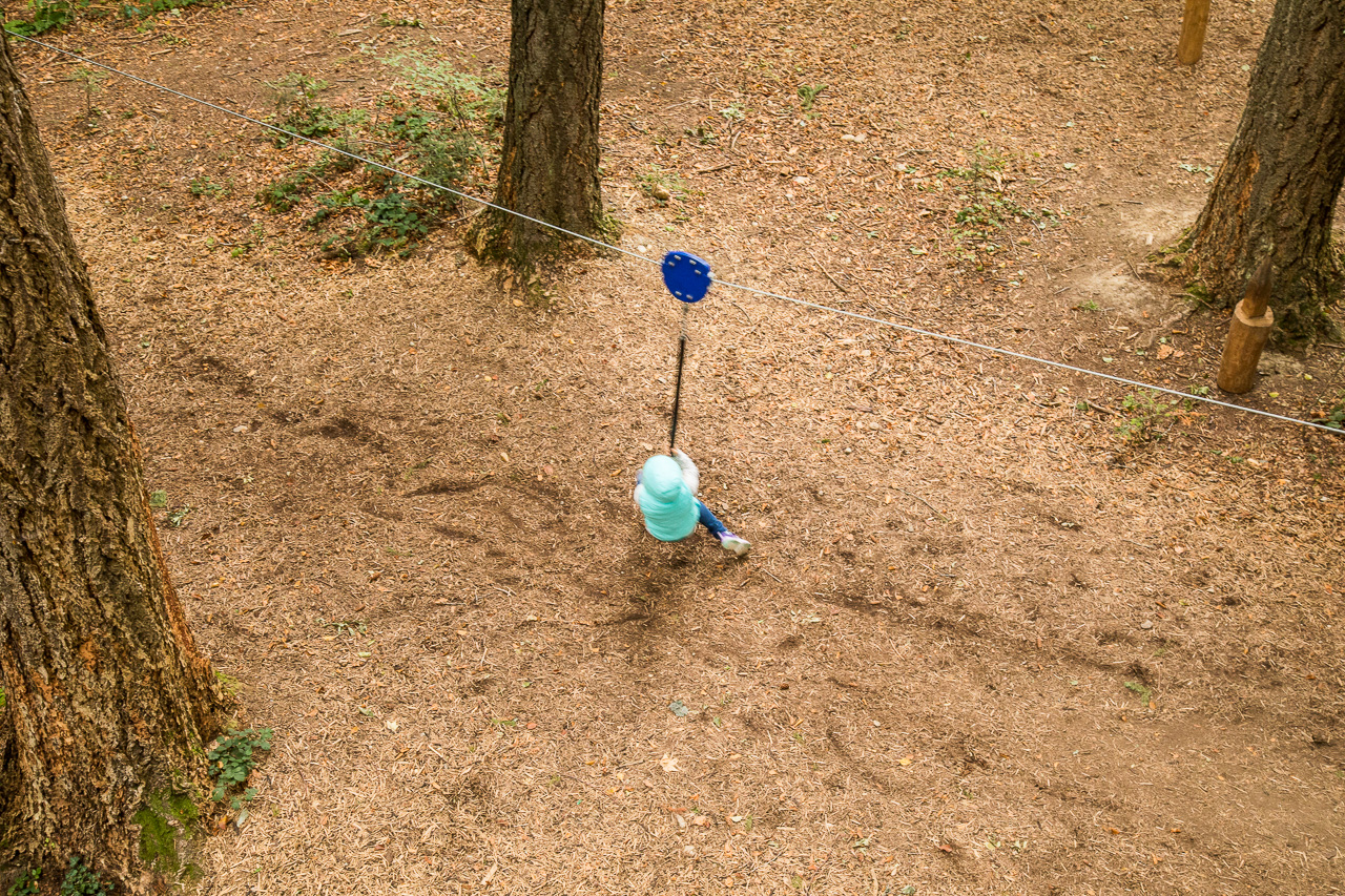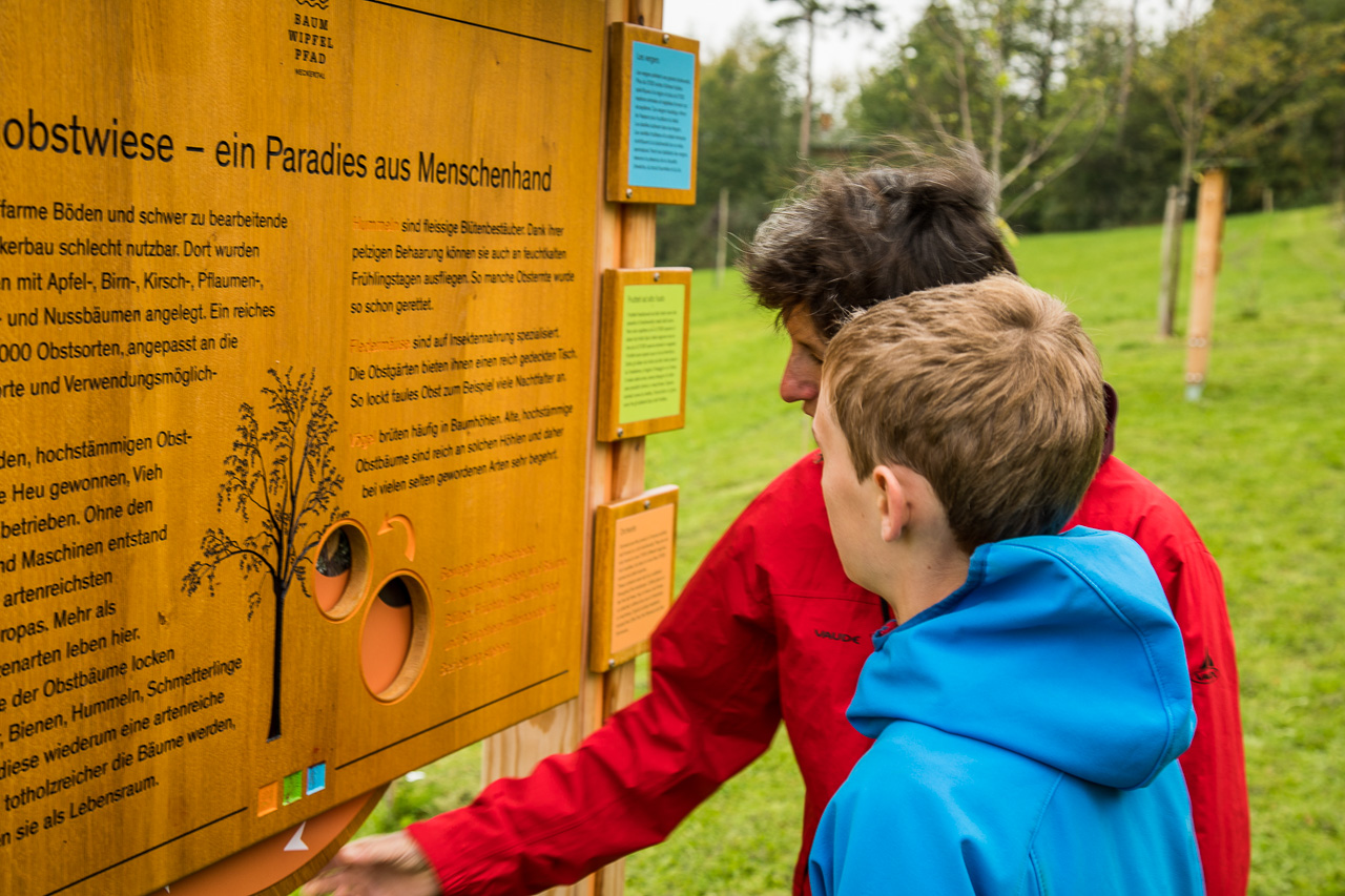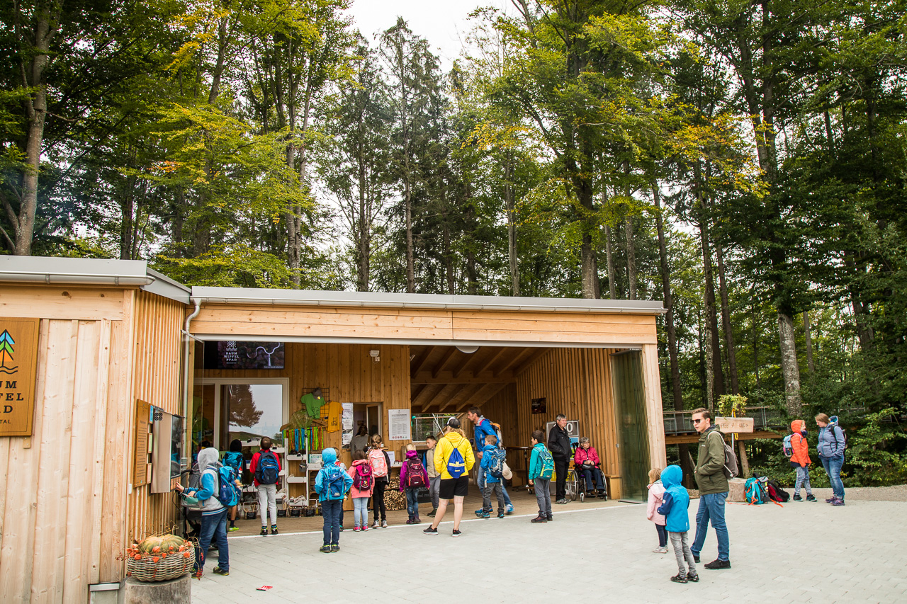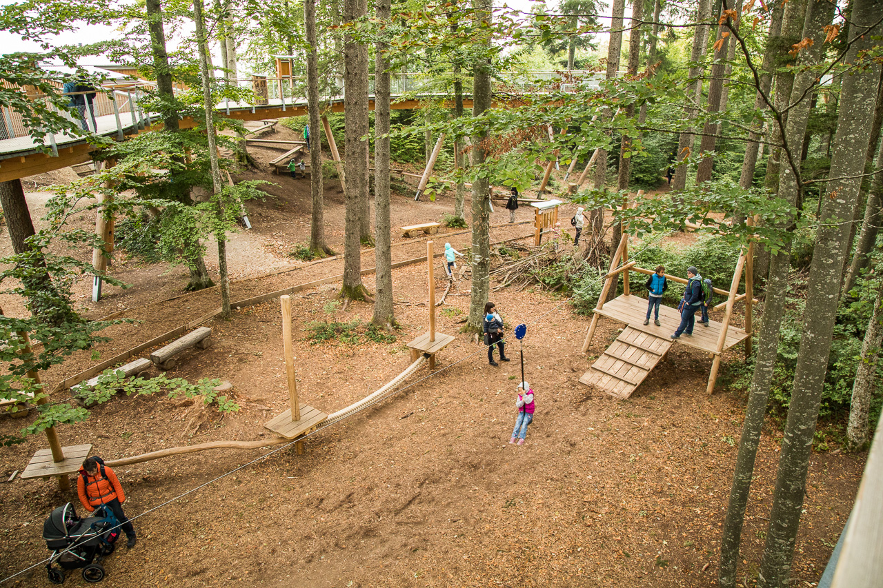 Gemütlich schlendern wir von Tafel zu Tafel, geniessen den Ausblick von oben auf das Geschehen am Waldboden. Dort sind nämlich zahlreiche Spielgeräte installiert, die rege von den Kindern benutzt werden.