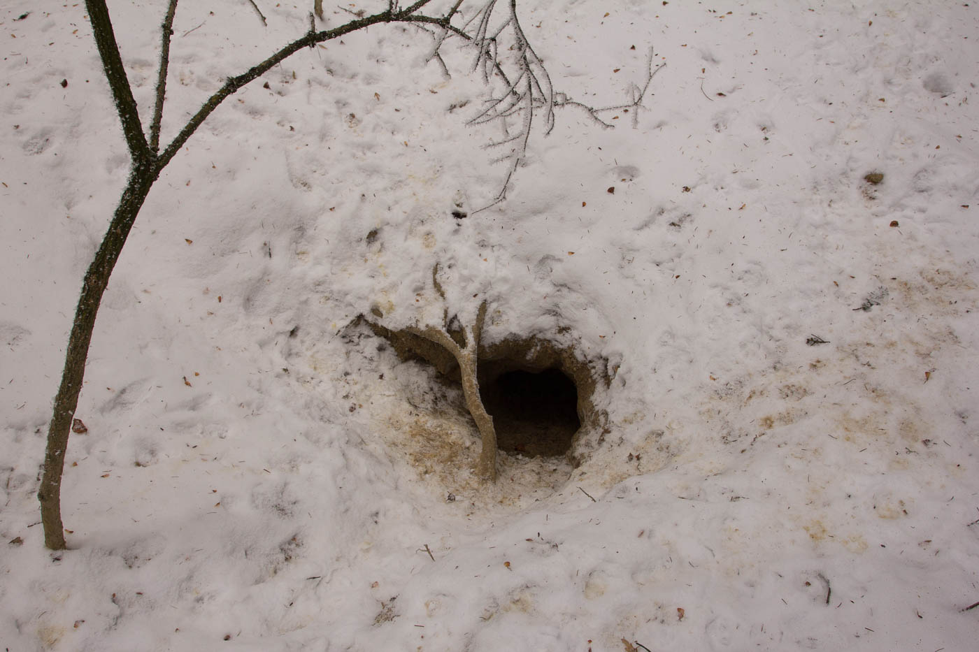 Mit der Aussicht auf Spurensuche konnten wir auch unsere Kinder wieder mal in den Wald locken. Wir wussten, wo einer war, aber nicht, ob er wirklich noch bewohnt war. Wir gingen querwaldein zu besagtem Ort, wo wir denn auch prompt Spuren vorfanden, der Bau war eindeutig noch bewohnt. Viele Pfotenspuren führten in die und aus den verschiedenen Höhleneingängen.