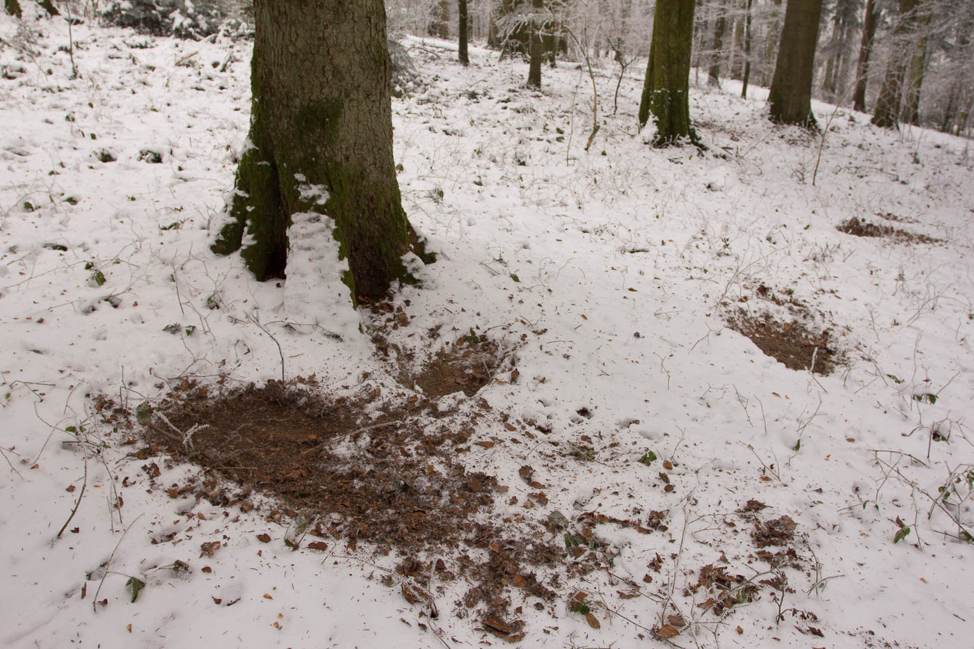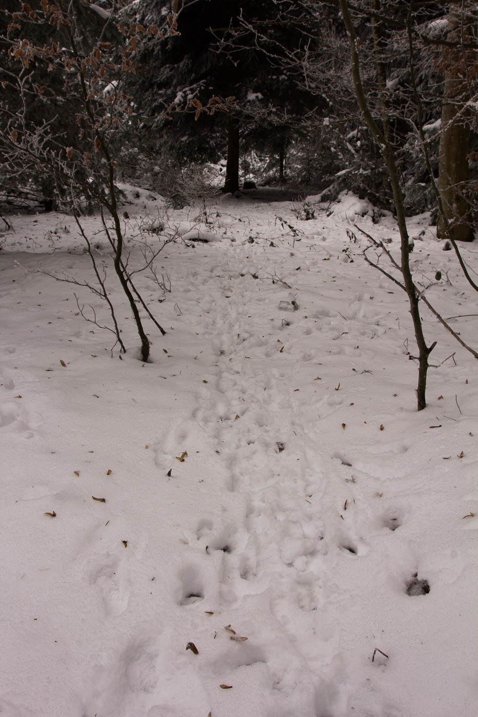 Auch wenn man nicht immer ein Reh sieht im Wald, im Schnee sieht man zumindest ihre Spuren. Wie der Mensch nutzt auch das Reh die immer gleichen Wege, so dass regelrechte Pfade, die Wildwechsel entstehen. Ab und zu trifft man auf freigescharrte Plätze. Dabei handelt es sich um Rehschlafplätze, sie scharren zuerst den Schnee weg, bevor sie sich hinlegen.