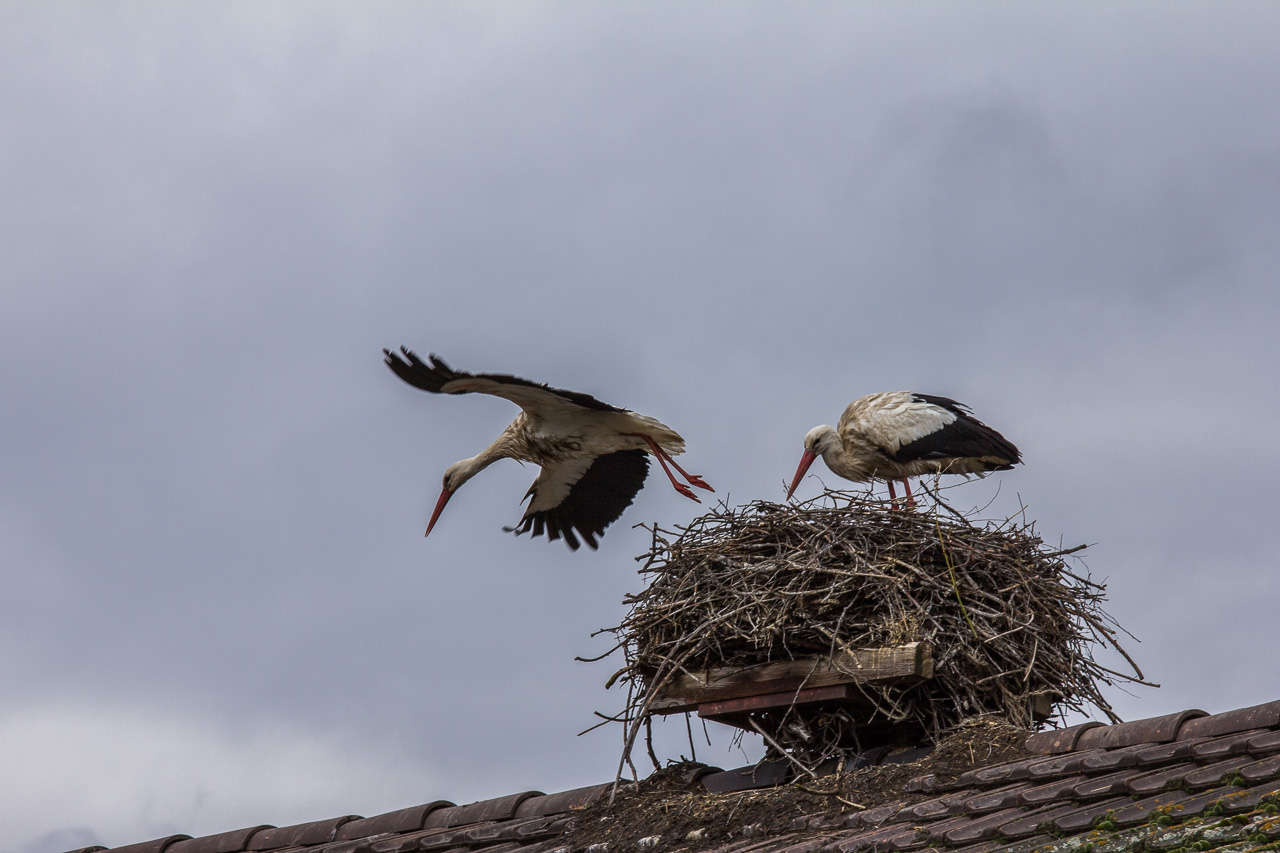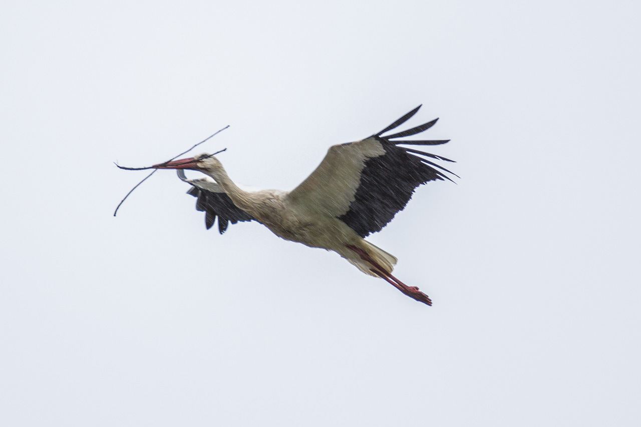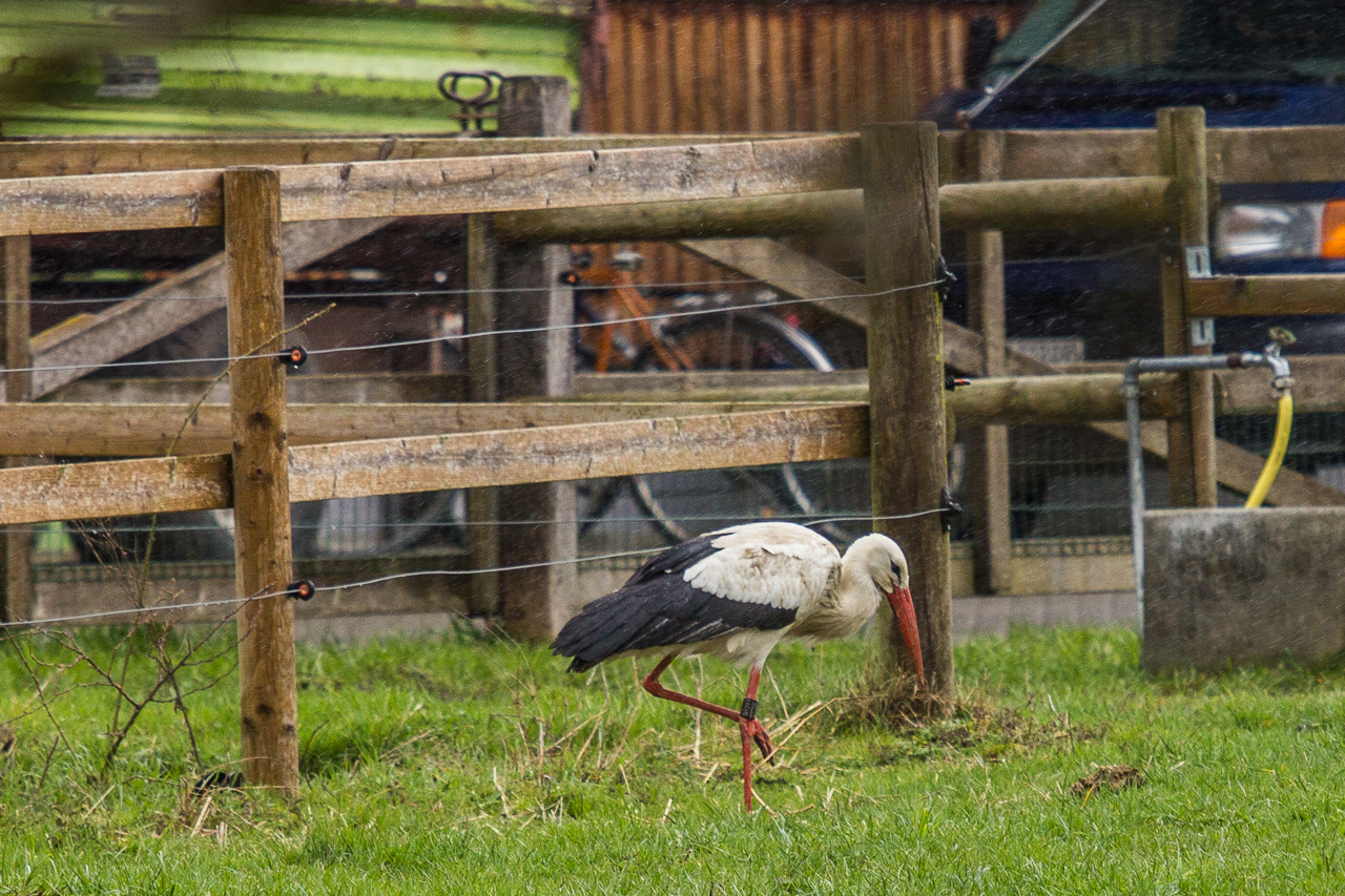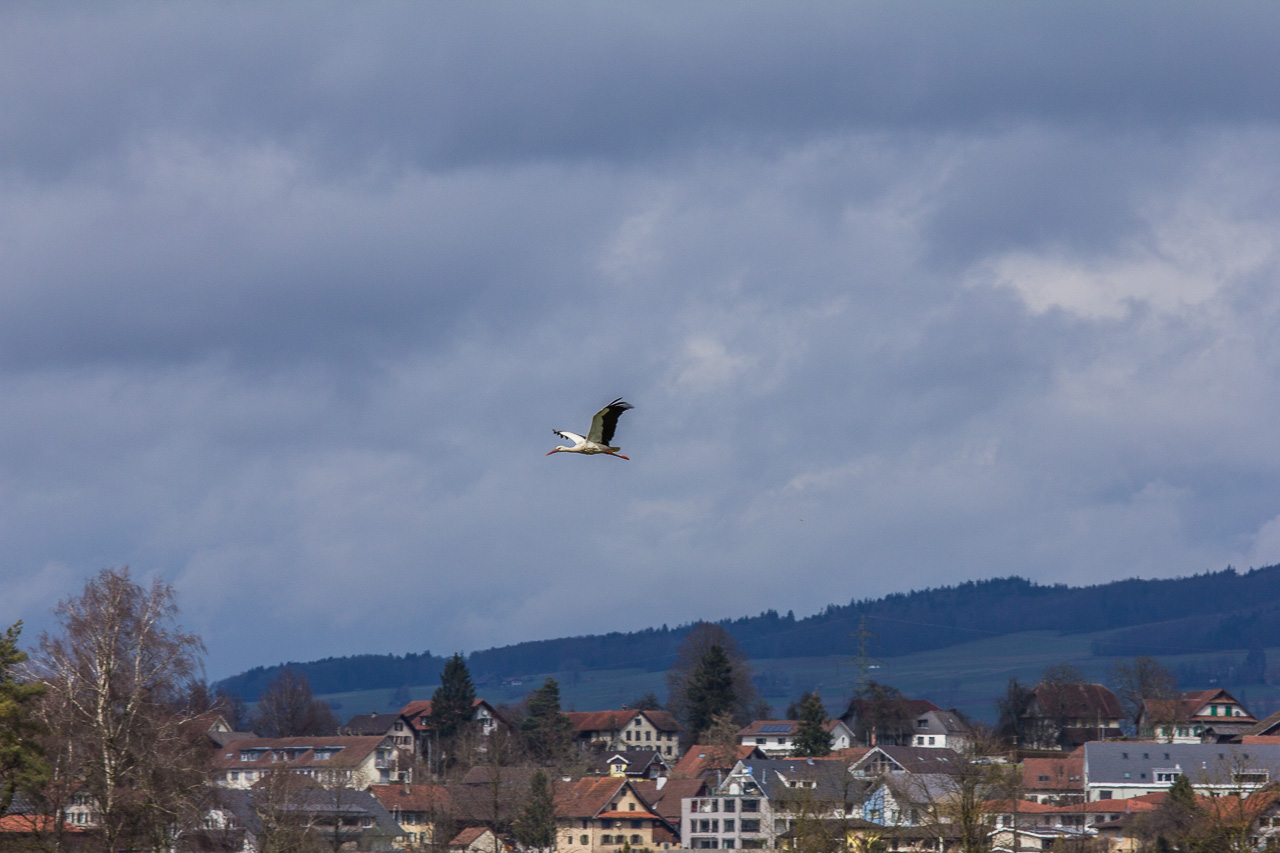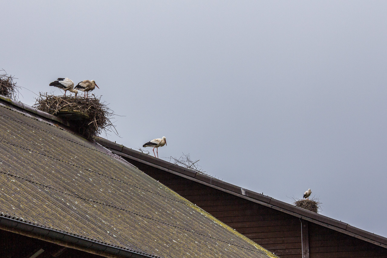 Trotz Regen gehen wir weiter, überall fliegen, schreiten und nisten Störche. Das Murimoos beherbergt die zweitgrösste Storchenkolonie der Schweiz nach jener von Altreu bei Solothurn. Zum Glück werden die Spielhäuser auch ausgestellt, so können wir dort vor dem Regen Zuflucht suchen und die Störche beobachten. Auf den Bäumen und auf den Ökonomiegebäuden reiht sich Horst an Horst. Wir durchqueren den Betrieb, Rinderställe, Schafställe und Schweineställe können besichtigt werden. Ein Hide ermöglicht den Blick auf eine Sumpffläche, wo Störche nach Nahrung stochern.